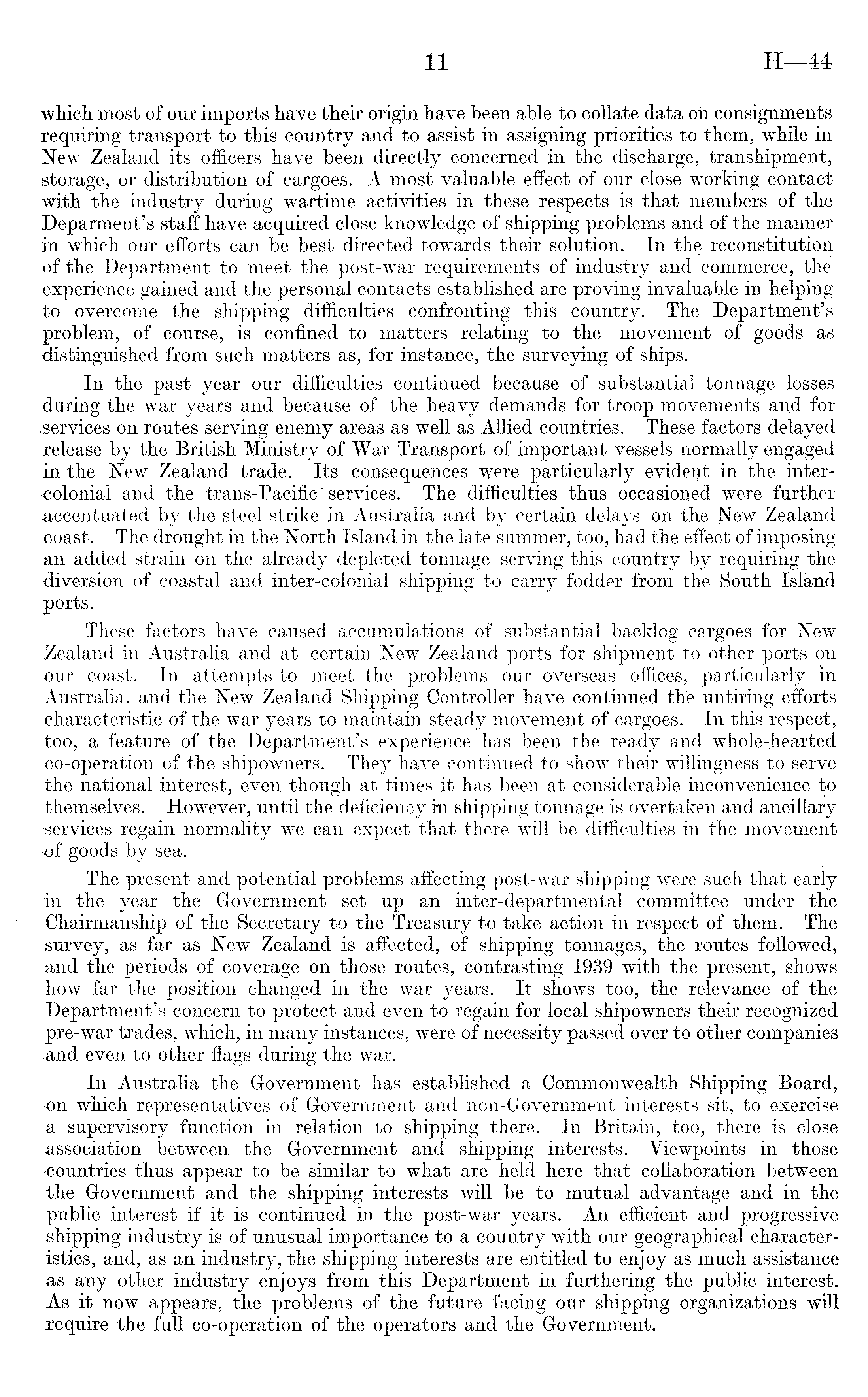 which most of our imports have their origin have been able to collate data on consignments requiring transport to this country and to assist in assigning priorities to them, while in New Zealand its officers have been directly concerned in the discharge, transhipment, -storage, or distribution of cargoes. A most valuable effect of our close working contact with the industry during wartime activities in these respects is that members of the Deparment's staff have acquired close knowledge of shipping problems and of the manner in which our efforts can be best directed towards their solution. In the reconstitution of the Department to meet the post-war requirements of industry and commerce, the •experience gained and the personal contacts established are proving invaluable in helping to overcome the shipping difficulties confronting this country. The Department's problem, of course, is confined to matters relating to the movement of goods as •distinguished from such matters as, for instance, the surveying of ships. In the past year our difficulties continued because of substantial tonnage losses •during the war years and because of the heavy demands for troop movements and for services on routes serving enemy areas as well as Allied countries. These factors delayed release by the British Ministry of War Transport of important vessels normally engaged in the New Zealand trade. Its consequences were particularly evident in the intercolonial and the trans-Pacific' services. The difficulties thus occasioned were further accentuated by the steel strike in Australia and by certain delays on the New Zealand coast. The drought in the North Island in the late summer, too, had the effect of imposing an added strain on the already depleted tonnage serving this country by requiring the diversion of coastal and inter-colonial shipping to carry fodder from the South Island ports. These factors have caused accumulations of substantial backlog cargoes for New Zealand in Australia and at certain New Zealand ports for shipment to other ports on our coast. In attempts to meet the problems our overseas ■ offices, particularly in Australia, and the New Zealand Shipping Controller have continued the untiring efforts ■characteristic of the war years to maintain steady movement of cargoes. In this respect, too, a feature of the Department's experience has been the ready and whole-hearted •co-operation of the shipowners. They have continued to show their willingness to serve the national interest, even though at times it has been at considerable inconvenience to themselves. However, until the deficiency in shipping tonnage is overtaken and ancillary services regain normality we can expect that there will be difficulties in the movement of goods by sea. The present and potential problems affecting post-war shipping were such that early in the year the Government set up an inter-departmental committee under the Chairmanship of the Secretary to the Treasury to take action in respect of them. The survey, as far as New Zealand is affected, of shipping tonnages, the routes followed, and the periods of coverage on those routes, contrasting 1939 with the present, shows how far the position changed in the war years. It shows too, the relevance of the Department's concern to protect and even to regain for local shipowners their recognized pre-war trades, which, in many instances, were of necessity passed over to other companies .and even to other flags during the war. In Australia the Government has established a Commonwealth Shipping Board, on which representatives of Government and non-Government interests sit, to exercise a supervisory function in relation to shipping there. In Britain, too, there is close association between the Government and shipping interests. Viewpoints in those countries thus appear to be similar to what are held here that collaboration between the Government and the shipping interests will be to mutual advantage and in the public interest if it is continued in the post-war years. An efficient and progressive shipping industry is of unusual importance to a country with our geographical characteristics, and, as an industry, the shipping interests are entitled to enjoy as much assistance as any other industry enjoys from this Department in furthering the public interest. As it now appears, the problems of the future facing our shipping organizations will require the full co-operation of the operators and the Government.