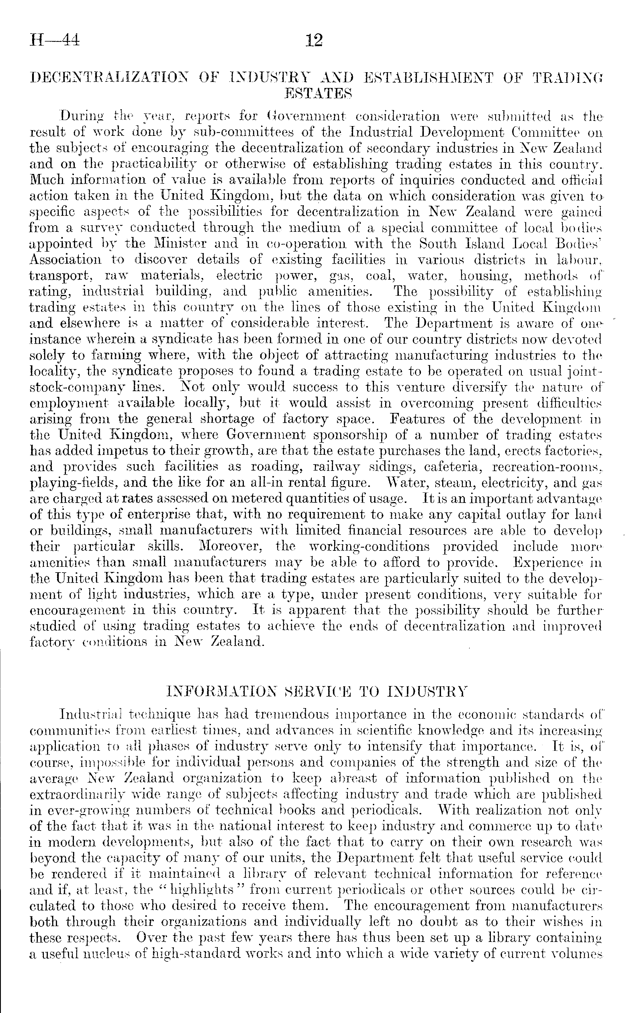 DECENTRALIZATION OF INDUSTRY AND ESTABLISHMENT OF TRADING ESTATES During the year, reports for Government consideration were submitted as the result of work done by sub-committees of the Industrial Development Committee on the subjects of encouraging the decentralization of secondary industries in New Zealand and on the practicability or otherwise of establishing trading estates in this country. Much information of value is available from reports of inquiries conducted and official action taken in the United Kingdom, but the data on which consideration was given to specific aspects of the possibilities for decentralization in New Zealand were gained from a survey conducted through the medium of a special committee of local bodies appointed by the Minister and in co-operation with the South Island Local Bodies' Association to discover details of existing facilities in various districts in labour,, transport, raw materials, electric power, gas, coal, water, housing, methods of rating, industrial building, and public amenities. The possibility of establishing trading estates in this country on the lines of those existing in the United Kingdom and elsewhere is a matter of considerable interest. The Department is aware of one instance wherein a syndicate has been formed in one of our country districts now devoted solely to farming where, with the object of attracting manufacturing industries to the locality, the syndicate proposes to found a trading estate to be operated on usual joint-stock-company fines. Not only would success to this venture diversify the nature of employment available locally, but it would assist in overcoming present difficulties, arising from the general shortage of factory space. Features of the development in the United Kingdom, where Government sponsorship of a number of trading estates has added impetus to their growth, are that the estate purchases the land, erects factories,, and provides such facilities as roading, railway sidings, cafeteria, recreation-rooms,, playing-fields, and the like for an all-in rental figure. Water, steam, electricity, and gas are charged at rates assessed on metered quantities of usage. It is an important advantage of this type of enterprise that, with no requirement to make any capital outlay for land or buildings, small manufacturers with limited financial resources are able to develop their particular skills. Moreover, the working-conditions provided include more amenities than small manufacturers may be able to afford to provide. Experience in the United Kingdom has been that trading estates are particularly suited to the development of light industries, which are a type, under present conditions, very suitable for encouragement in this country. It is apparent that the possibility should be further studied of using trading estates to achieve the ends of decentralization and improved factory conditions in New Zealand. INFORMATION SERYICE TO INDUSTRY Industrial technique has had tremendous importance in the economic standards of communities from earliest times, and advances in scientific knowledge and its increasing application to all phases of industry serve only to intensify that importance.' It is, of course, impossible for individual persons and companies of the strength and size of the average New Zealand organization to keep abreast of information published on the extraordinarily wide range of subjects affecting industry and trade which are published in ever-growing numbers of technical books and periodicals. With realization not only of the fact that it was in the national interest to keep industry and commerce up to date in modern developments, but also of the fact that to carry on their own research was beyond the capacity of many of our units, the Department felt that useful service could be rendered if it maintained a library of relevant technical information for reference and if, at least, the " highlights " from current periodicals or other sources could be circulated to those who desired to receive them. The encouragement from manufacturers both through their organizations and individually left no doubt as to their wishes in these respects. Over the past few years there has thus been set up a library containing a useful nucleus of high-standard works and into which a wide variety of current volumes