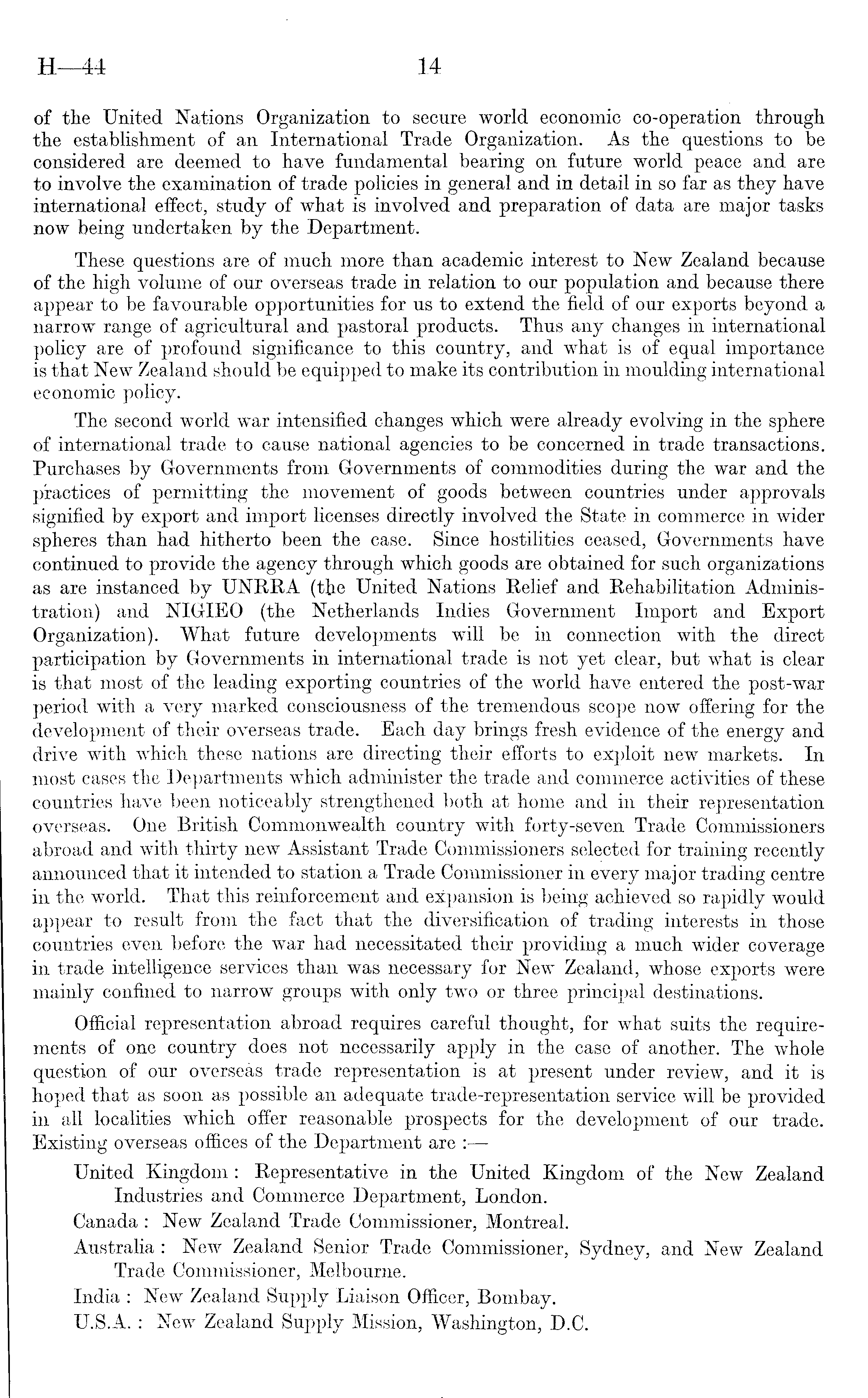 of the United Nations Organization to secure world economic co-operation through, the establishment of an International Trade Organization. As the questions to be considered are deemed to have fundamental bearing on future world peace and are to involve the examination of trade policies in general and in detail in so far as they have international effect, study of what is involved and preparation of data are major tasks now being undertaken by the Department. These questions are of much more than academic interest to New Zealand because of the high volume of our overseas trade in relation to our population and because there appear to be favourable opportunities for us to extend the field of our exports beyond a narrow range of agricultural and pastoral products. Thus any changes in international policy are of profound significance to this country, and what is of equal importance is that New Zealand should be equipped to make its contribution in moulding international economic policy. The second world war intensified changes which were already evolving in the sphere of international trade to cause national agencies to be concerned in trade transactions. Purchases by Governments from Governments of commodities during the war and the practices of permitting the movement of goods between countries under approvals signified by export and import licenses directly involved the State in commerce in wider spheres than had hitherto been the case. Since hostilities ceased, Governments have continued to provide the agency through which goods are obtained for such organizations as are instanced by UNRRA (the United Nations Relief and Rehabilitation Administration) and NIGIEO (the Netherlands Indies Government Import and Export Organization). What future developments will be in connection with the direct participation by Governments in international trade is not yet clear, but what is clear is that most of the leading exporting countries of the world have entered the post-war period with a very marked consciousness of the tremendous scope now offering for the development of their overseas trade. Each day brings fresh evidence of the energy and drive with which these nations are directing their efforts to exploit new markets. In most cases the Departments which administer the trade and commerce activities of these countries have been noticeably strengthened both at home and in their representation overseas. One British Commonwealth country with forty-seven Trade Commissioners abroad and with thirty new Assistant Trade Commissioners selected for training recently announced that it intended to station a Trade Commissioner in every major trading centre in the world. That this reinforcement and expansion is being achieved so rapidly would appear to result from the fact that the diversification of trading interests in those countries even before the war had necessitated their providing a much wider coverage in trade intelligence services than was necessary for New Zealand, whose exports were mainly confined to narrow groups with only two or three principal destinations. Official representation abroad requires careful thought, for what suits the requirements of one country does not necessarily apply in the case of another. The whole question of our overseas trade representation is at present under review, and it is hoped that as soon as possible an adequate trade-representation service will be provided in all localities which offer reasonable prospects for the development of our trade. Existing overseas offices of the Department are : United Kingdom: Representative in the United Kingdom of the New Zealand Industries and Commerce Department, London. Canada : New Zealand Trade Commissioner, Montreal. Australia : New Zealand Senior Trade Commissioner, Sydney, and New Zealand Trade Commissioner, Melbourne. India : New Zealand Supply Liaison Officer, Bombay. U.S.A.: New Zealand Supply Mission, Washington, D.C.