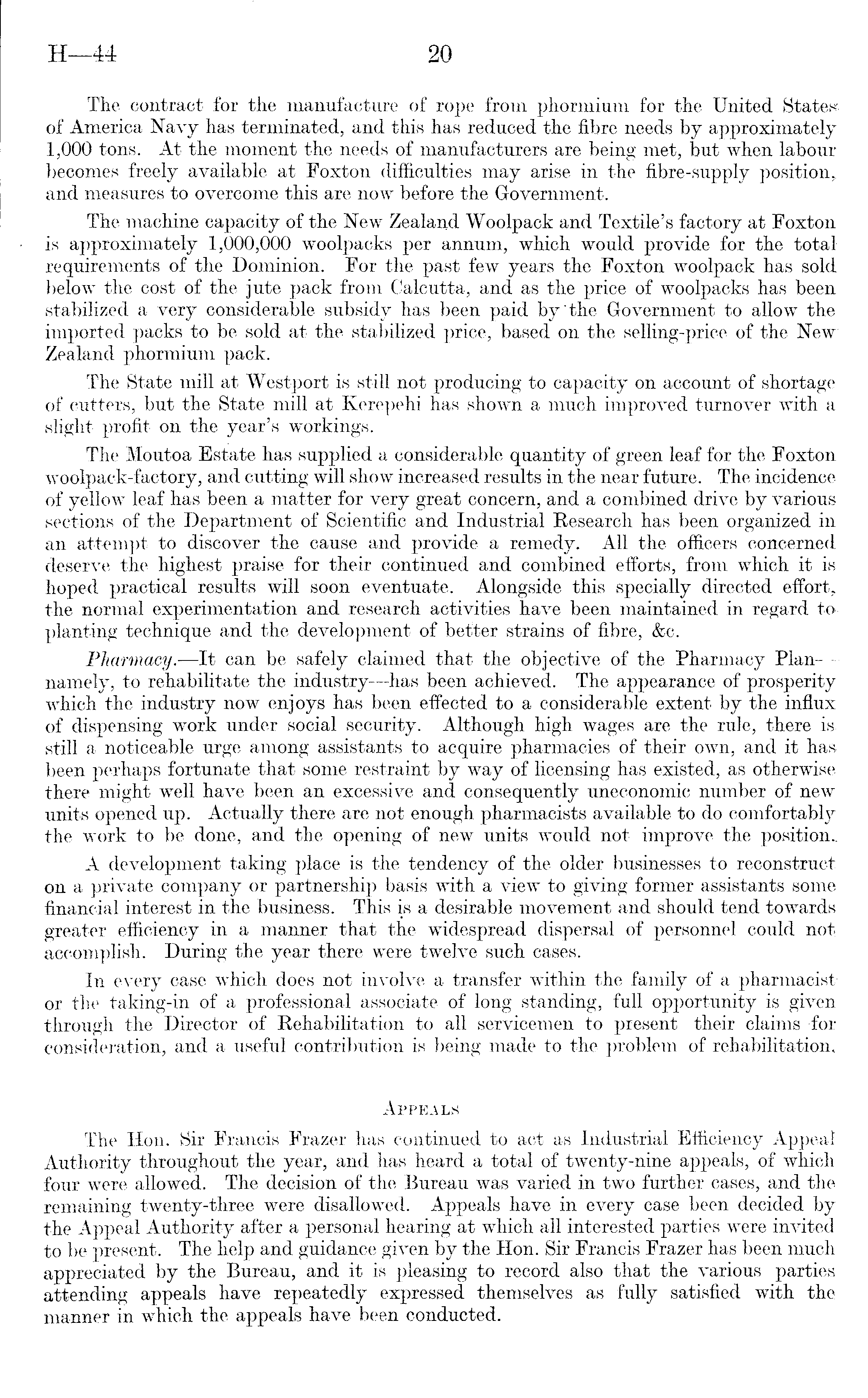 The contract for the manufacture of rope from phormium for the United States of America Navy has terminated, and this has reduced the fibre needs by approximately 1,000 tons. At the moment the needs of manufacturers are being met, but when labour becomes freely available at Foxton difficulties may arise in the fibre-supply position, and measures to overcome this are now before the Government. The machine capacity of the New Zealand Woolpack and Textile's factory at Foxton is approximately 1,000,000 woolpacks per annum, which would provide for the totalrequirements of the Dominion. For the past few years the Foxton woolpack has sold below the cost of the jute pack from Calcutta, and as the price of woolpacks has been stabilized a very considerable subsidy has been paid by the Government to allow the imported packs to be sold at the stabilized price, based on the selling-price of the New Zealand phormium pack. The State mill at Westport is still not producing to capacity on account of shortage of cutters, but the State mill at Kerepehi has shown a much improved turnover with a. slight profit on the year's workings. The Moutoa Estate has supplied a considerable quantity of green leaf for the Foxton woolpack-factory, and cutting will show increased results in the near future. The incidence of yellow leaf has been a matter for very great concern, and a combined drive by varioussections of the Department of Scientific and Industrial Research has been organized in an attempt to discover the cause and provide a remedy. All the officers concerned deserve the highest praise for their continued and combined efforts, from which it is. hoped practical results will soon eventuate. Alongside this specially directed effort, the normal experimentation and research activities have been maintained in regard toplanting technique and the development of bet'ter strains of fibre, &c. Pharmacy.—lt can be safely claimed that the objective of the Pharmacy Plan —- namely, to rehabilitate the industry —has been achieved. The appearance of prosperity which the industry now enjoys has been effected to a considerable extent by the influx of dispensing work under social security. Although high wages are the rule, there is. still a noticeable urge among assistants to acquire pharmacies of their own, and it has: been perhaps fortunate that some restraint by way of licensing has existed, as otherwise there might well have been an excessive and consequently uneconomic number of new units opened up. Actually there are not enough pharmacists available to do comfortably the work to be done, and the opening of new units would not improve the position. A development taking place is the tendency of the older businesses to reconstruct, on a private company or partnership basis with a view to giving former assistants some financial interest in the business. This is a desirable movement and should tend towards greater efficiency in a manner that the widespread dispersal of personnel could not accomplish. During the year there were twelve such cases. In every case which does not involve a transfer within the family of a pharmacist or the taking-in of a professional associate of long standing, full opportunity is given through the Director of Rehabilitation to all servicemen to present their claims for consideration, and a useful contribution is being made to the problem of rehabilitation^ Appeals , The Hon. Sir Francis Frazer has continued to act as Industrial Efficiency Appeal Authority throughout the year, and has heard a total of twenty-nine appeals, of which four were allowed. The decision of the Bureau was varied in two further cases, and the remaining twenty-three were disallowed. Appeals have in every case been decided by the Appeal Authority after a personal hearing at which all interested parties were invited to be present. The help and guidance given by the Hon. Sir Francis Frazer has been much appreciated by the Bureau, and it is pleasing to record also that the various parties attending appeals have repeatedly expressed themselves as fully satisfied with the manner in which the appeals have been conducted.