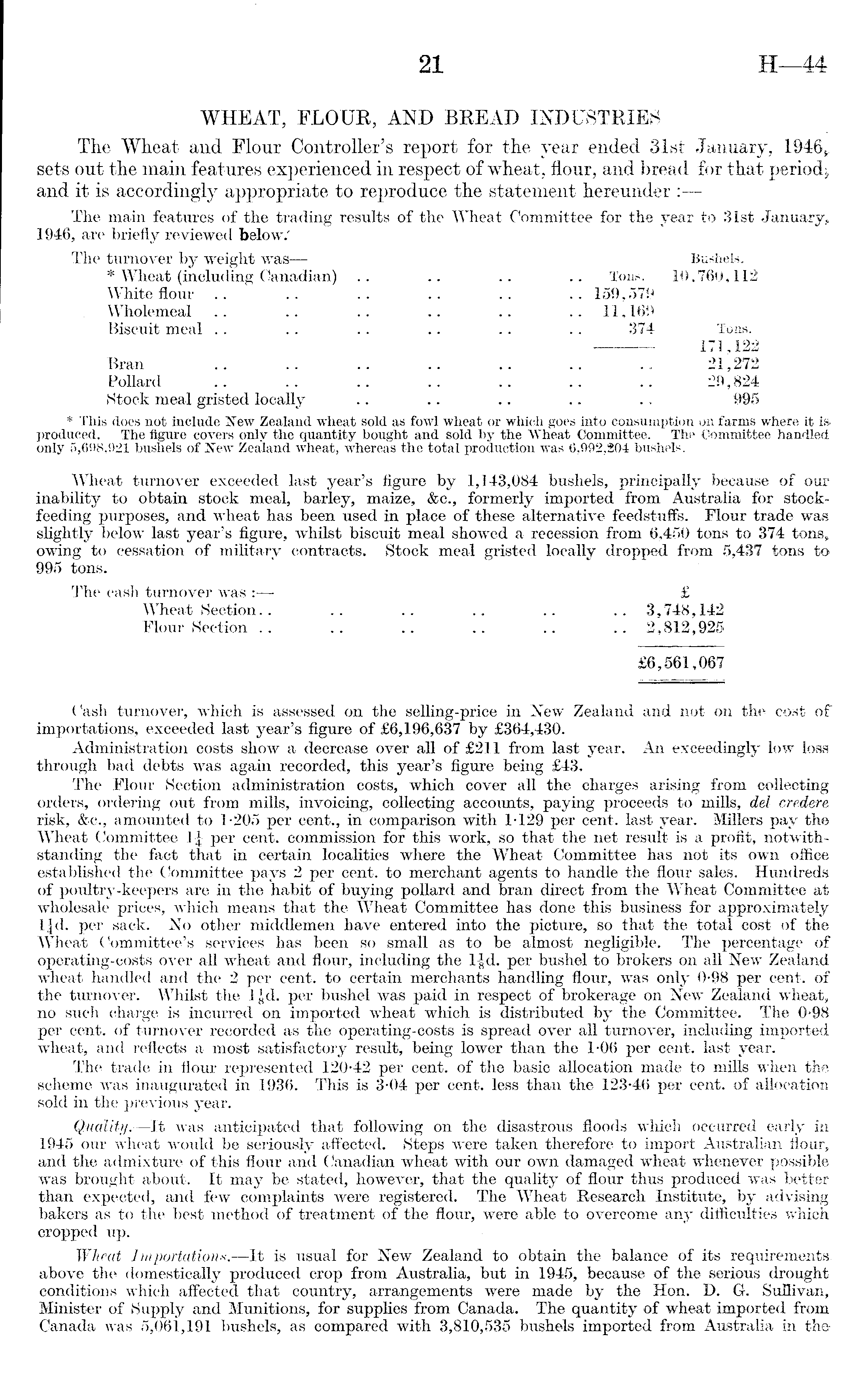 WHEAT, FLOUR, AND BREAD INDUSTRIES The Wheat and Flour Controller's report for the year ended 31st January, 1946* sets out the main features experienced in respect of wheat, flour, and bread for that and it is accordingly appropriate to reproduce the statement hereunder : The main features of the trading results of the Wheat Committee for the year to 31st January, 1946, are briefly reviewed below.' The turnover by weight was— Bushels. * Wheat (including Canadian) .. .. .. .. Tons. 10,760,112 White flour .. .. .. .. .. .. 159,579 Wholemeal .. .. .. .. .. .. 11,169 Biscuit meal .. .. .. .. .. .. 374 , Tons. 171,122 Bran .. .. .. .. .. .. .. 21,272 Pollard .. .. .. .. .. .. .. 29,824 Stock meal gristed locally .. .. .. .. .. 995 * This does not include New Zealand wheat sold as fowl wheat or which goes into consumption on farms where it is. produced. The figure covers only the quantity bought and sold by the Wheat Committee. The Committee handled only 5,698,921 bushels of New Zealand wheat, whereas the total production was 6,992,204 bushels. Wheat turnover exceeded last year's figure by 1,143,084 bushels, principally because of our inability to obtain stock meal, barley, maize, &c., formerly imported from Australia for stockfeeding purposes, and wheat has been used in place of these alternative feedstuffs. Flour trade wasslightly below last year's figure, whilst biscuit meal showed a recession from 6,450 tons to 374 tons, owing to cessation of military contracts. Stock meal gristed locally dropped from 5,437 tons to 995 tons. The cash turnover was : £ Wheat Section.. .. .. .. .. .. 3,748,142 Flour Section .. .. .. .. .. .. 2,812,925 £6,561,067 Cash turnover, which is assessed on the selling-price in New Zealand and not on the cost of importations, exceeded last year's figure of £6,196,637 by £364,430. Administration costs show a decrease over all of £2ll from last year. An exceedingly low loss through bad debts was again recorded, this year's figure being £43. The Flour Section administration costs, which cover all the charges arising from collecting orders, ordering out from mills, invoicing, collecting accounts, paying proceeds to mills, del credere risk, &c., amounted to 1-205 per cent., in comparison with 1-129 per cent, last year. Millers pay the Wheat Committee 1-| per cent, commission for this work, so that the net result is a profit, notwithstanding the fact that in certain localities where the Wheat Committee has not its own office established the Committee pays 2 per cent, to merchant agents to handle the flour sales. Hundreds of poultry-keepers are in the habit of buying pollard and bran direct from the Wheat Committee at wholesale prices, which means that the Wheat Committee has done this business for approximately Ijd. per sack. No other middlemen have entered into the picture, so that the total cost of the Wheat Committee's services has been so small as to be almost negligible. The percentage of operating-costs over all wheat and flour, including the l|d. per bushel to brokers on all New Zealand wheat handled and the 2 per cent, to certain merchants handling flour, was only 0-98 per cent, of the turnover. Whilst the l£d. per bushel was paid in respect of brokerage on New Zealand wheat, no such charge is incurred on imported wheat which is distributed by the Committee. The 0-98 per cent, of turnover recorded as the operating-costs is spread over all turnover, including imported wheat, and reflects a most satisfactory result, being lower than the 1-06 per cent, last year. The trade in flour represented 120-42 per cent, of the basic allocation made to mills when the scheme was inaugurated in 1936. This is 3-04 per cent, less than the 123*46 per cent, of allocation, sold in the previous year, Quality.— It was anticipated that following on the disastrous floods which occurred early in 1945 our wheat would be seriously affected. Steps were taken therefore to import Australian flour, and the admixture of this flour and Canadian wheat with our own damaged wheat whenever possible was brought about. It may be stated, however, that the quality of flour thus produced was better than expected, and few complaints were registered. The Wheat Research Institute, by advising bakers as to the best method of treatment of the flour, were able to overcome any difficulties which cropped up. Wheat Importations.—lt is usual for New Zealand to obtain the balance of its requirements, above the domestically produced crop from Australia, but in 1945, because of the serious drought conditions which affected that country, arrangements were made by the Hon. D. G. Sullivan, Minister of Supply and Munitions, for supplies from Canada. The quantity of wheat imported from Canada was 5,061,191 bushels, as compared with 3,810,535 bushels imported from Australia in the-