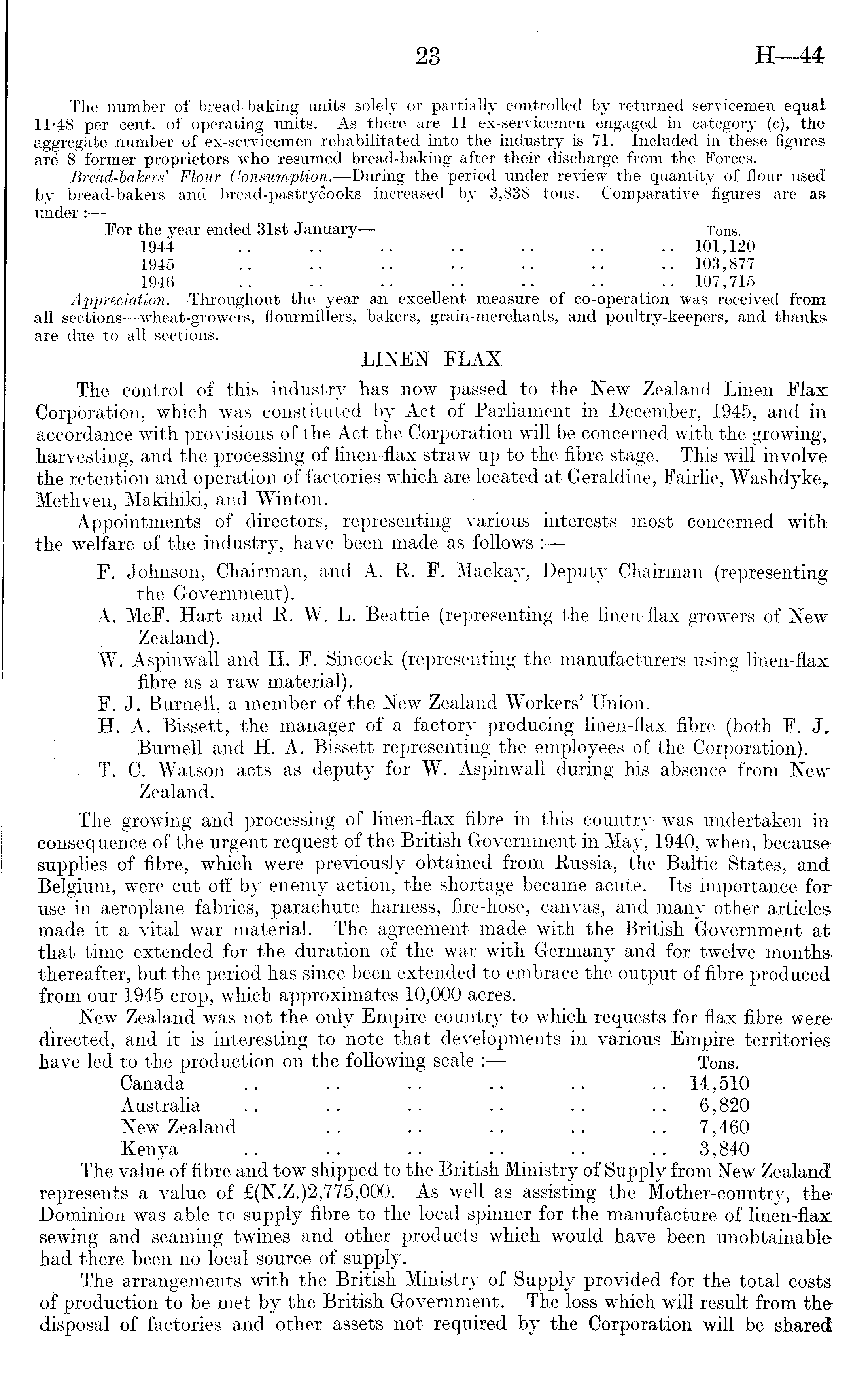 The number of bread-baking units solely or partially controlled by returned servicemen equal 11-48 per cent, of operating units. As there are 11 ex-servicemen engaged in category (c), the aggregate number of ex-servicemen rehabilitated into the industry is 71. Included in these figures are 8 former proprietors who resumed bread-baking after their discharge from the Forces. Bread-bakers' Flour Consumption.—During the period under review the quantity of flour used by bread-bakers and bread-pastrycooks increased by 3,838 tons. Comparative figures are asunder: — For the year ended 31st January— Tons. 1944 .. .. .. .. .. .. .. 101,120 1945 .. .. .. •• •• .. .. 103,877 1946 .. .. .. .. .. .. .. 107,715 Appreciation.—Throughout the year an excellent measure of co-operation was received from all sections—wheat-growers, flourmillers, bakers, grain-merchants, and poultry-keepers, and thanks are due to all sections. LINEN FLAX The control of this industry has now passed to the New Zealand Linen Flax: Corporation, which was constituted by Act of Parliament in December, 1945, and in accordance with provisions of the Act the Corporation will be concerned with the growing, harvesting, and the processing of linen-flax straw up to the fibre stage. This will involve the retention and operation of factories which are located at Geraldine, Fairlie, Washdyke, Methven, Makihiki, and Winton. Appointments of directors, representing various interests most concerned with the welfare of the industry, have been made as follows : F. Johnson, Chairman, and A. R. F. Mackay, Deputy Chairman (representing the Government). A. McF. Hart and R. W. L. Beattie (representing the linen-flax growers of New Zealand). W. Aspinwall and H. F. Sincock (representing the manufacturers using linen-flax: fibre as a raw material). F. J. Burnell, a member of the New Zealand Workers' Union. H. A. Bissett, the manager of a factory producing linen-flax fibre (both F. J. Burnell and H. A. Bissett representing the employees of the Corporation). T. C. Watson acts as deputy for W. Aspinwall during his absence from New Zealand. The growing and processing of linen-flax fibre in this country was undertaken in consequence of the urgent request of the British Government in May, 1940, when, because supplies of fibre, which were previously obtained from Russia, the Baltic States, and Belgium, were cut off by enemy action, the shortage became acute. Its importance for use in aeroplane fabrics, parachute harness, fire-hose, canvas, and many other articles made it a vital war material. The agreement made with the British Government at that time extended for the duration of the war with Germany and for twelve months, thereafter, but the period has since been extended to embrace the output of fibre produced from our 1945 crop, which approximates 10,000 acres. New Zealand was not the only Empire country to which requests for flax fibre were directed, and it is interesting to note that developments in various Empire territories have led to the production on the following scale : Tons. Canada .. .. .. .. .. .. 14,510 Australia .. .. .. .. .. .. 6,820 New Zealand .. .. .. .. 7,460 Kenya .. .. .. .. .. 3,840 The value of fibre and tow shipped to the British Ministry of Supply from New Zealand represents a value of £(N.Z.)2,775,000. As well as assisting the Mother-country, theDominion was able to supply fibre to the local spinner for the manufacture of linen-flax sewing and seaming twines and other products which would have been unobtainable had there been no local source of supply. The arrangements with the British Ministry of Supply provided for the total costs of production to be met by the British Government. The loss which will result from the disposal of factories and other assets not required by the Corporation will be shared