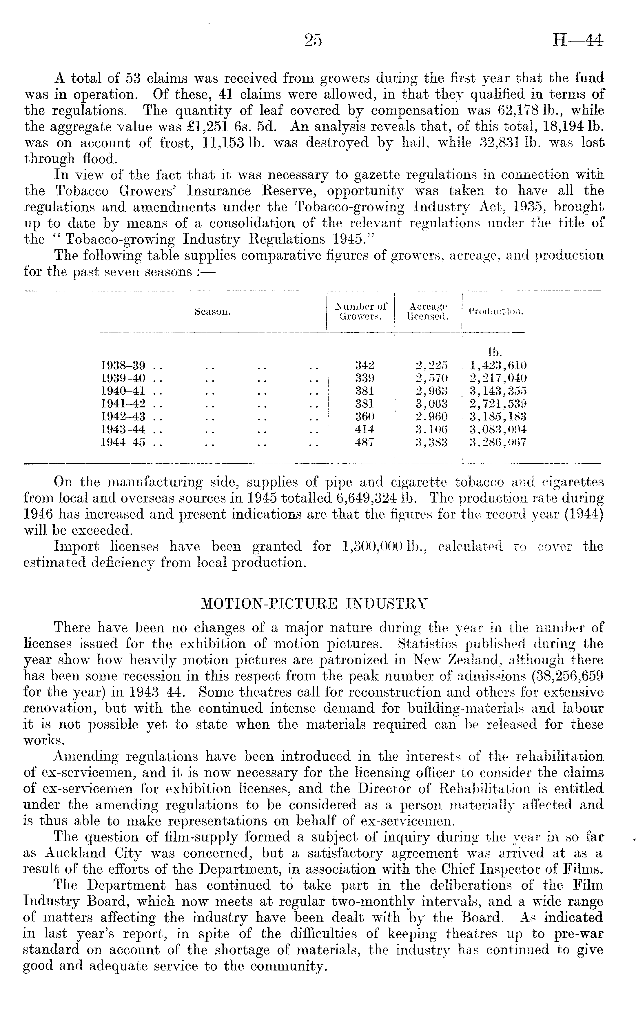 On the manufacturing side, supplies of pipe and cigarette tobacco and cigarettes from local and overseas sources in 1945 totalled 6,649,324 lb. The production rate during 1946 has increased and present indications are that the figures for the record year (1944) will be exceeded. Import licenses have been granted for 1,300,000 lb., calculated to cover the estimated deficiency from local production. MOTION-PICTURE INDUSTRY There have been no changes of a major nature during the year in the number of licenses issued for the exhibition of motion pictures. Statistics published during the year show how heavily motion pictures are patronized in New Zealand, although there has been some recession in this respect from the peak number of admissions (38,256,659 for the year) in 1943-44. Some theatres call for reconstruction and others for extensive renovation, but with the continued intense demand for building-materials and labour it is not possible yet to state when the materials required can be released for these works. Amending regulations have been introduced in the interests of the rehabilitation of ex-servicemen, and it is now necessary for the licensing officer to consider the claims of ex-servicemen for exhibition licenses, and the Director of Rehabilitation is entitled under the amending regulations to be considered as a person materially affected and is thus able to make representations on behalf of ex-servicemen. The question of film-supply formed a subject of inquiry during the year in so far as Auckland City was concerned, but a satisfactory agreement was arrived at as a result of the efforts of the Department, in association with the Chief Inspector of Films. The Department has continued to take part in the deliberations of the Film Industry Board, which now meets at regular two-monthly intervals, and a wide range of matters affecting the industry have been dealt with by the Board. As indicated in last year's report, in spite of the difficulties of keeping theatres up to pre-war standard on account of the shortage of materials, the industry has continued to give good and adequate service to the community.