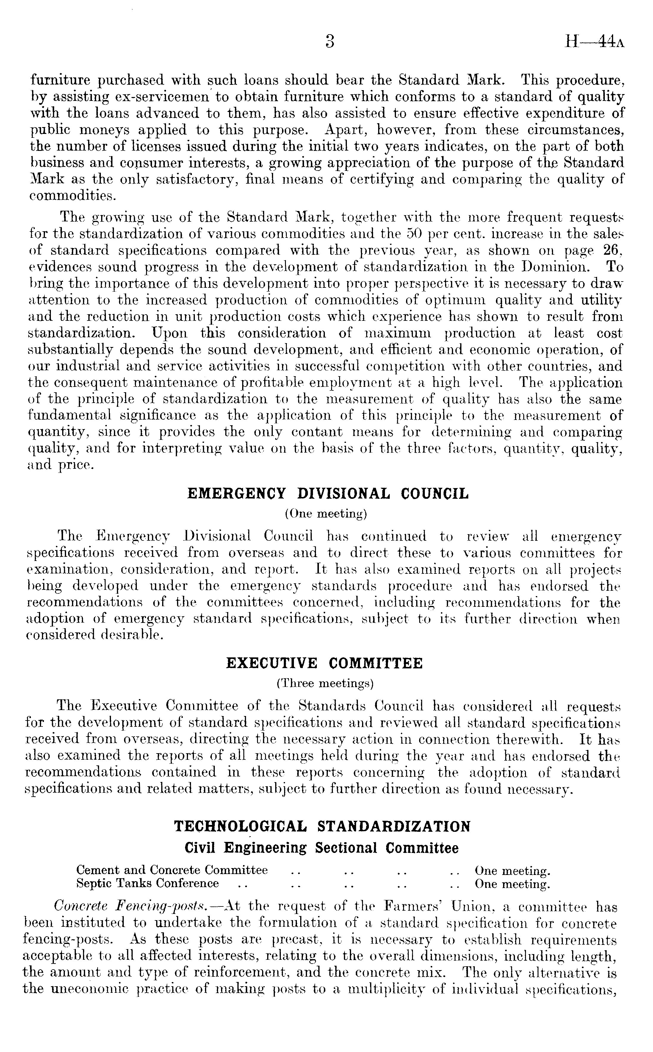 furniture purchased with such loans should bear the Standard Mark. This procedure, by assisting ex-servicemen to obtain furniture which conforms to a standard of quality with the loans advanced to them, has also assisted to ensure effective expenditure of public moneys applied to this purpose. Apart, however, from these circumstances, the number of licenses issued during the initial two years indicates, on the part of both business and consumer interests, a growing appreciation of the purpose of the Standard Mark as the only satisfactory, final means of certifying and comparing the quality of commodities. The growing use of the Standard Mark, together with the more frequent requests for the standardization of various commodities and the 50 per cent, increase in the sales of standard specifications compared with the previous year, as shown on page 26, evidences sound progress in the development of standardization in the Dominion. To bring the importance of this development into proper perspective it is necessary to draw attention to the increased production of commodities of optimum quality and utility and the reduction in unit production costs which experience has shown to result from standardization. Upon this consideration of maximum production at least cost substantially depends the sound development, and efficient and economic operation, of our industrial and service activities in successful competition with other countries, and the consequent maintenance of profitable employment at a high level. The application of the principle of standardization to the measurement of quality has also the same fundamental significance as the application of this principle to the measurement of quantity, since it provides the only contant means for determining and comparing quality, and for interpreting value on the basis of the three factors, quantity, quality, and price. EMERGENCY DIVISIONAL COUNCIL (One meeting) The Emergency Divisional Council has continued to review all emergency specifications received from overseas and to direct these to various committees for examination, consideration, and report. It has also examined reports on all projects being developed under the emergency standards procedure and has endorsed the recommendations of the committees concerned, including recommendations for the adoption of emergency standard specifications, subject to its further direction when considered desirable. EXECUTIVE COMMITTEE (Three meetings) The Executive Committee of the Standards Council has considered all requests for the development of standard specifications and reviewed all standard specifications received from overseas, directing the necessary action in connection therewith. It has also examined the reports of all meetings held during the year and has endorsed the recommendations contained in these reports concerning the adoption of standard specifications and related matters, subject to further direction as found necessary. TECHNOLOGICAL STANDARDIZATION Civil Engineering Sectional Committee Cement and Concrete Committee .. .. .. .. One meeting. Septic Tanks Conference .. .. .. .. .. One meeting. Concrete Fencing-posts.—At the request of the Farmers' Union, a committee has been instituted to undertake the formulation of a standard specification for concrete fencing-posts. As these posts are precast, it is necessary to establish requirements acceptable to all affected interests, relating to the overall dimensions, including length, the amount and type of reinforcement, and the concrete mix. The only alternative is the uneconomic practice of making posts to a multiplicity of individual specifications,