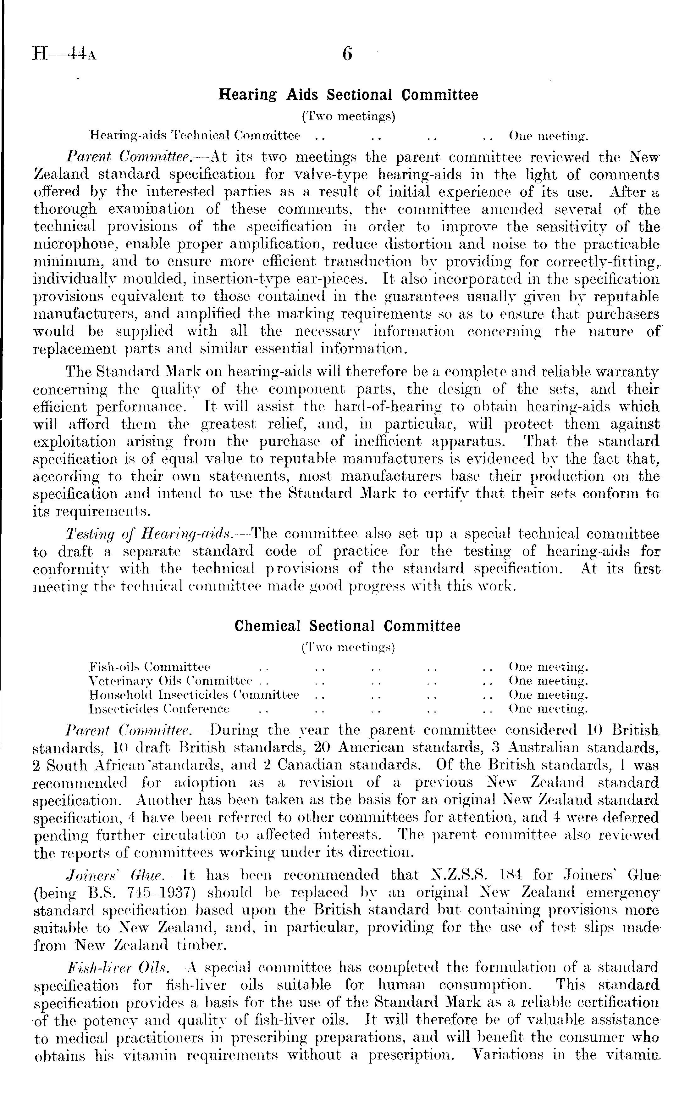 Hearing Aids Sectional Committee (Two meetings) Hearing-aids Technical Committee .. .. .. .. One meeting. Parent Committee. —At its two meetings the parent committee reviewed the New Zealand standard specification for valve-type hearing-aids in the light of comments offered by the interested parties as a result of initial experience of its use. After a thorough examination of these comments, the committee amended several of the technical provisions of the specification in order to improve the sensitivity of the microphone, enable proper amplification, reduce distortion and noise to the practicable minimum, and to ensure more efficient transduction by providing for correctly-fitting,, individually moulded, insertion-type ear-pieces. It also incorporated in the specification provisions equivalent to those contained in the guarantees usually given by reputable manufacturers, and amplified the marking requirements so as to ensure that purchasers would be supplied with all the necessary information concerning the nature of replacement parts and similar essential information. The Standard Mark on hearing-aids will therefore be a complete and reliable warranty concerning the quality of the component parts, the design of the sets, and their efficient performance. It will assist the hard-of-hearing to obtain hearing-aids which will afford them the greatest relief, and, in particular, will protect them against exploitation arising from the purchase of inefficient apparatus. That the standard specification is of equal value to reputable manufacturers is evidenced by the fact that, according to their own statements, most manufacturers base their production on the specification and intend to use the Standard Mark to certify that their sets conform to its requirements. Testing of Hearing-aids. —The committee also set up a special technical committee to draft a separate standard code of practice for the testing of hearing-aids for conformity with the technical provisions of the standard specification. At its first meeting the technical committee made good progress with this work. Chemical Sectional Committee (Two meetings) Fish-oils Committee .. .. .. .. ~ One meeting. Veterinary Oils Committee .. .. .. .. .. One meeting. Household Insecticides Committee .. .. .. .. One meeting. Insecticides Conference .. .. .. .. .. One meeting. Parent Committee. —During the year the parent committee considered 10 British standards, 10 draft British standards, 20 American standards, 3 Australian standards,. 2 South African'standards, and 2 Canadian standards. Of the British standards, 1 was recommended for adoption as a revision of a previous New Zealand standard specification. Another has been taken as the basis for an original New Zealand standard specification, 4 have been referred to other committees for attention, and 4 were deferred pending further circulation to affected interests. The parent committee also reviewed the reports of committees working under its direction. Joiners' Glue. —It has been recommended that N.Z.S.S. 184 for Joiners' Glue (being B.S. 745-1937) should be replaced by an original New Zealand emergency standard specification based upon the British standard but containing provisions more suitable to New Zealand, and, in particular, providing for the use of test slips made from New Zealand timber. Fish-liver Oils. —A special committee has completed the formulation of a standard specification for fish-liver oils suitable for human consumption. This standard specification provides a basis for the use of the Standard Mark as a reliable certification of the potency and quality of fish-liver oils. It will therefore be of valuable assistance to medical practitioners in prescribing preparations, and will benefit the consumer who obtains his vitamin requirements without a prescription. Variations in the vitamin