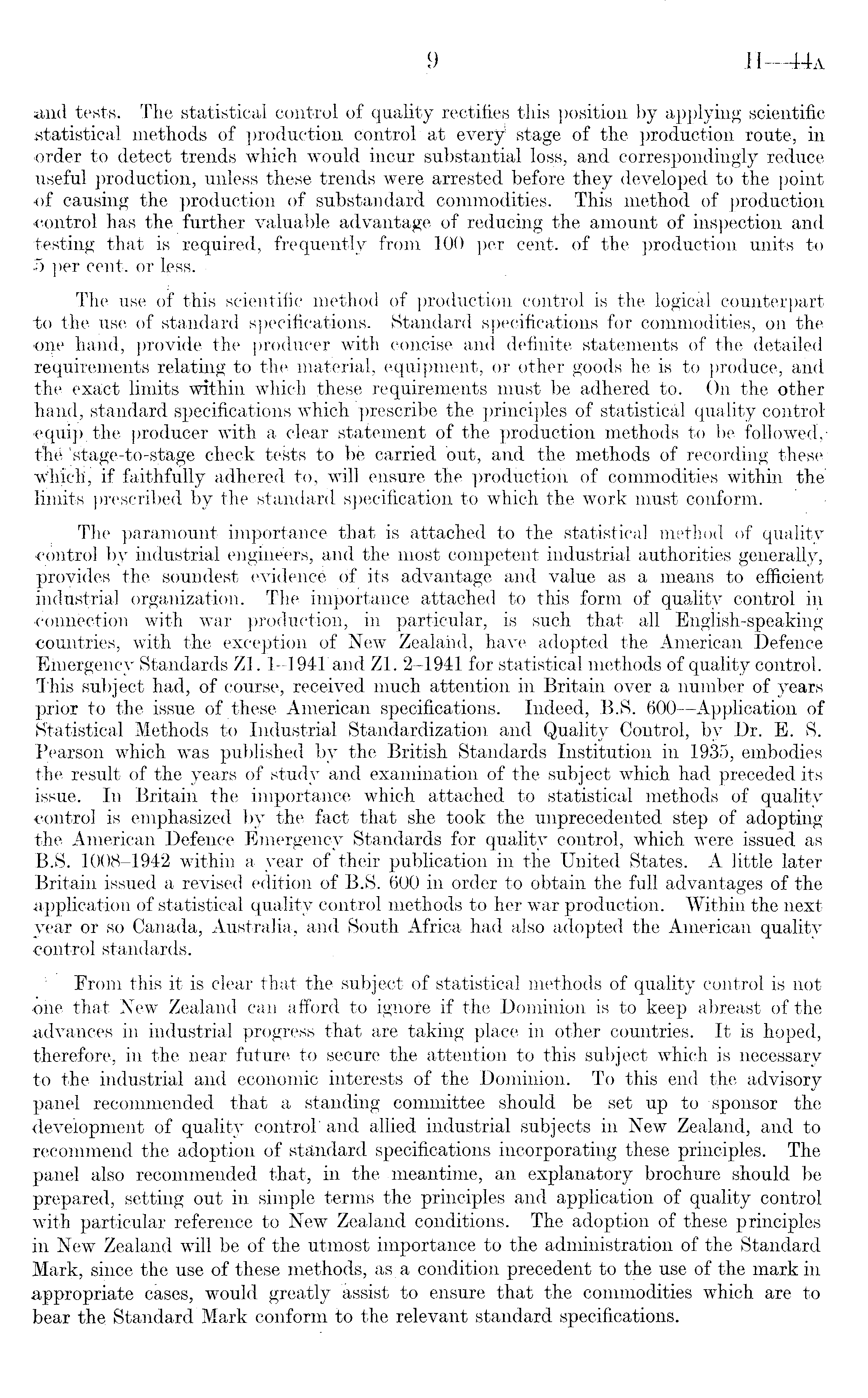 and tests. The statistical control of quality rectifies this position by applying scientific statistical methods of production control at every stage of the production route, in order to detect trends which would incur substantial loss, and correspondingly reduce useful production, unless these trends were arrested before they developed to the point of causing the production of substandard commodities. This method of production control has the further valuable advantage of reducing the amount of inspection and testing that is required, frequently from 100 per cent, of the production units to 5 per cent, or less. The use of this scientific method of production control is the logical counterpart to the use of standard specifications. Standard specifications for commodities, on the one hand, provide the producer with concise and definite statements of the detailed requirements relating to the material, equipment, or other goods he is to produce, and the exact limits within which these requirements must be adhered to. On the other hand, standard specifications which prescribe the principles of statistical quality control equip the producer with a clear statement of the production methods to be followed,-the'stage-to-stage check tests to be carried out, and the methods of recording these which, if faithfully adhered to, will ensure the production of commodities within the limits prescribed by the standard specification to which the work must conform. The paramount importance that is attached to the statistical method of quality control by industrial engineers, and the most competent industrial authorities generally, provides the soundest evidence: of its advantage and value as a means to efficient industrial organization. The importance attached to this form of quality control in connection with war production, in -particular, is such that all English-speaking countries, with the exception of New Zealand, have adopted the American Defence Emergency Standards Zl. 1-1941 and Zl. 2-1941 for statistical methods of quality control. This subject had, of course, received much attention in Britain over a number of years prior to the issue of these American specifications. Indeed, B.S. 600 —Application of Statistical Methods to Industrial Standardization and Quality Control, by Dr. E. S. Pearson which was published by the British Standards Institution in 1935, embodies the result of the years of study and examination of the subject which had preceded its issue. In Britain the importance which attached to statistical methods of quality control is emphasized by the fact that she took the unprecedented step of adopting the American Defence Emergency Standards for quality control, which were issued as B.S. 1008-1942 within a year of their publication in the United States. A little later Britain issued a revised edition of B.S. 600 in order to obtain the full advantages of the application of statistical quality control methods to her war production. Within the next year or so Canada, Australia, and South Africa had also adopted the American quality control standards. From this it is clear that the subject of statistical methods of quality control is not one that New Zealand can afford to ignore if the Dominion is to keep abreast of the advances in industrial progress that are taking place in other countries. It is hoped, therefore, in the near future to secure the attention to this subject which is necessary to the industrial and economic interests of the Dominion. To this end the advisory panel recommended that a standing committee should be set up to sponsor the development of quality control and allied industrial subjects in New Zealand, and to recommend the adoption of standard specifications incorporating these principles. The panel also recommended that, in the meantime, an explanatory brochure should be prepared, setting out in simple terms the principles and application of quality control with particular reference to New Zealand conditions. The adoption of these principles in New Zealand will be of the utmost importance to the administration of the Standard Mark, since the use of these methods, as a condition precedent to the use of the mark in appropriate cases, would greatly assist, to ensure that the commodities which are to bear the. Standard Mark conform to the relevant standard specifications.