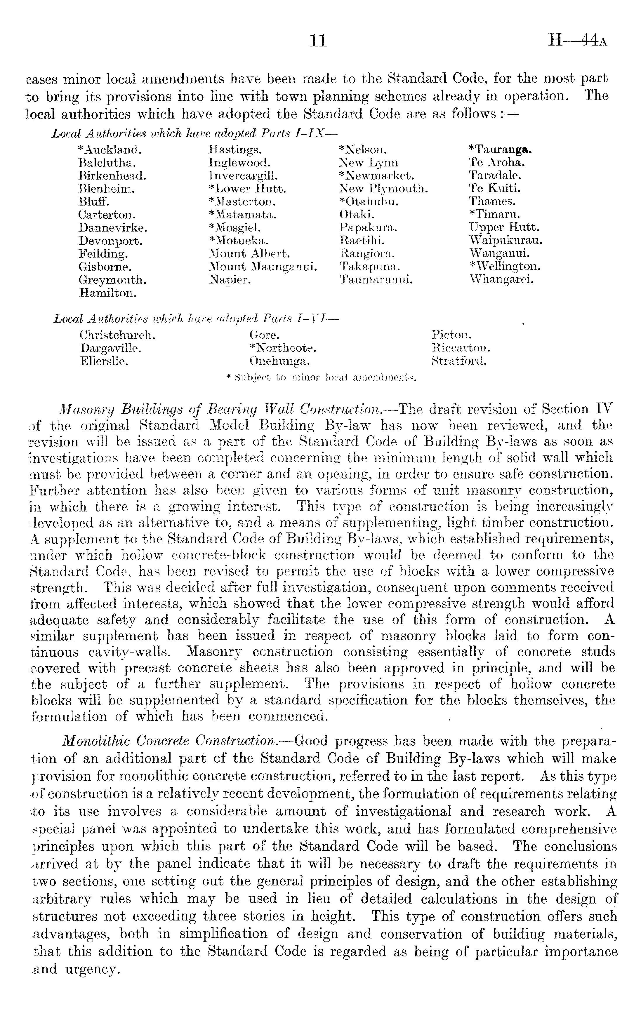 cases minor local amendments have been made to the Standard Code, for the most part -to bring its provisions into line with town planning schemes already in operation. The local authorities which have adopted the Standard Code are as follows Local Authorities which have adopted Parts I-IX—- * Auckland. Hastings. *Nelson.. *Tauranga. Balclutha. Inglewood. New Lynn Te Aroha. Birkenhead. Invercargill. *Newmarket. Taradale. Blenheim. * Lower Hutt. New Plymouth. Te Kuiti. Bluff. * Master ton. *Otahuhu. Thames. Carterton. *Matamata. Otaki. *Timaru. Dannevirke. *Mosgiel. Papakura. Upper Hutt. Devonport. *Motueka. Raetihi. Waipukurau. Feilding. Mount Albert. Rangiora. Wanganui. Gisborne. Mount Maunganui. Takapuna. * Wellington. Greymouth. Napier. Taumarunui. Whangarei. Hamilton. Local Authorities which have adopted Parts I- VI — Christchurch. Gore. Picton. Dargaville. *Northcote. Riccarton. Ellerslie. Onehunga. Stratford. * Subject to minor local amendments. Masonry Buildings of Bearing Wall Construction. —The draft revision of Section IV of the original Standard Model Building By-law has now been reviewed, and the revision will be issued as a part of the Standard Code of Building By-laws as soon as investigations have been completed concerning the minimum length of solid wall which must be provided between a corner and an opening, in order to ensure safe construction. Further attention has also been given to various forms of unit masonry construction, in which there is a growing interest. This type of construction is being increasingly developed as an alternative to, and a means of supplementing, light timber construction. A supplement to the Standard Code of Building By-laws, which established requirements, under which hollow concrete-block construction would be deemed to conform to the Standard Code, has been revised to permit the use of blocks with a lower compressive strength. This was decided after full investigation, consequent upon comments received from affected interests, which showed that the lower compressive strength would afford adequate safety and considerably facilitate the use of this form of construction. A similar supplement has been issued in respect of masonry blocks laid to form continuous cavity-walls. Masonry construction consisting essentially of concrete studs •covered with precast concrete sheets has also been approved in principle, and will be the subject of a further supplement. The provisions in respect of hollow concrete blocks will be supplemented by a standard specification for the blocks themselves, the formulation of which has been commenced. Monolithic Concrete Construction.—Good progress has been made with the preparation of an additional part of the Standard Code of Building By-laws which will make provision for monolithic concrete construction, referred to in the last report. As this type of construction is a relatively recent development, the formulation of requirements relating to its use involves a considerable amount of investigational and research work. A special panel was appointed to undertake this work, and has formulated comprehensive principles upon which this part of the Standard Code will be based. The conclusions arrived at by the panel indicate that it will be necessary to draft the requirements in two sections, one setting out the general principles of design, and the other establishing arbitrary rules which may be used in lieu of detailed calculations in the design of structures not exceeding three stories in height. This type of construction offers such advantages, both in simplification of design and conservation of building materials, that this addition to the Standard Code is regarded as being of particular importance and urgency.