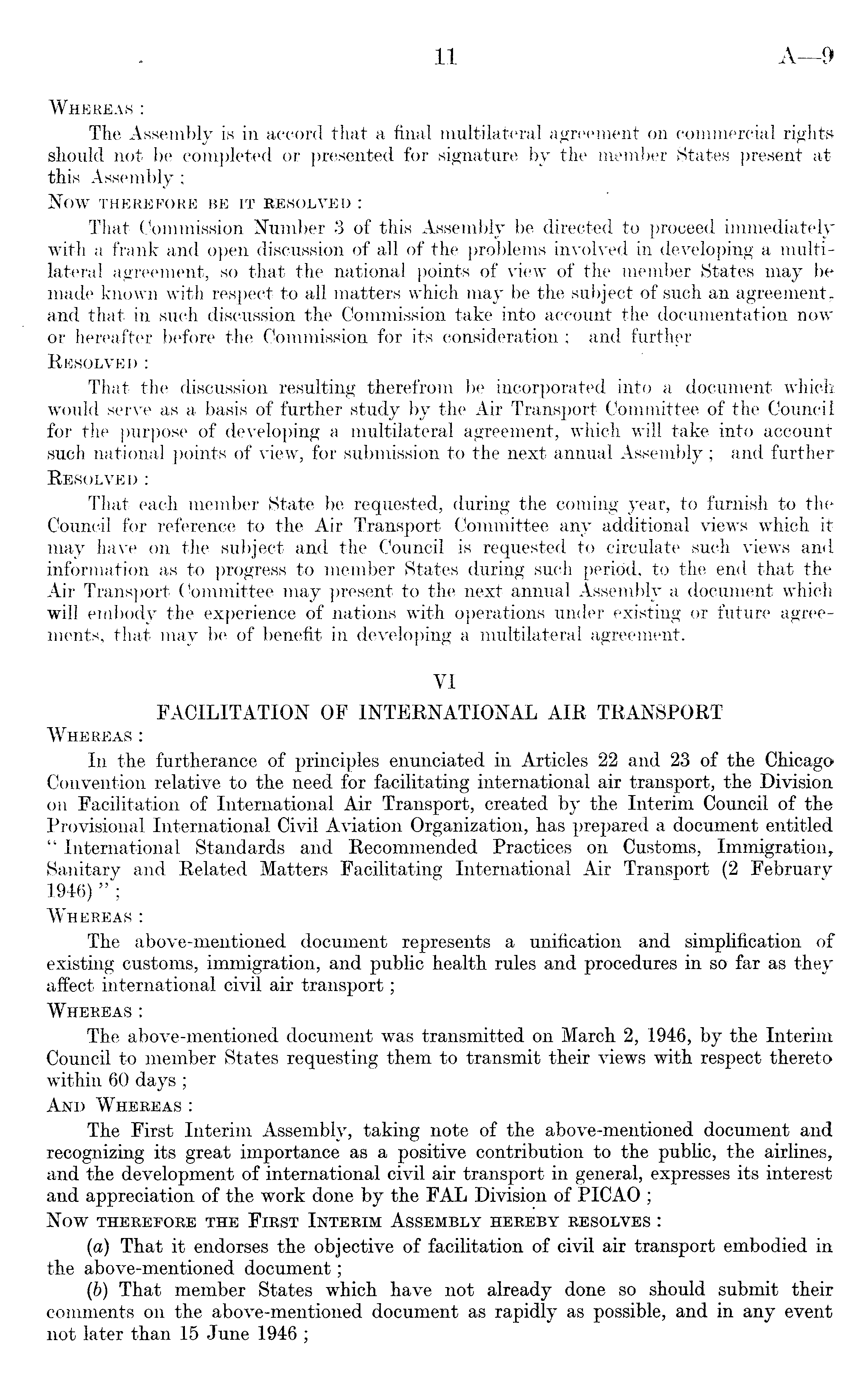 Whereas : The Assembly is in accord that a final multilateral agreement on commercial rights should not be completed or presented for signature by the member States present at this Assembly ; NOW THEREFORE BE IT RESOLVED : That Commission Number 3 of this Assembly be directed to proceed immediately with a frank and open discussion of all of the problems involved in developing a multilateral agreement, so that the national points of view of the member States may be made known with respect to all matters which may be the subject of such an agreement, and that in such discussion the Commission take into account the documentation now or hereafter before the Commission for its consideration ; and further Resolved : That the discussion resulting therefrom be incorporated into a document which would serve as a basis of further study by the Air Transport Committee of the Council for the purpose of developing a multilateral agreement, which will take into account such national points of view, for submission to the next annual Assembly ; and further Resolved : That each member State be requested, during the coming year, to furnish to the Council for reference to the Air Transport Committee any additional views which it may have on the subject and the Council is requested to circulate such views and information as to progress to member States during such period, to the end that the Air Transport Committee may present to the next annual Assembly a document which will embody the experience of nations with operations under existing or future agreements, that may be of benefit in developing a multilateral agreement. VI FACILITATION OF INTERNATIONAL AIR TRANSPORT Whereas : In the furtherance of principles enunciated in Articles 22 and 23 of the Chicago Convention relative to the need for facilitating international air transport, the Division on Facilitation of International Air Transport, created by the Interim Council of the Provisional International Civil Aviation Organization, has prepared a document entitled " International Standards and Recommended Practices on Customs, Immigration Sanitary and Related Matters Facilitating International Air Transport (2 February 1946) " ; Whereas : The above-mentioned document represents a unification and simplification of existing customs, immigration, and public health rules and procedures in so far as they affect international civil air transport; Whereas : The above-mentioned document was transmitted on March 2, 1946, by the Interim Council to member States requesting them to transmit their views with respect thereto within 60 days ; And Whereas : The First Interim Assembly, taking note of the above-mentioned document and recognizing its great importance as a positive contribution to the public, the airlines, and the development of international civil air transport in general, expresses its interest and appreciation of the work done by the FAL Division of PIC AO ; Now therefore the First Interim Assembly hereby resolves : (a) That it endorses the objective of facilitation of civil air transport embodied in the above-mentioned document; (b) That member States which have not already done so should submit their comments on the above-mentioned document as rapidly as possible, and in any event not later than 15 June 1946 ;