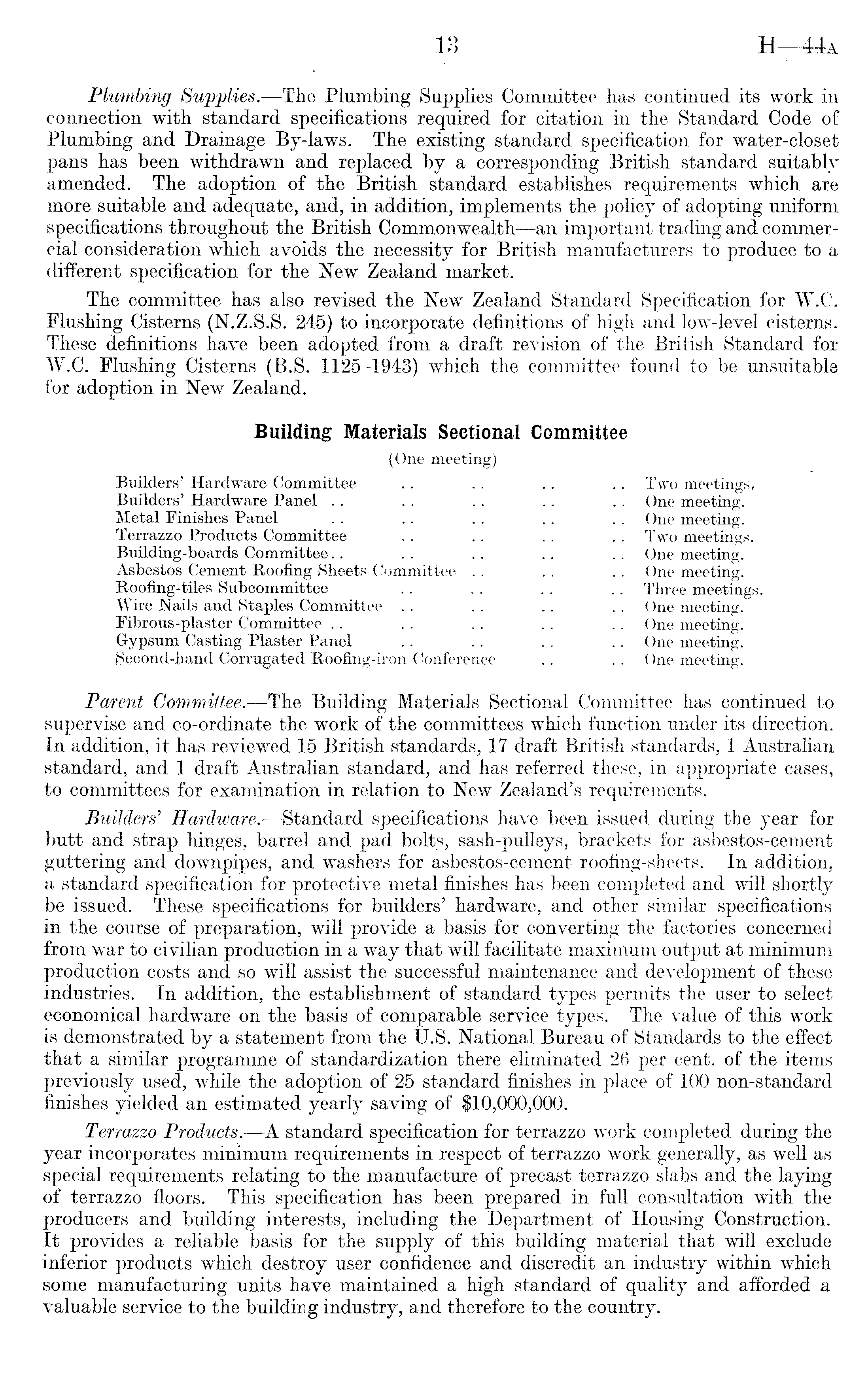 Plumbing Supplies. —The Plumbing Supplies Committee has continued its work in connection with standard specifications required for citation in the Standard Code of Plumbing and Drainage By-laws. The existing standard specification for water-closet pans has been withdrawn and replaced by a corresponding British standard suitably amended. The adoption of the British standard establishes requirements which are more suitable and adequate, and, in addition, implements the policy of adopting uniform specifications throughout the British Commonwealth—an important trading and commercial consideration which avoids the necessity for British manufacturers to produce to a different specification for the New Zealand market. The committee has also revised the New Zealand Standard Specification for W.C. Flushing Cisterns (N.Z.S.S. 245) to incorporate definitions of high and low-level cisterns. These definitions have been adopted from a draft revision of the British Standard for W.C. Flushing Cisterns (B.S. 1125-1943) which the committee found to be unsuitable for adoption in New Zealand. Building Materials Sectional Committee (One meeting) Builders' Hardware Committee .. .. .. ... Two meetings. Builders' Hardware Panel .. . . .. .. .. One meeting. Metal Finishes Panel .. . . .. .. .. One meeting. Terrazzo Products Committee .. .. .. .. Two meetings. Building-boards Committee.. .. .. . . .. One meeting. Asbestos Cement Roofing Sheets Committee .. .. .. One meeting. Roofing-tiles Subcommittee .. .. .. .. Three meetings. Wire Nails and Staples Committee .. .. .. .. One meeting. Fibrous-plaster Committee .. .. .. .. .. One meeting. Gypsum Casting Plaster Panel . . . . . . .. One meeting. Second-hand Corrugated Roofing-iron Conference .. .. One meeting. Parent Committee.—The Building Materials Sectional Committee has continued to supervise and co-ordinate the work of the committees which function under its direction. In addition, it has reviewed 15 British standards, 17 draft British standards, 1 Australian standard, and 1 draft Australian standard, and has referred these, in appropriate cases, to committees for examination in relation to New Zealand's requirements. Builders' Hardware. —Standard specifications have been issued during the year for butt and strap hinges, barrel and pad bolts, sash-pulleys, brackets for asbestos-cement guttering and downpipes, and washers for asbestos-cement roofing-sheets. In addition, a standard specification for protective metal finishes has been completed and will shortly be issued. These specifications for builders' hardware, and other similar specifications in the course of preparation, will provide a basis for converting the factories concerned from war to civilian production in a way that will facilitate maximum output at minimum production costs and so will assist the successful maintenance and development of these industries. In addition, the establishment of standard types permits the user to select economical hardware on the basis of comparable service types. The value of this work is demonstrated by a statement from the U.S. National Bureau of Standards to the effect that a similar programme of standardization there eliminated 26 per cent, of the items previously used, while the adoption of 25 standard finishes in place of 100 non-standard finishes yielded an estimated yearly saving of $10,000,000. Terrazzo Products.—A standard specification for terrazzo work completed during the year incorporates minimum requirements in respect of terrazzo work generally, as well as special requirements relating to the manufacture of precast terrazzo slabs and the laying of terrazzo floors. This specification has been prepared in full consultation with the producers and building interests, including the Department of Housing Construction. It provides a reliable basis for the supply of this building material that will exclude inferior products which destroy user confidence and discredit an industry within which some manufacturing units have maintained a high standard of quality and afforded a valuable service to the building industry, and therefore to the country.