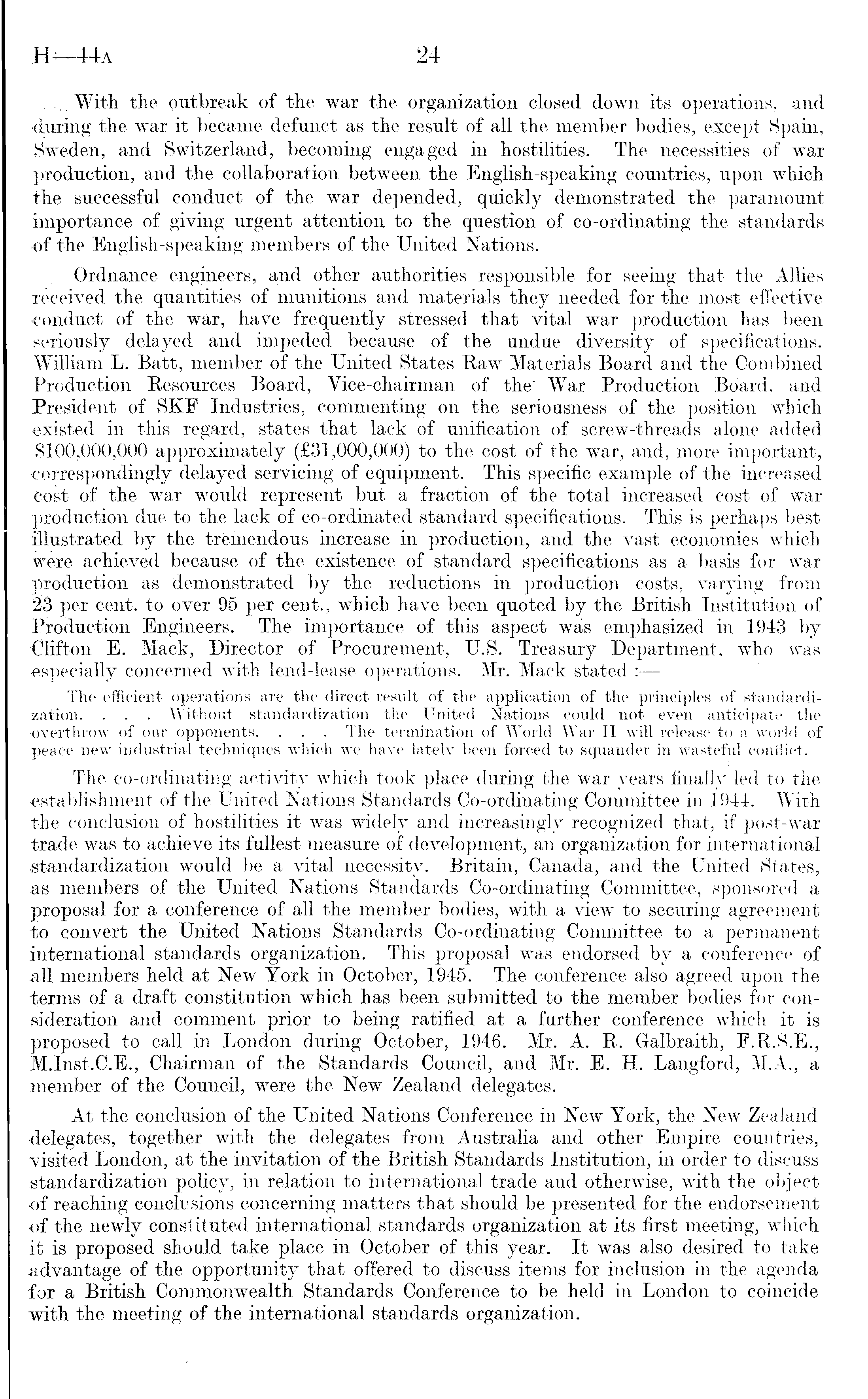 .... With the outbreak of the war the organization closed down its operations, and during the war it became defunct as the result of all the member bodies, except Spain, Sweden, and Switzerland, becoming engaged in hostilities. The necessities of war production, and the collaboration between the English-speaking countries, upon which the successful conduct of the war depended, quickly demonstrated the paramount importance of giving urgent attention to the question of co-ordinating the standards of the English-speaking members of the United Nations. Ordnance engineers, and other authorities responsible for seeing that the Allies received the quantities of munitions and materials they needed for the most effective conduct of the war, have frequently stressed that vital war production has been seriously delayed and impeded because of the undue diversity of specifications. William L. Batt, member of the United States Raw Materials Board and the Combined Production Resources Board, Vice-chairman of the' War Production Board, and President of SKF Industries, commenting on the seriousness of the position which existed in this regard, states that lack of unification of screw-threads alone added $100,000,000 approximately (£31,000,000) to the cost of the war, and, more important, correspondingly delayed servicing of equipment. This specific example of the increased cost of the war would represent but a fraction of the total increased cost of war production due to the lack of co-ordinated standard specifications. This is perhaps best illustrated by the tremendous increase in production, and the vast economies which Were achieved because of the existence of standard specifications as a basis for war production as demonstrated by the reductions in production costs, varying from 23 per cent, to over 95 per cent., which have been quoted by the British Institution of Production Engineers. The importance of this aspect was emphasized in 1943 by ■Clifton E. Mack, Director of Procurement, U.S. Treasury Department, who was especially concerned with lend-lease operations. Mr. Mack stated : The efficient operations are the direct result of the application of the principles of standardization. . . . Without standardization the United Nations could not even anticipate the overthrow of our opponents. . . . The termination of World W T ar II will release to a world of peace new industrial techniques which we have lately been forced to squander in wasteful conflict. The co-ordinating activity which took place during the war years finally led to the establishment of the United Nations Standards Co-ordinating Committee in 1944. With the conclusion of hostilities it was widely and increasingly recognized that, if post-war trade was to achieve its fullest measure of development, an organization for international standardization would be a vital necessity. Britain, Canada, and the United States, as members of the United Nations Standards Co-ordinating Committee, sponsored a proposal for a conference of all the member bodies, with a view to securing agreement to convert the United Nations Standards Co-ordinating Committee to a permanent international standards organization. This proposal was endorsed by a conference of all members held at New York in October, 1945. The conference also agreed upon the terms of a draft constitution which has been submitted to the member bodies for consideration and comment prior to being ratified at a further conference which it is proposed to call in London during October, 1946. Mr. A. R. Galbraith, F.R.S.E., M.lnst.C.E., Chairman of the Standards Council, and Mr. E. H. Langford, M.A., a member of the Council, were the New Zealand delegates. At the conclusion of the United Nations Conference in New York, the New Zealand delegates, together with the delegates from Australia and other Empire countries, visited London, at the invitation of the British Standards Institution, in order to discuss standardization policy, in relation to international trade and otherwise, with the object of reaching conclusions concerning matters that should be presented for the endorsement of the newly constituted international standards organization at its first meeting, which it is proposed should take place in October of this year. It was also desired to take advantage of the opportunity that offered to discuss items for inclusion in the agenda for a British Commonwealth Standards Conference to be held in London to coincide with the meeting of the international standards organization.