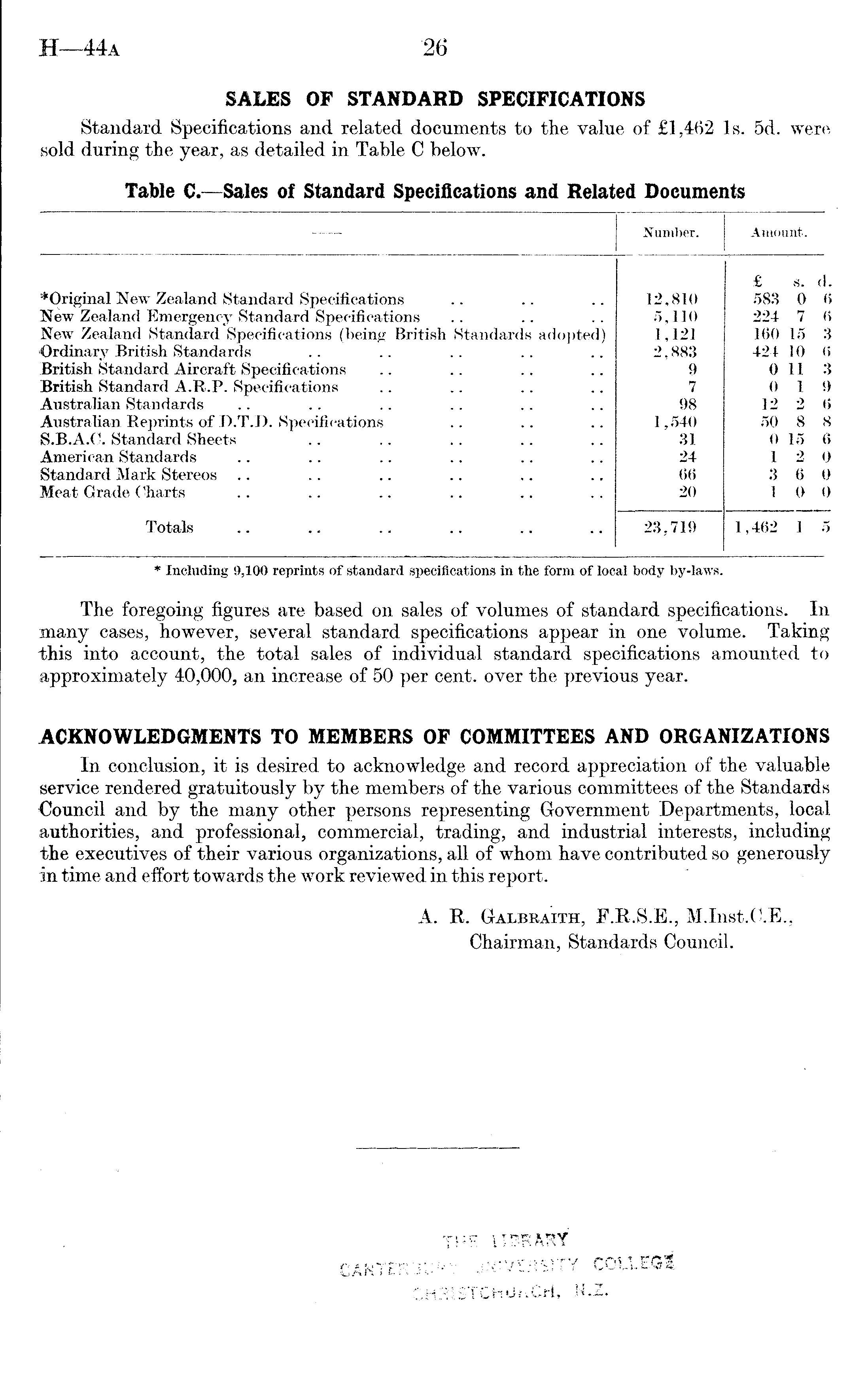 The foregoing figures are based on sales of volumes of standard specifications. In many cases, however, several standard specifications appear in one volume. Taking this into account, the total sales of individual standard specifications amounted to approximately 40,000, an increase of 50 per cent, over the previous year. ACKNOWLEDGMENTS TO MEMBERS OF COMMITTEES AND ORGANIZATIONS In conclusion, it is desired to acknowledge and record appreciation of the valuable service rendered gratuitously by the members of the various committees of the Standards Council and by the many other persons representing Government Departments, local authorities, and professional, commercial, trading, and industrial interests, including the executives of their various organizations, all of whom have contributed so generously in time and effort towards the work reviewed in this report. A. R. Galbraith, F.R.S.E., M.lnst.C.E., Chairman, Standards Council.