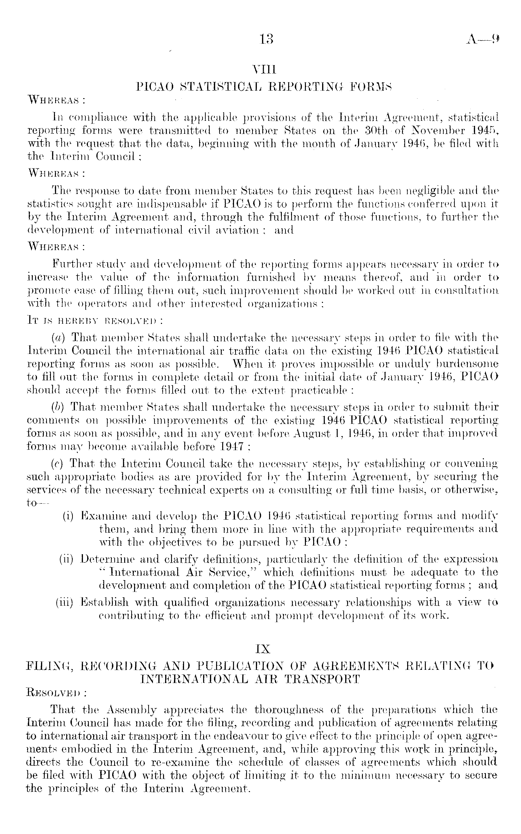 VIII PICAO STATISTICAL REPORTING FORMS Whereas : In compliance with the applicable provisions of the Interim Agreement, statistical reporting forms were transmitted to member States on the 30th of November 1945, with the request that the data, beginning with the month of January 1946, be filed with the Interim Council; Whereas : The response to date from member States to this request has been negligible and the statistics sought are indispensable if PICAO is to perform the functions conferred upon it by the Interim Agreement and, through the fulfilment of those functions, to further the development of international civil aviation ; and Whereas : Further study and development of the reporting forms appears necessary in order to increase the value of the information furnished by means thereof, and in order to promote ease of filling them out, such improvement should be worked out in consultation with the operators and other interested organizations ; It is hereby resolved : (a) That member States shall undertake the necessary steps in order to file with the Interim Council the international air traffic data on the existing 1946 PICAO statistical reporting forms as soon as possible. When it proves impossible or unduly burdensome to fill out the forms in complete detail or from the initial date of January 1946, PICAO should accept the forms filled out to the extent practicable ; (b) That member States shall undertake the necessary steps in order to submit their comments on possible improvements of the existing 1946 PICAO statistical reporting forms as soon as possible, and in any event before August 1, 1946, in order that improved forms may become available before 1947 ; (c) That the Interim Council take the necessary steps, by establishing or convening such appropriate bodies as are provided for by the Interim Agreement, by securing the services of the necessary technical experts on a consulting or full time basis, or otherwise, to — (i) Examine and develop the PICAO 1946 statistical reporting forms and modify them, and bring them more in line with the appropriate requirements and with the objectives to be pursued by PICAO ; (ii) Determine and clarify definitions, particularly the definition of the expression " International Air Service," which definitions must be adequate to the development and completion of the PICAO statistical reporting forms ; and (iii) Establish with qualified organizations necessary relationships with a view to contributing to the efficient and prompt development of its work. IX FILING, RECORDING AND PUBLICATION OF AGREEMENTS RELATING TO INTERNATIONAL AIR TRANSPORT Resolved : That the Assembly appreciates the thoroughness of the preparations which the Interim Council has made for the filing, recording and publication of agreements relating to international air transport in the endeavour to give effect to the principle of open agreements embodied in the Interim Agreement, and, while approving this wolk in principle, directs the Council to re-examine the schedule of classes of agreements which should be filed with PICAO with the object of limiting it to the minimum necessary to secure the principles of the Interim Agreement.