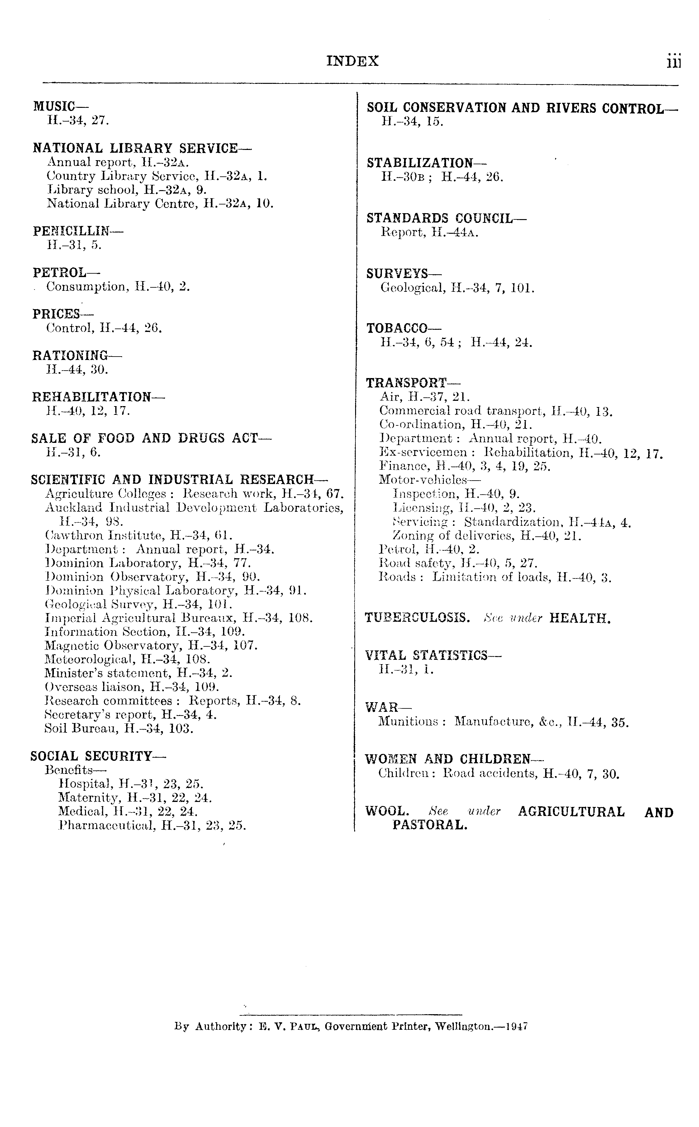MUSIC— H.-34, 27. NATIONAL LIBRARY SERVICE— Annual report, H.-32a. Country Library Service, H.-32a, 1. Library school, H.-32a, 9. National Library Centre, H.-32a, 10. PENICILLIN— H.-31, 5. PETROL—- . Consumption, H.-40, 2. PRICES— Control, H.-44, 26. RATIONING— H.-44, 30. REHABILITATION— H.-40, 12, 17. SALE OF FOOD AND DRUGS ACT— H.-31, 6. SCIENTIFIC AND INDUSTRIAL RESEARCH— Agriculture Colleges : Research work, H.-31, 67. Auckland Industrial Development Laboratories, H.-34, 98. Cawthron Institute, H.-34, 61. Department: Annual report, H.-34. Dominion Laboratory, H.-34, 77. Dominion Observatory, H.-34, 90. Dominion Physical Laboratory, H.-34, 91. Geological Survey, H.-34, 101. Imperial Agricultural Bureaux, H.-34, 108. Information Section, 11.-34, 109. Magnetic Observatory, H.-34, 107. Meteorological, H.-34, 108. Minister's statement, H.-34, 2. Overseas liaison, H.-34, 109. Research committees : Reports, H.-34, 8. SOCIAL SECURITY— Benefits— Hospital, H.-31, 23, 25. Maternity, H.-31, 22, 24. Medical, H.-31, 22, 24. Pharmaceutical, H.-31, 23, 25.