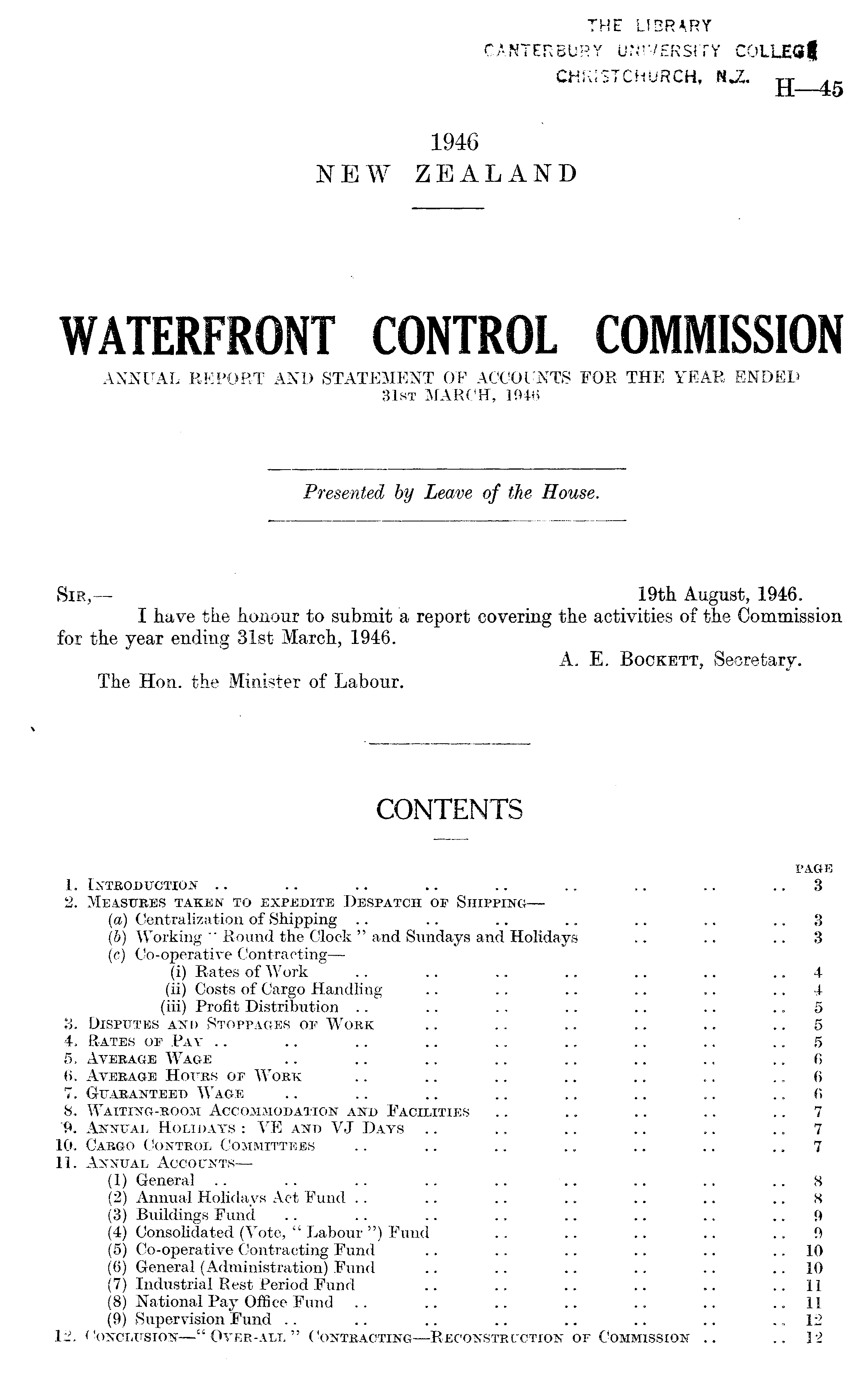 PAGE 1. Introduction .. .. .. .. .. .. .. .. ..3 2. Measures taken to expedite Despatch op Shipping—(a) Centralization of Shipping .. .. .. .. .. .. 3 (b) Working " Round the Clock " and Sundays and Holidays .. .. .. 3 (c) Co-operative Contracting—(i) Rates of Work .. .. .. .. .. .. ..4 (ii) Costs of Cargo Handling .. .. .. .. .. 4 (iii) Profit Distribution .. .. .. .. .. .. 5 3. Disputes and Stoppages of Work .. .. .. .. .. 5 4. Rates op PAY .. .. .. .. .. .. .. .. 5 5. Average WAGE .. .. .. .. .. .. .. 6 6. Average Hours or Work .. .. .. .. .. .. 6 7. Guaranteed Wage .. .. .. .. .. .. .. f> 8. Waiting-room Accommodation and Facilities .. .. .. .. 7 "9. Annual Holidays : VE and YJ Days .. .. .. .. .. 7 10. Cargo Control Committees .. .. .. .. .. .. 7 11. Annual Accounts—(l) General .. .. .. .. .. .. .. ..8 (2) Annual Holidays Act Fund .. .. .. .. .. .. 8 (3) Buildings Fund .. .. .. .. .. .. .. 9 (4) Consolidated (Vote, " Labour ") Fund .. .. .. .. .. 9 (5) Co-operative Contracting Fund .. .. .. .. .. 10 (6) General (Administration) Fund .. .. .. .. .. 10 (7) Industrial Rest Period Fund .. .. .. .. .. ..11 (8) National Pay Office Fund .. .. .. .. .. .. ..11 (9) Supervision Fund .. .. .. .. .. .. .. 12 12. Conclusion—" Over-all " Contracting—Reconstruction of Commission .. .. 12