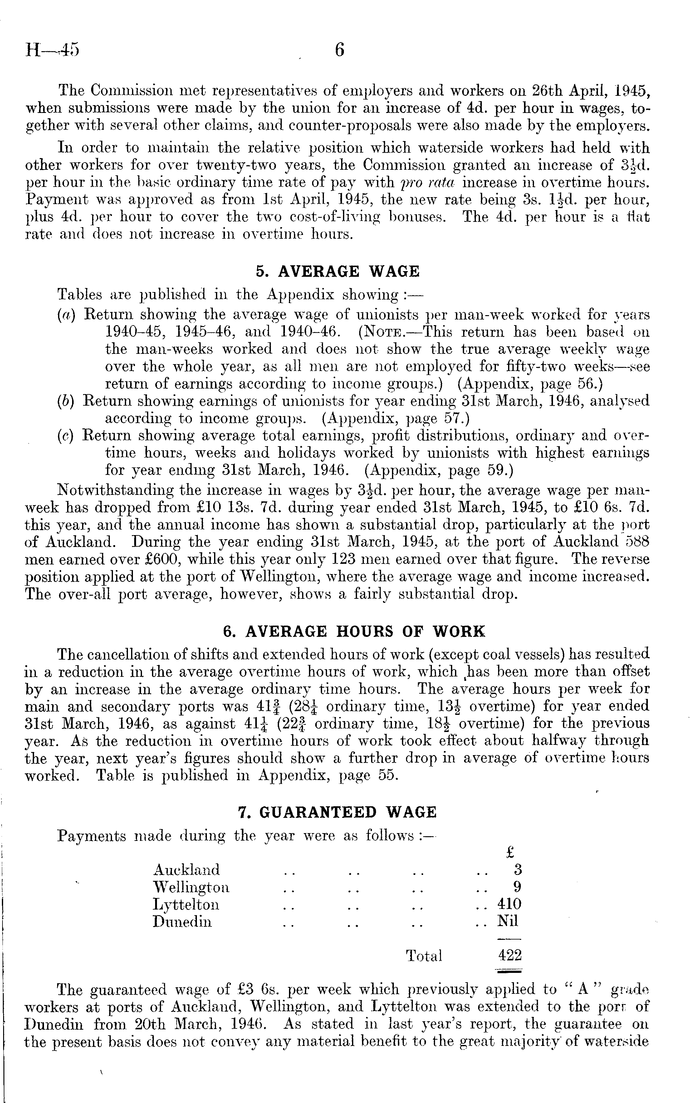 The Commission met representatives of employers and workers on 26th April, 1945, when submissions were made by the union for an increase of 4d. per hour in wages, together with several other claims, and counter-proposals were also made by the employers. In order to maintain the relative position which waterside workers had held with other workers for over twenty-two years, the Commission granted an increase of 3Jd. per hour in the basic ordinary time rate of pay with pro rata increase in overtime hours. Payment was approved as from Ist April, 1945, the new rate being 3s. l|d. per hour, plus 4d. per hour to cover the two cost-of-living bonuses. The 4d. per hour is a flat rate and does not increase in overtime hours. 5. AVERAGE WAGE Tables are published in the Appendix showing : (a) Return showing the average wage of unionists per man-week worked for years 1940-45, 1945-46, and 1940-46. (Note. —This return has been based on the man-weeks worked and does not show the true average weekly wage over the whole year, as all men are not employed for fifty-two weeks —see return of earnings according to income groups.) (Appendix, page 56.) (b) Return showing earnings of unionists for year ending 31st March, 1946, analysed according to income groups. (Appendix, page 57.) (c) Return showing average total earnings, profit distributions, ordinary and overtime hours, weeks and holidays worked by unionists with highest earnings for year ending 31st March, 1946. (Appendix, page 59.) Notwithstanding the increase in wages by 3£d. per hour, the average wage per manweek has dropped from £lO 13s. 7d. during year ended 31st March, 1945, to £lO 6s. 7d. this year, and the annual income has shown a substantial drop, particularly at the port of Auckland. During the year ending 31st March, 1945, at the port of Auckland 588 men earned over £6OO, while this year only 123 men earned over that figure. The reverse position applied at the port of Wellington, where the average wage and income increased. The over-all port average, however, shows a fairly substantial drop. 6. AVERAGE HOURS OF WORK The cancellation of shifts and extended hours of work (except coal vessels) has resulted in a reduction in the average overtime hours of work, which has been more than offset by an increase in the average ordinary time hours. The average hours per week for main and secondary ports was 41f (28| ordinary time, 13£ overtime) for year ended 31st March, 1946, as against 41J (22f ordinary time, 18| overtime) for the previous year. As the reduction in overtime hours of work took effect about halfway through the year, next year's figures should show a further drop in average of overtime hours worked. Table is published in Appendix, page 55. 7. GUARANTEED WAGE Payments made during the year were as follows £ Auckland .. .. .. 3 Wellington .. .. .. 9 Lyttelton .. .. .. .. 410 Dunedin .. .. .. .. Nil Total 422 The guaranteed wage of £3 6s. per week which previously applied to "A" grade workers at ports of Auckland, Wellington, and Lyttelton was extended to the port of Dunedin from 20th March, 1946. As stated in last year's report, the guarantee on the present basis does not convey any material benefit to the great majority'of waterside \