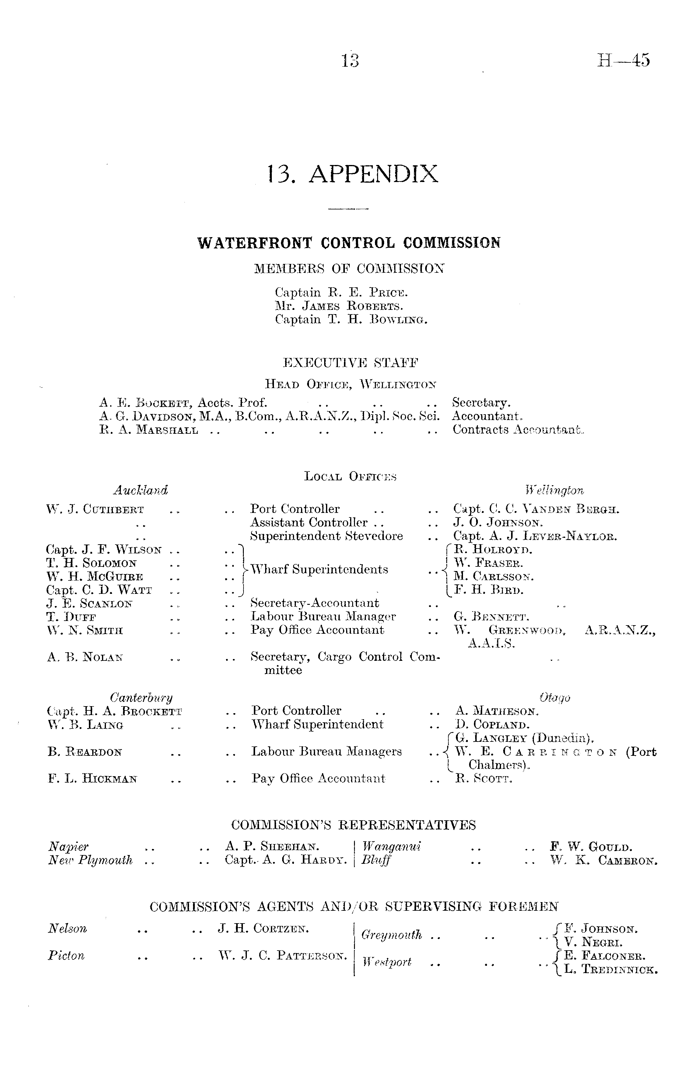 WATERFRONT CONTROL COMMISSION MEMBERS OP COMMISSION Captain R. E. Price. Mr. Jambs Roberts. Captain T. H. Bowling. EXECUTIVE STAPP Head Office, Wellington A. E. Bockett, Accts. Prof. .. .. .. Secretary. A. G. Davidson, M.A., 8.C0m., A.R.A.N.Z., Dipl. Soe. Sci. Accountant. R. A. Marshall .. .. .. .. .. Contracts Accountant. Local Offices Auckland Wellington W. J. CtrTHBERT .. .. Port Controller .. .. Capt. C. C. Vanden Bergh. Assistant Controller .. .. J. O. Johnson. Superintendent Stevedore .. Capt. A. J. Lever-Naylor. Capt. J. P. Wilson .. .. 1 fR. Holroyd. T.H.Solomon .. .. ! w , , Q JW. Praser. W. H. McGutre .. .. f- Wharf Superintendents ■• M . Carlsson. Capt. C. D. Watt .. .. J - H. Bird. J. E. Scanlon .. .. Secretary-Accountant T. Duff .. .. Labour Bureau Manager .. G. Bennett. W. N. Smith .. .. Pay Office Accountant .. W. Greenwood, A.R.A.N.Z., A.A.I.S. A. B. Nolan .. .. Secretary, Cargo Control Committee Canterbury Otago Capt. H. A. Brockett .. Port Controller .. .. A. Matheson. W. B. Laing .. .. Wharf Superintendent .. D. Copland. f G. Langley (Dunedin). B. Reardon .. .. Labour Bureau Managers .. W. E. Carrington (Port Chalmers). P. L. Hickman .. .. Pay Office Accountant .. R. Scott. COMMISSION'S REPRESENTATIVES Napier .. A. P. Sheehan. I Wanganui .. .. F. W. Gould. New Plymouth .. .. Capt. A. G. Hardy, j Bluff .. .. W. K. Cameron. COMMISSION'S AGENTS AND/OR SUPERVISING FOREMEN Nelson .. .. J. H. Cortzen. /F.Johnson. Greymouth ( V . Negri. Picton .. .. W. J. C. Patterson. txt . . /E. Falconer. W estport .. .. .. < T m r \_L„ Tredinnick.
