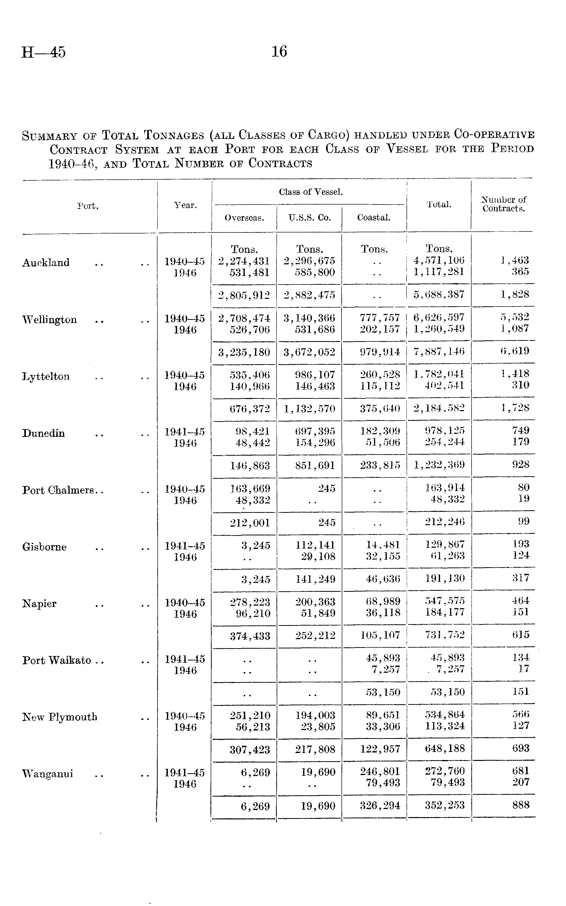 Summary of Total Tonnages (all Classes of Cargo) handled under Co-operative Contract System at each Port for each Class of Vessel for the Period 1940-46, and Total Number of Contracts