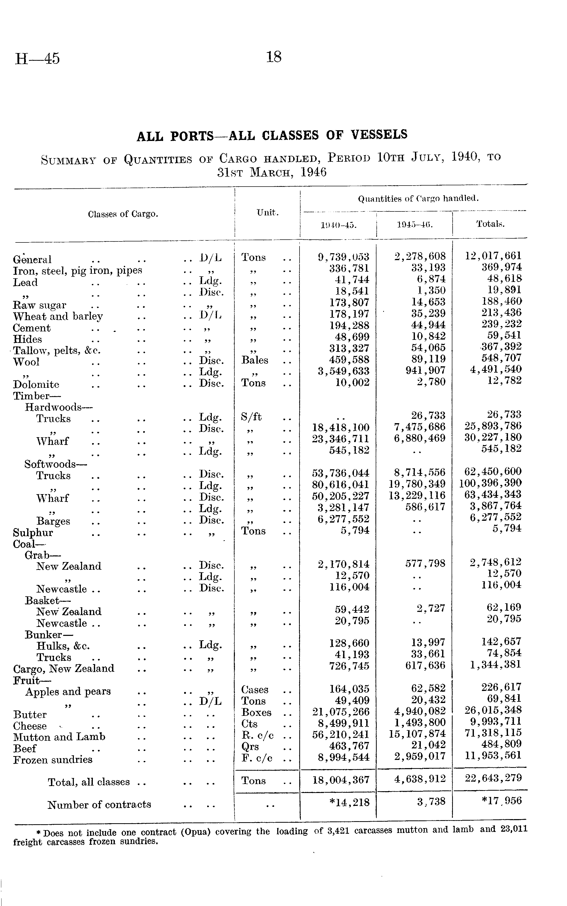 Classes of Cargo. Unit. Quantities of Cargo handled. 1940-45. 1945-46. Totals. General .. D/L Tons 9,739,053 2,278,608 12,017,661 Iron, steel, pig iron, pipes 99 • • 336,781 33,193 369,974 Lead .. • - Ldg. 99 • • 41,744 6,874 48,618 .. Disc. 99 • * 18,541 1,350 19,891 Raw sugar 99 173,807 14,653 188,460 Wheat and barley .. D/L 99 178,197 35,239 213,436 Cement 99 194,288 44,944 239,232 Hides 99 • • 48,699 10,842 59,541 Tallow, pelts, &c. • • 99 313,327 54,065 •367,392 Wool .. Disc. Bales 459,588 89,119 548,707 .. Ldg. 3,549,633 941,907 4,491,540 Dolomite .. Disc. Tons 10,002 2,780 12,782 Timber — Hardwoods — 26,733 Trucks .. Ldg. S/ft 26,733 .. Disc. 18,4i8,100 7,475,686 25,893,786 Wharf 23,346,711 6,880,469 30,227,180 Ldg. „ 545,182 545,182 Softwoods— 62,450,600 Trucks .. Disc. 53,736,044 8,714,556 .. Ldg. 80,616,041 19,780,349 100,396,390 Wharf .. Disc. 50,205,227 13,229,116 63,434,343 .. Ldg. 3,281,147 586,617 3,867,764 Barges .. Disc. 6,277,552 6,277,552 Sulphur Tons 5,794 5,794 CoalGrab — 2,748,612 12,570 New Zealand .. Disc. .. Ldg. 99 • • 99 • • 2,170,814 12,570 577,798 Newcastle .. Disc. >9 • • 116,004 116,004 Basket — 62,169 New' Zealand 99 99 59,442 2,727 Newcastle 99 99 • • 20,795 20,795 Bunker — 142,657 Hulks, &c. .. Ldg. 99 • • 128,660 13,997 Trucks 99 • • 41,193 33,661 74,854 Cargo, New Zealand „ 99 726,745 617,636 1,344,381 Fruit — Apples and pears Cases 164,035 62,582 226,617 D/L Tons 49,409 20,432 69,841 Butter Boxes .. 21,075,266 4,940,082 26,015,348 Cheese Cts 8,499,911 1,493,800 9,993,711 Mutton and Lamb R.c/c .. 56,210,241 15,107,874 71,318,115 Beef Qrs 463,767 21,042 484,809 Frozen sundries F. c/c 8,994,544 2,959,017 11,953,561 Total, all classes .. Tons 18,004,367 4,638,912 22,643,279 Number of contracts *14,218 3,.738 *17,956 * Does not include one contract (Opua) covering the loading of 3,421 carcasses mutton and lamb and 23,011 freight carcasses frozen sundries.