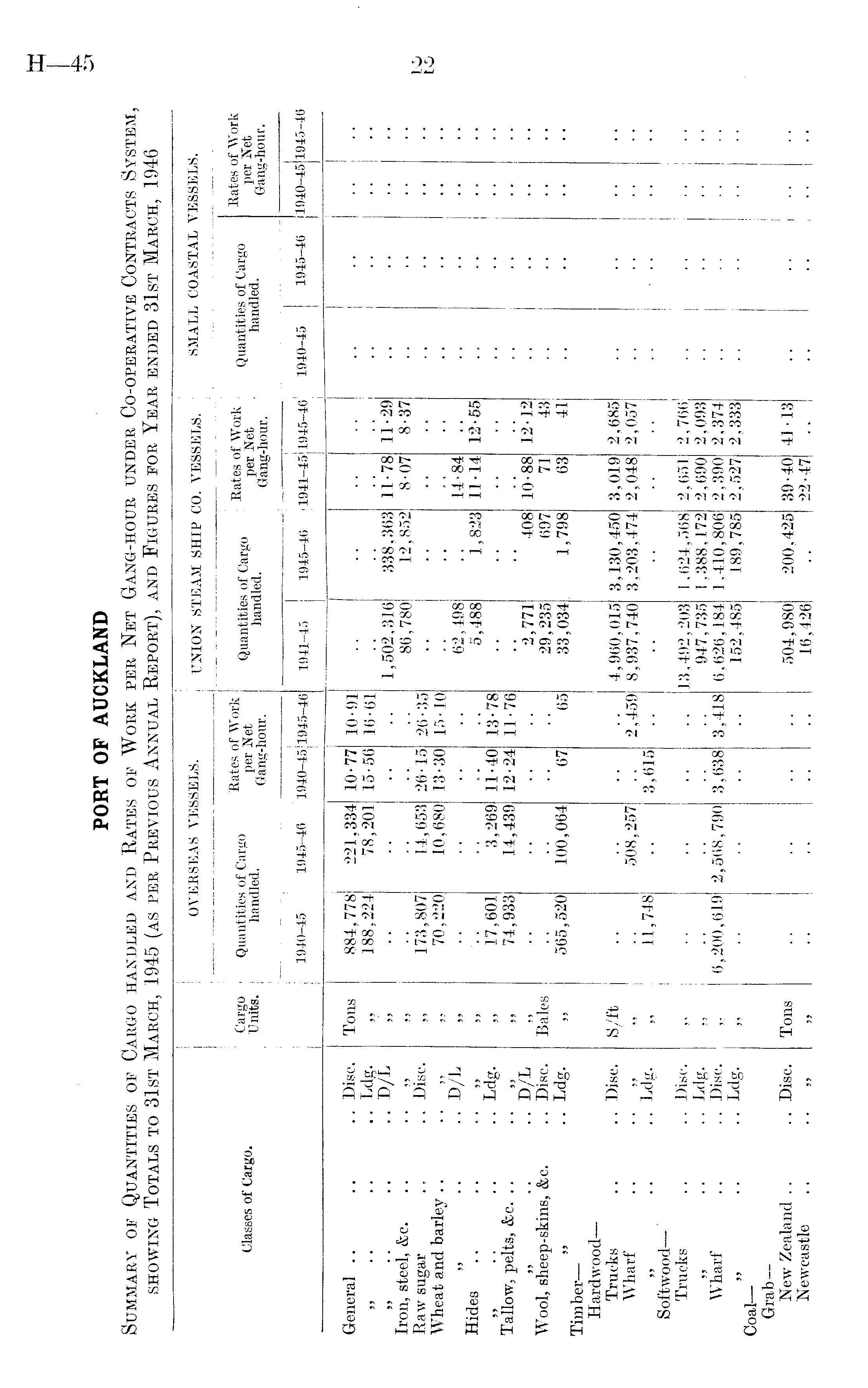 PORT OF AUCKLAND Summary of Quantities of Cargo handled and Rates of Work per Net Gang-hour under Co-operative Contracts System, showing Totals to 31st March, 1945 (as per Previous Annual Report), and Figures for Year ended 31st March, 1946