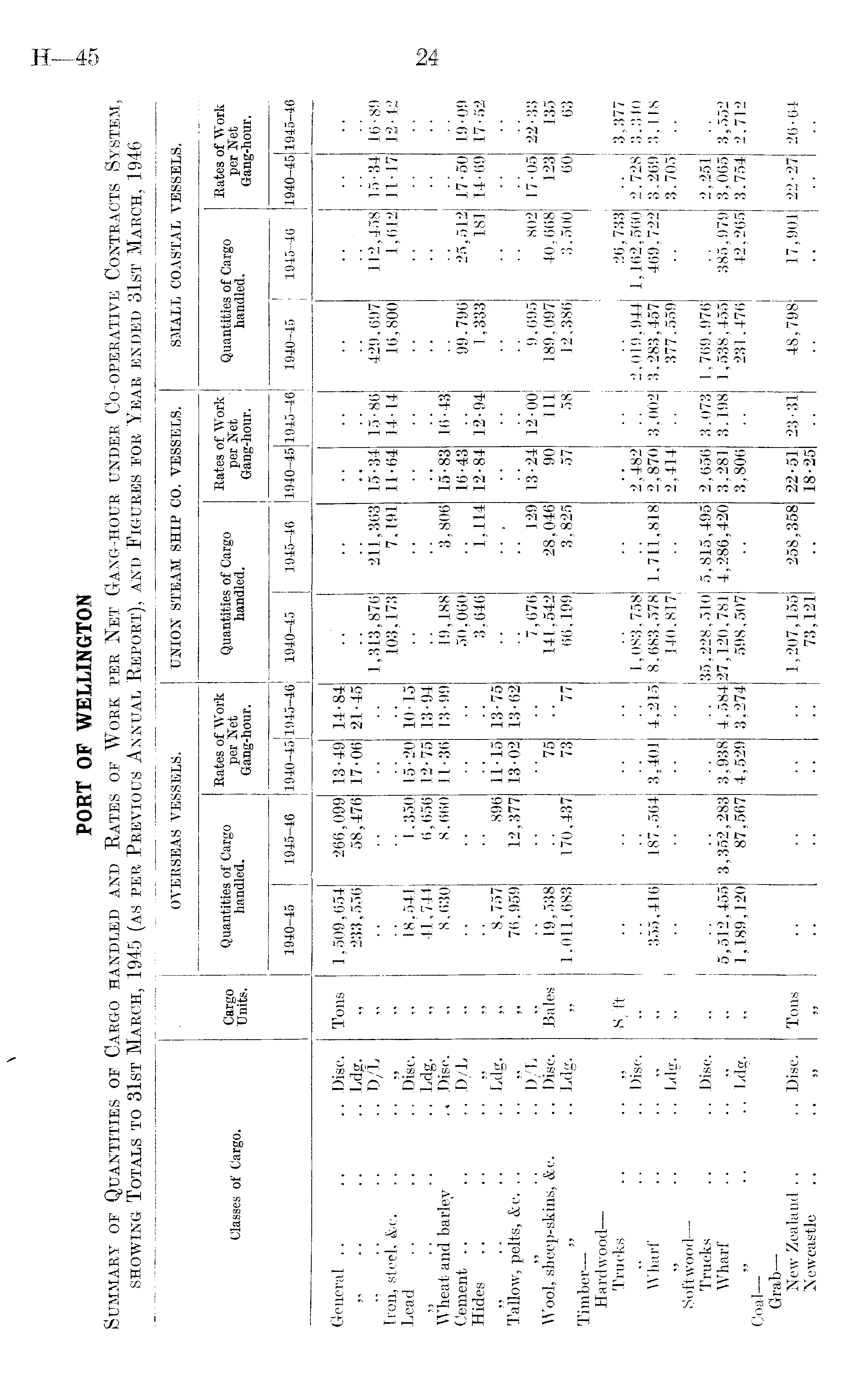 PORT OF WELLINGTON Summary of Quantities of Cargo handled and Rates of Work per Net Gang-hour under Co-operative Contracts System, showing Totals to 31st March, 1945 (as per Previous Annual Report), and Figures for Year ended 31st March, 1946