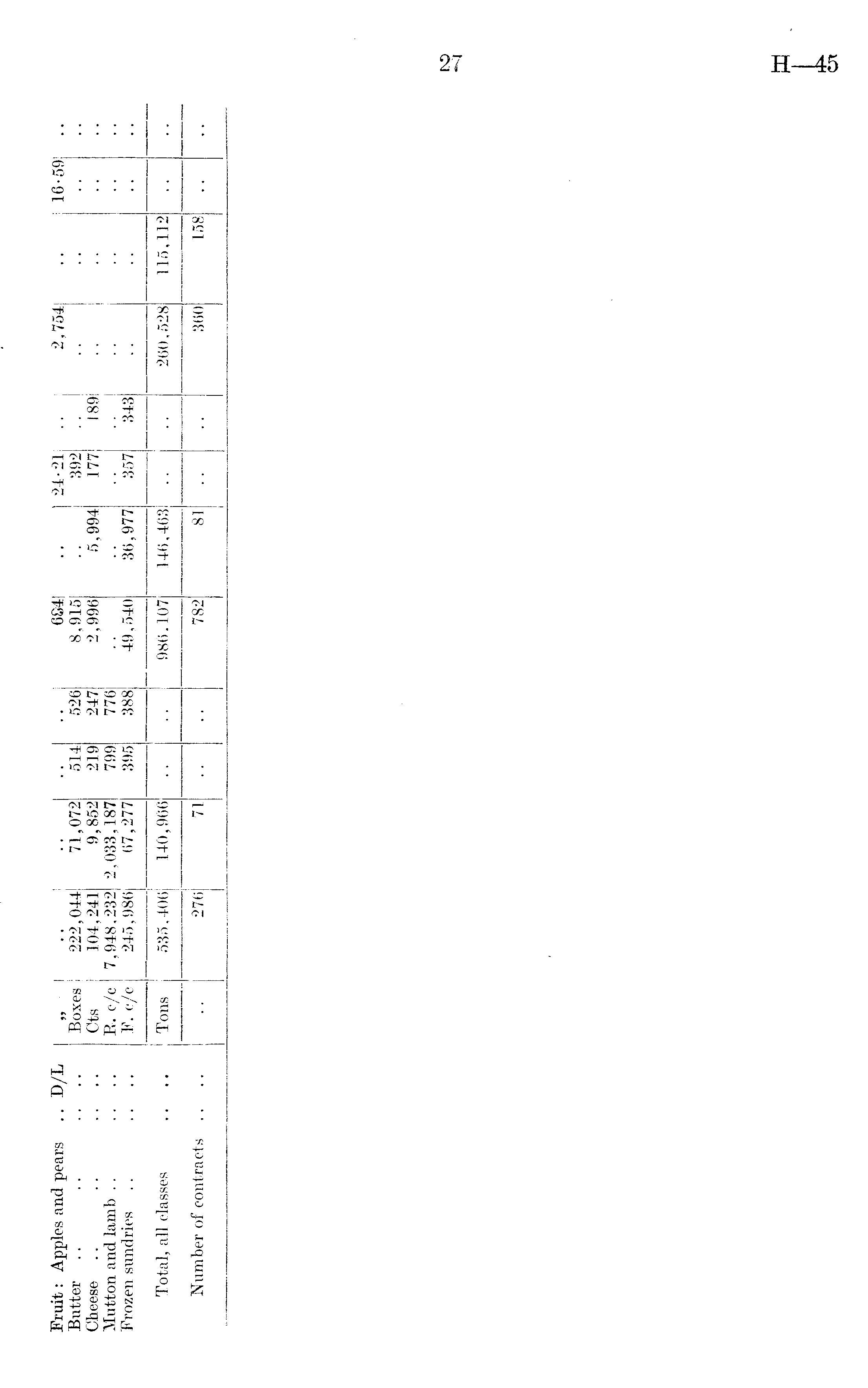 Fruit: Apples and pears .. D/L „ .. .. .. .. 6841 .. 24-21 .. 2,754 .. 16-59 Butter .. .. Boxes 222,044 71,072 514 526 8,915 .. 392 .. Cheese .. .. .... Cts 104,241 9,852 219 247 2,996 5,994 177 189 Mutton and lamb .. .. .. R. c/c 7,948,232 2,033,187 799 776 Frozen sundries .. .... F. c/c 245,986 67,277 395 388 49,540 36,977 357, 343 Total, all classes .. .. Tons 535,406 140,966 .. .. 986,107 146,463 .. .. 260,528 115,112 .. Number of contracts .. .. .. 276 71 .. .. 782 81 .. .. 360 158
