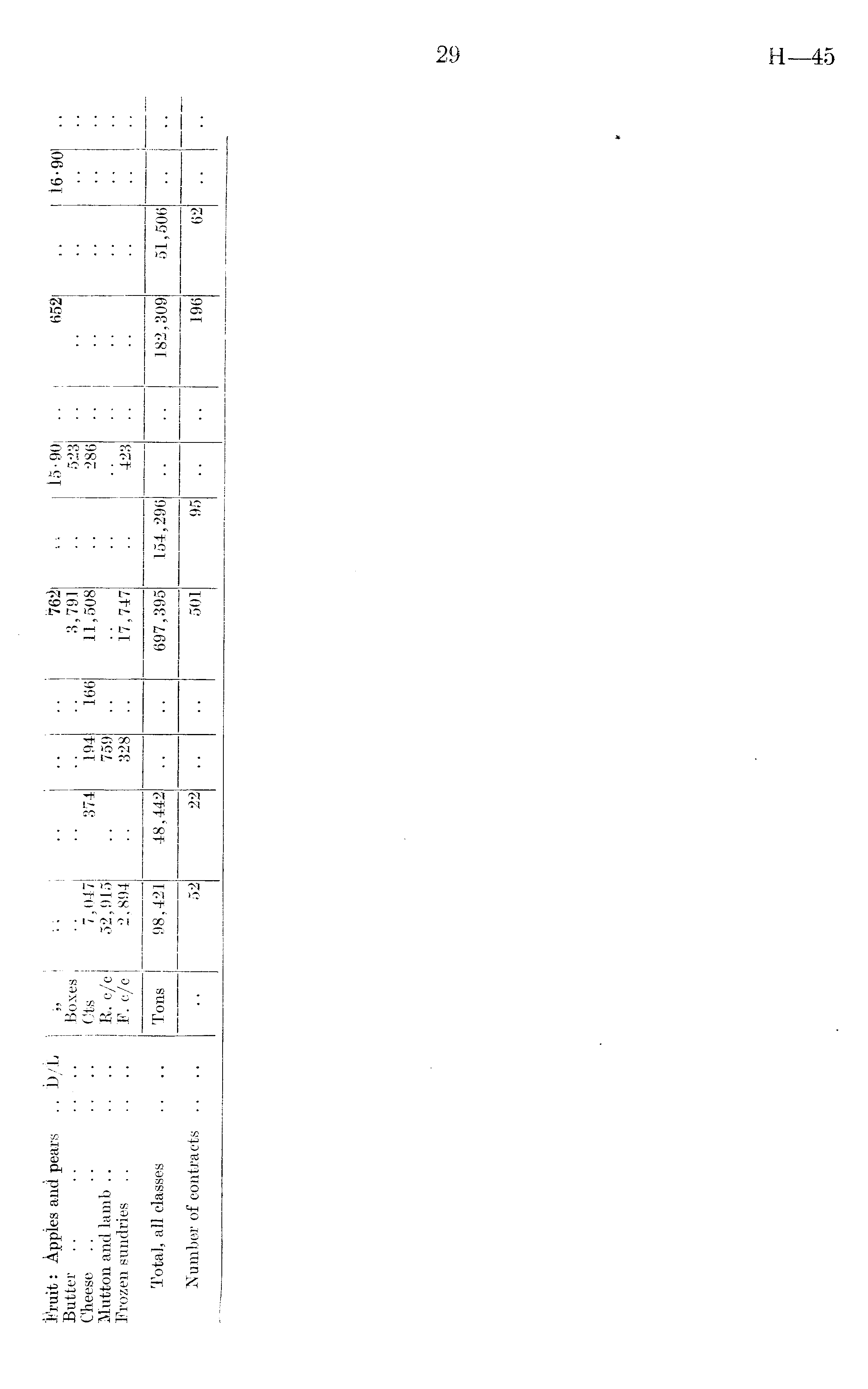 i'ruit: Appies and pears .. jD/L Butter .. .. .., .. Cheese .. .. .... Mutton and lamb Frozen sundries 99 Boxes Ots R. c/c P. c/c 7,047 52,915 2,894 374 194 759 328 166 762 3,791 11,508 17,747 15-90 523 286 423 652 16-90 Total, all classes Tons 98,421 48,442 697,395 154,296 182,309 51,506 Number of contracts .. •• 52 22 501 95 196 62