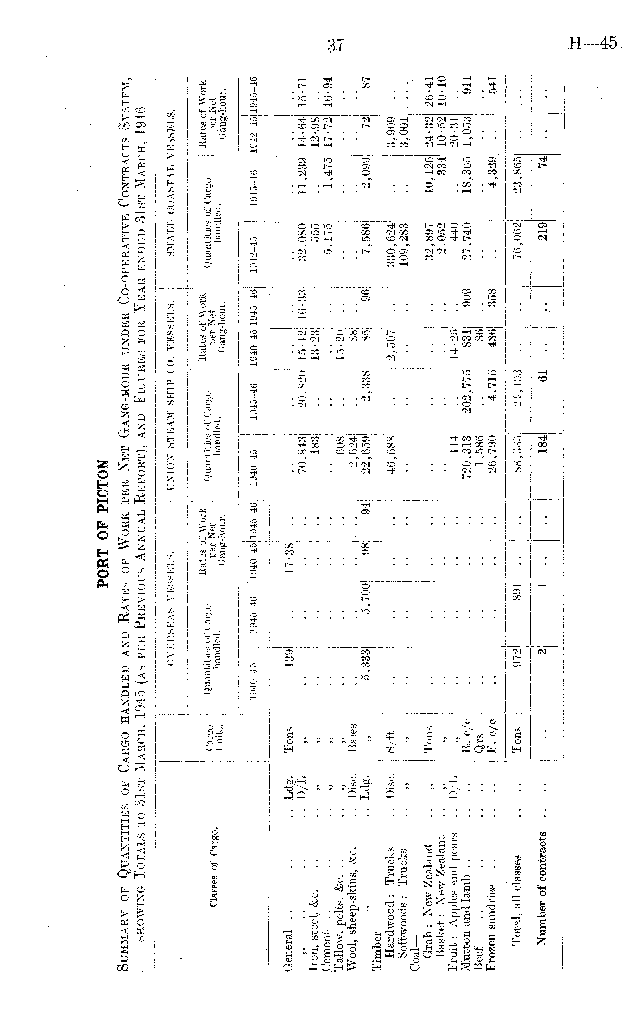 PORT OF PICTON Summary of Quantities of Cargo handled and Rates of Work per Net Gang-hour under Co-operative Contracts System, showing Totals to 31st March, 1945 (as per Previous Annual Report), and Figures for Year ended 31st March, 1946