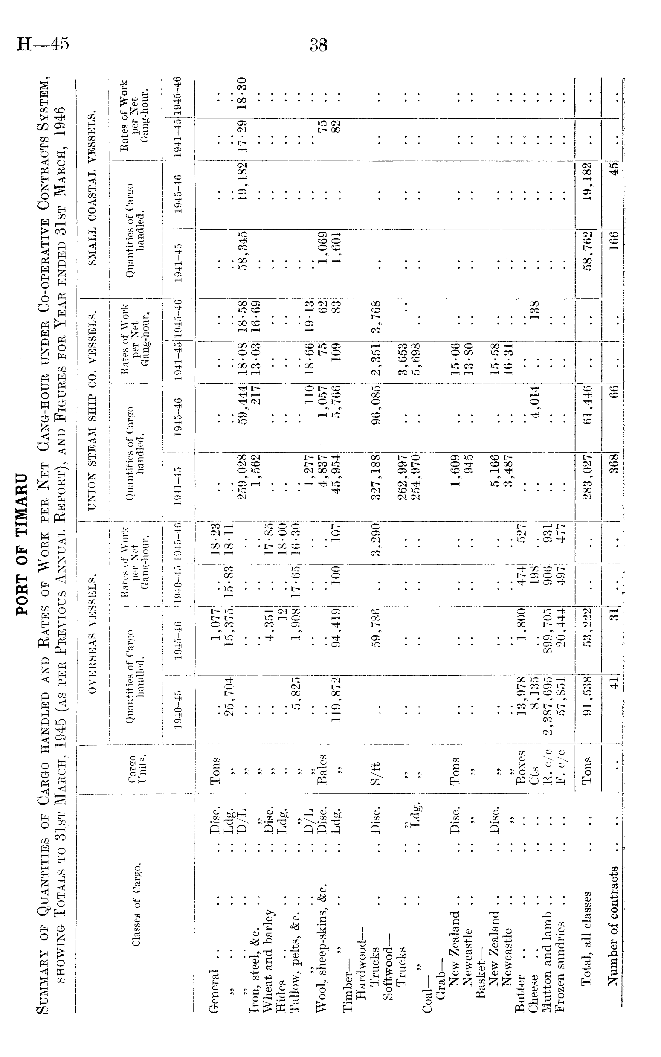 PORT OF TIMARU Summary or Quantities of Cargo handled and Rates of Work per Net Gang-hour under Co-operative Contracts System, showing Totals to 31st March, 1945 (as per Previous Annual Report), and Figures for Year ended 31st March, 1946