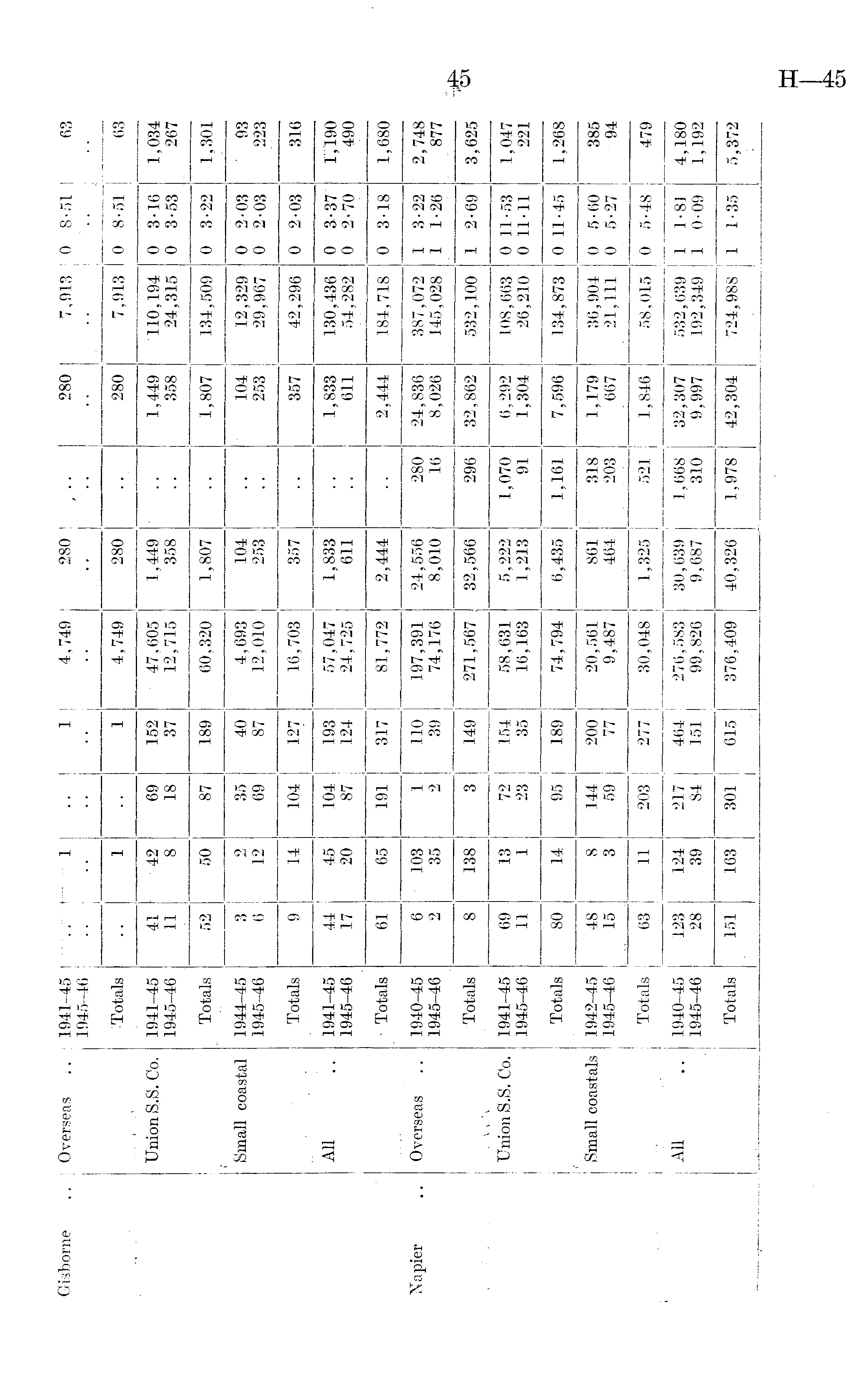 Gisborne Overseas <. 1941-45 1 1 4,749 280 280 7,913 00 0 63 1945-46 •Totals 1 1 4,749 280 280 7,913 0 8-51 63 Union S.S. Co. 1941-45 41 -42 69 152 47,605 1,449 1,449 110,194 0 3-16 1,034 1945-46 11 8 18 37 12,715 358 358 24,315 0 3-53 267 Totals 52 50 87 189 60,320 1,807 1,807 134,509 0 3-22 1,301 Small coastal 1944-45 3 2 35 40 4,693 104 104 12,329 0 2-03 93 1945-46 6 12 69 87 12,010 253 253 29,967 0 2-03 223 Totals 9 14 104 127 16,703 357 357 42,296 0 2-03 316 All 1941-45 44 45 104 193 57,047 1,833 1,833 130,436 0 3-37 1,190 1945-46 17 20 87 124 24,725 611 611 54,282 0 2-70 490 ■ Totals 61 65 191 317 81,772 2,444 2,444 184,718 0 3-18 l-,-680 Napier Overseas 1940-45 6 103 1 110 197,391 24,556 280 24,836 387,072 1 3-22 ' 2,748 1945-46 2 35 % 39 74,176 8,010 16 8,026 145,028 1 1-26 ' 877 . \ v ' V Totals 8 138 3 149 271,567 32,566 296 32,862 532,100 1 2-69 3,625 Union S.S. Co. 1941-45 69 13 72 154 58,631 5,222 1,070 6,292 108,663 0 11-53 1,047 1945-46 11 1 23 35 16,163 1,213 91 1,304 26,210 0 11-11 221 Totals 80 14 95 189 74,794 6,435 1,161 7,596 134,873 0 11-45 1,268 Small coastals 1942-45 48 8 144 200 20,561 861 318 1,179 36,904 0 5-60 385 1945-46 15 3 59 77 9,487 464 203 667 21,111 0 5-27 94 Totals 63 11 203 277 30,048 1,325 521 1,846 58,015 0 5-48 479 All 1940-45 123 124 217 464 276,583 30,639 1,668 32,307 532,639 1 1-81 4,180 1945-46 28 39 84 151 99,826 9,687 310 9,997 192,349 1 0-09 1,192 Totals 151 163 301 615 376,409 40,326 1,978 42,304 724,988 1 1-35 5,372