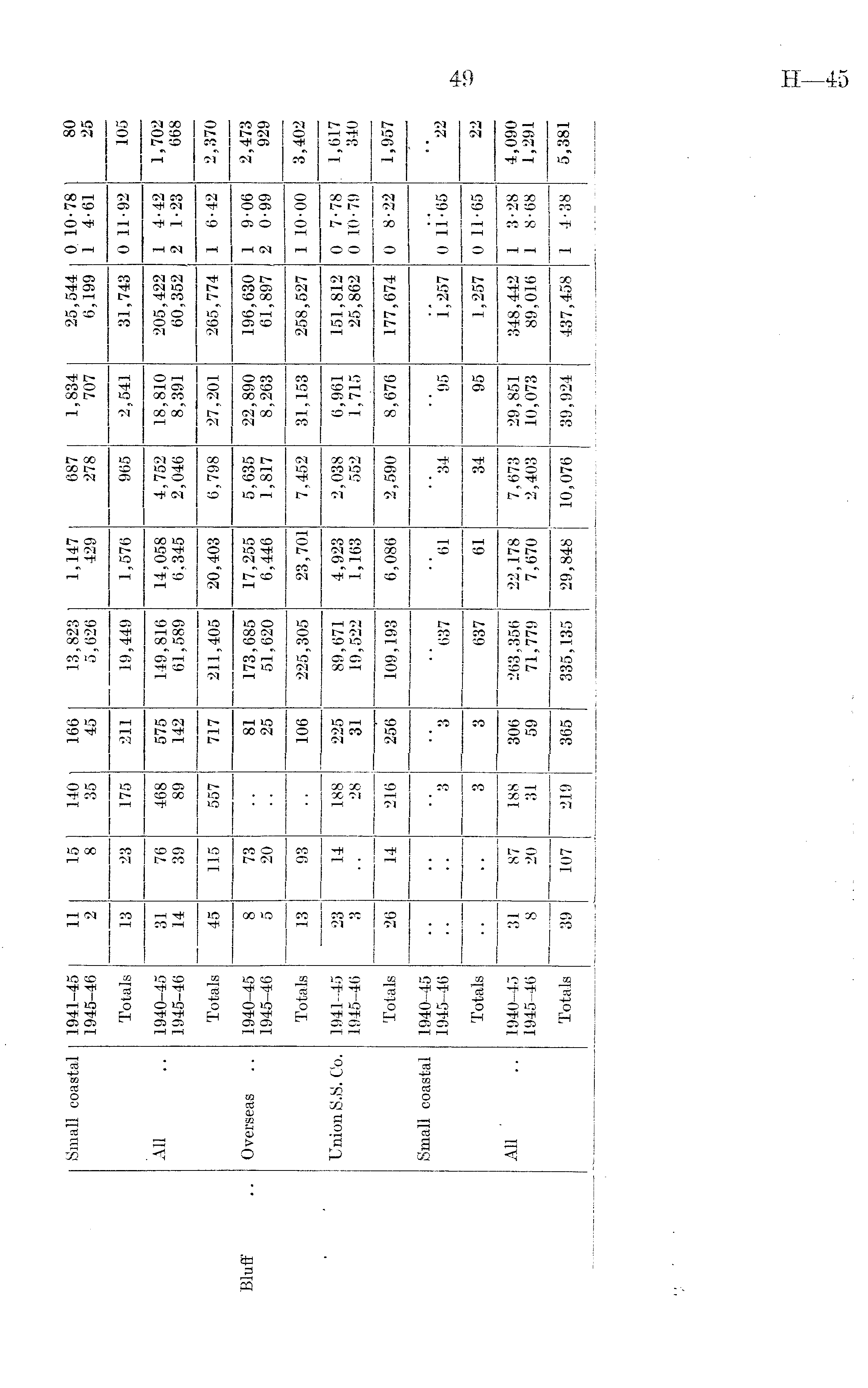 « Small coastal 1941-45 1945-46 11 2 15 8 140 35 166 45 13,823 5,626 1,147 429 687 278 1,834 707 25,544 6,199 0 10-78 1 4-61 80 25 Totals 13 23 175 211 19,449 1,576 965 2,541 31,743 0 11-92 105 All 1940-45 1945-46 31 14 76 39 468 89 575 142 149,816 61,589 14,058 6,345 4,752 2,046 18,810 8,391 205,422 60,352 1 4-42 2 1-23 1,702 668 Totals 45 115 557 717 211,405 20,403 6,798 27,201 265,774 1 6-42 2,370 Bluff Overseas 1940-45 1945-46 8 5 73 20 81 25 173,685 51,620 17,255 6,446 5,635 1,817 22,890 8,263 196,630 61,897 1 9-06 2 0-99 2,473 929 Totals 13 93 106 225,305 23,701 7,452 31,153 258,527 1 10-00 3,402 Union S.S. Co. 1941-45 1945-46 23 3 14 188 28 225 31 89,671 19,522 4,923 1,163 2,038 552 6,961 1,715 151,812 25,862 0 7-78 0 10-79 1,617 340 Totals 26 14 216 256 109,193 6,086 2,590 8,676 177,674 0 8-22 1,957 Small coastal 1940-45 1945-46 ' 3 "3 ' 637 "61 34 "95 i *, 257 0 li- 65 "22 Totals 3 3 637 61 34 95 1,257 0 11-65 22 All 1940-45 1945-46 31 8 87 20 188 31 306 59 263,356 71,779 22,178 7,670 7,673 2,403 29,851 10,073 348,442 89,016 1 3-28 1 8-68 4,090 1,291 Totals 39 107 219 365 335,135 29,848 10,076 39,924 437,458 1 4-38 5,381