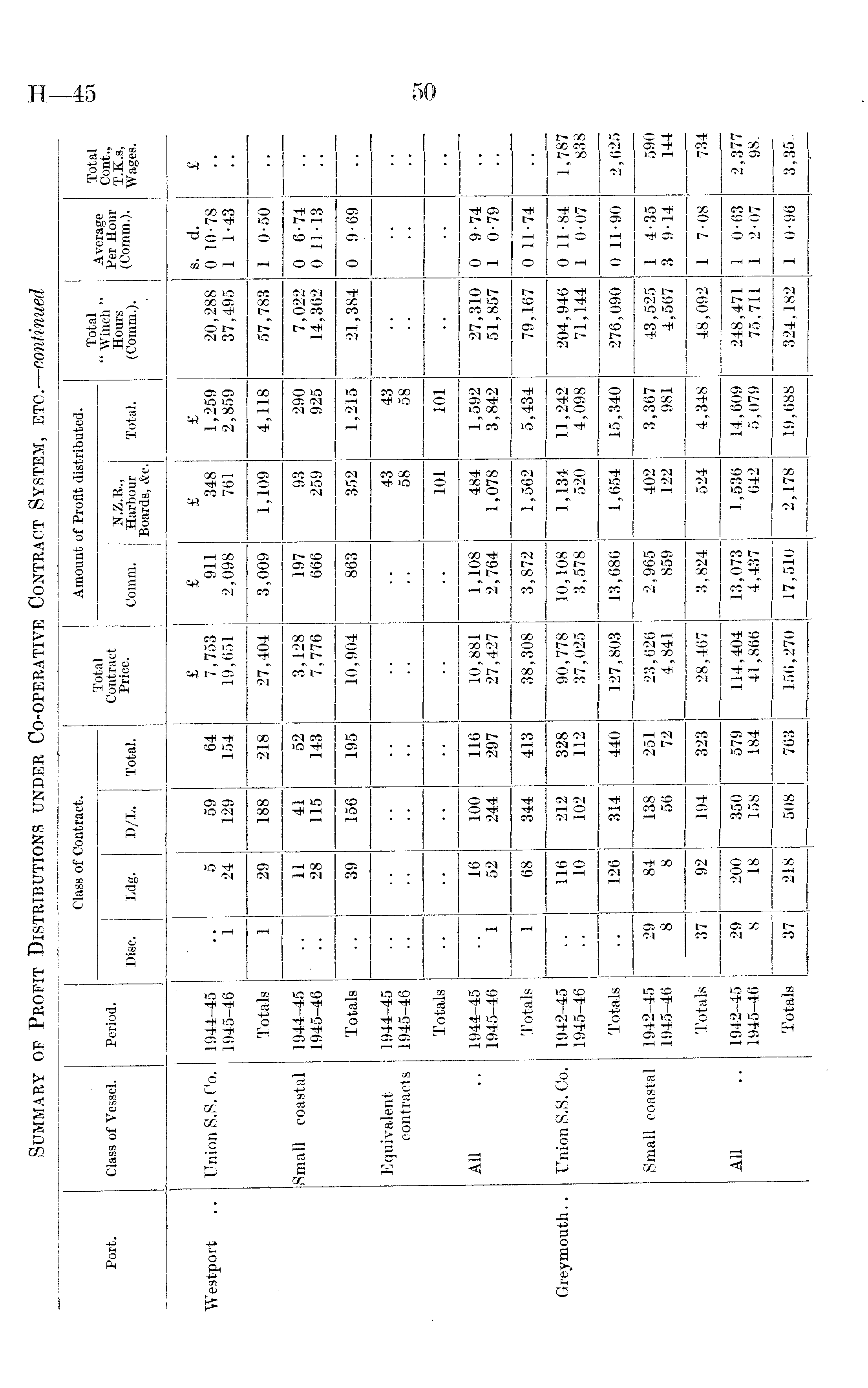 Class of Contract. Total Contract Price. Amount of Profit distributed. Total Average Per Hour (Comm.). Total Port. Class of Vessel. Period. Disc. Ldg. D/L. Total. Comm. N.Z.R., Harbour Boards, &c. Total. " Winch " Hours (Comm.). Cont., T.K.s, Wages. Westport Union S.S. Co. 1944-45 1945-46 "l 5 24 59 129 64 154 £ 7,753 19,651 £ 911 2,098 £ 348 761 £ 1,259 2,859 20,288 37,495 s. d. 0 10-78 1 1-43 £ Totals 1 29 188 218 27,404 3,009 1,109 4,118 57,783 1 0-50 Small coastal 1944-45 1945-46 11 28 41 115 52 143 3,128 7,776 197 666 93 259 290 925 7,022 14,362 0 6-74 0 11-13 Totals 39 156 195 10,904 863 352 1,215 21,384 0 9-69 Equivalent contracts 1944-45 1945-46 43 58 43 58 Totals 101 101 All 1944-45 1945-46 "l 16 52 100 244 116 297 10,881 27,427 1,108 2,764 484 1,078 1,592 3,842 27,310 51,857 0 9-74 1 0-79 Totals 1 68 344 413 38,308 3,872 1,562 5,434 79,167 0 11-74 Greymouth.. Union S.S. Co. 1942-45 1945-46 116 10 212 102 328 112 90,778 37,025 10,108 3,578 1,134 520 11,242 4,098 204,946 71,144 0 11-84 1 0-07 1,787 838 Totals 126 314 440 127,803 13,686 1,654 15,340 276,090 0 11-90 2,625 Small coastal 1942-45 1945-46 29 8 84 8 138 56 251 72 23,626 4,841 2,965 859 402 122 3,367 981 43,525 4,567 1 4-35 3 9-14 590 144 Totals 37 92 194 323 28,467 3,824 524 4,348 48,092 1 7-08 734 All 1942-45 1945-46 29 8 200 18 350 158 579 184 114,404 41,866 13,073 4,437 1,536 642 14,609 5,079 248,471 75,711 1 0-63 1 2-07 2,377 98. Totals 37 218 508 763 156,270 17,510 2,178 19,688 324,182 1 0-96 3,35.
