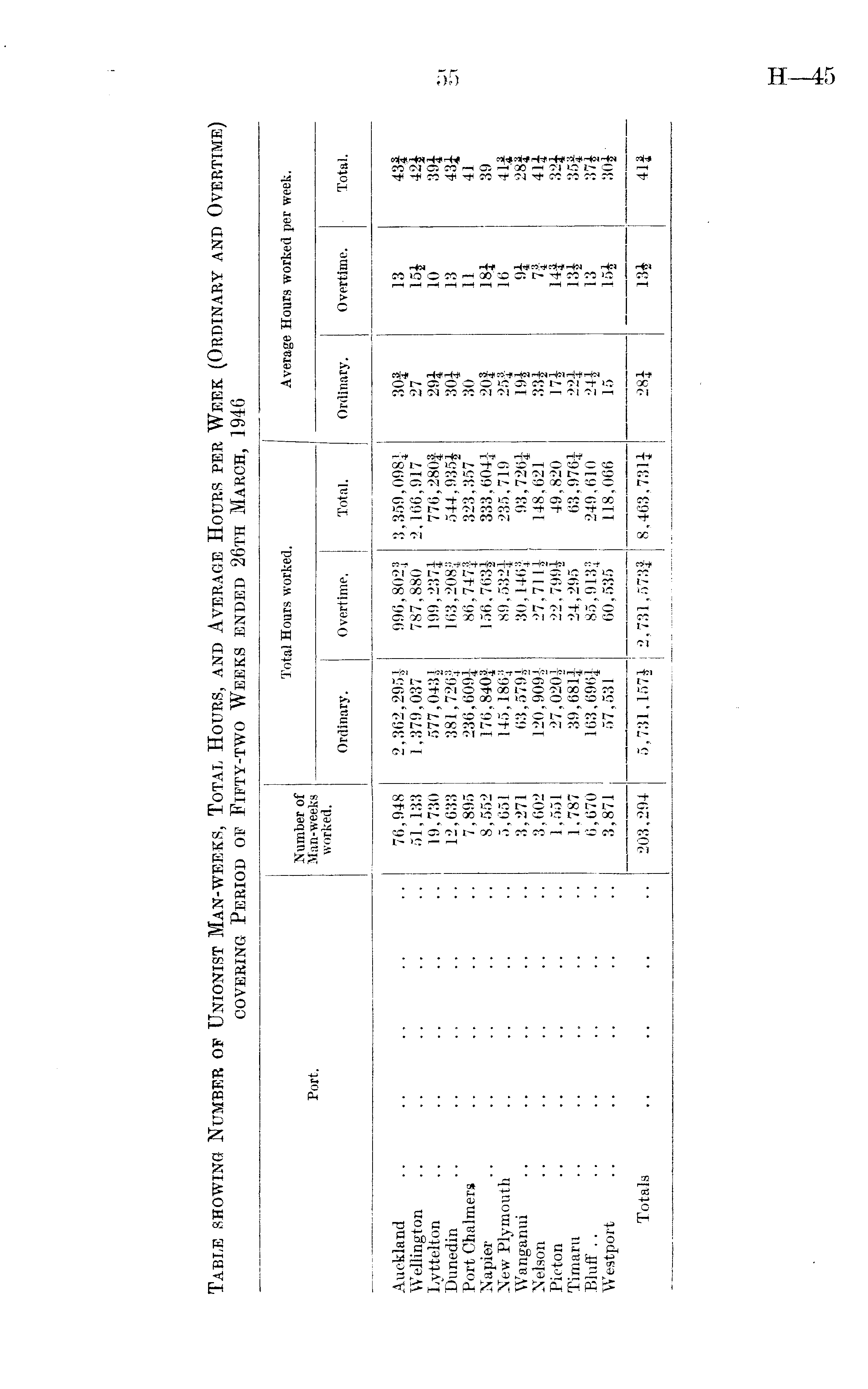 Total Hours worked. Average Hours worked per week. Number of Port. Mail-weeks worked. Ordinary. Overtime. Total. Ordinary. Overtime. Total. Auckland .. .. .. .. .. 76,948 2,362,2954 996,802f 3,359,098* 30J 13 43f Wellington .. .. .. .. .. 51,133 1,379,037 787,880 2,166,917 27 154 42J Lyttelton .. .. .. .. .. 19,730 577,0434 199,237* 776,280f 29* 10 39* Dunedin .. .. .. .. .. 12,633 381,726-f 163,208f 544,9354 30* 13 43* Port Chalmers .. .. .. .. 7,895 236,609* 86,747f 323,357 30 11 41 Napier .. .. .. .. .. 8,552 176,840f 156,7634 333,604* 20f 18* 39 New Plymouth .. .. .. .. 5,651 145,186| 89,532* 235,719 25| 16 41| Wanganui .. .. .. .. .. 3,271 63,5794 30,146f 93,726* 194 9J 28| Nelson .. .. .. .. .. 3,602 120,9094 27,711* 148,621 334 7| 41* Picton .. .. .. .. .. 1,551 27,020| 22,7994 49,820 174 14| 32* Timaru .. .. .. .. .. 1,787 39,681* 24,295 63,976* 22* 134 35| Bluff.. .. .. .. .. .. 6,670 163, 696 J 85,913f 249,610 244 13 37| Westport .. .. .. .. .. 3,871 57,531 60,535 118,066 15 154 304 Totals .. .. .. .. 203,294 5,731,1574 2,731,573f 8,463,731* 28* 134 41}