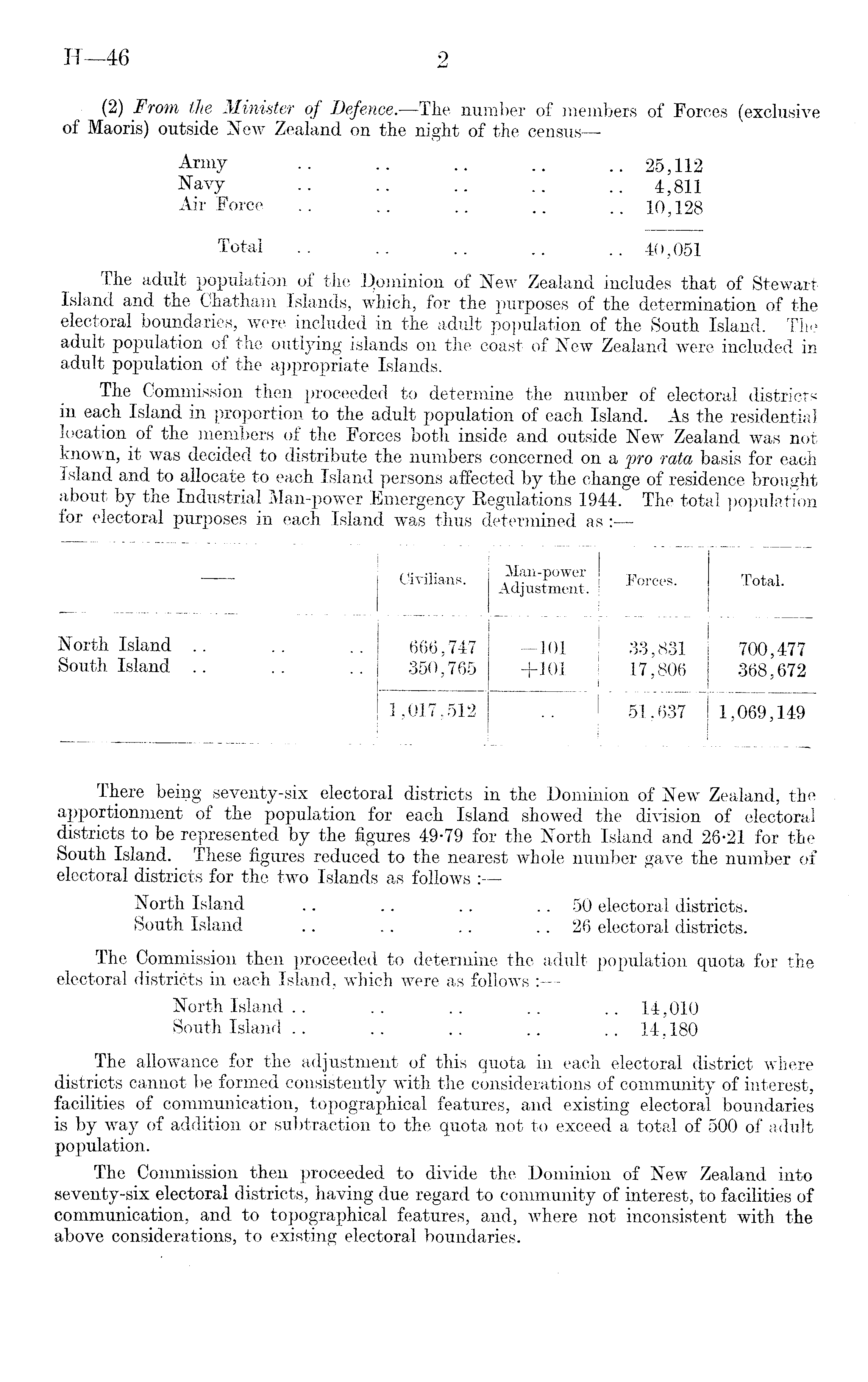 (2) From the Minister of Defence. —The number of members of Forces (exclusive of Maoris) outside New Zealand on the night of the census— Army .. .. .. .. .. 25,112 Navy .. .. ... .. .. 4,811 Air Force .. ... .. .. .. 10,128 Total .. .. .. .. .. 40,051 The adult population of the Dominion of New Zealand includes that of Stewart Island and the Chatham Islands, which, for the purposes of the determination of the electoral boundaries, were included in the adult population of the South Island. The adult population of the outlying islands on the coast of New Zealand were included in adult population of the appropriate Islands. The Commission then proceeded to determine the number of electoral districts in each Island in proportion to the adult population of each Island. As the residential location of the members of the Forces both inside and outside New Zealand was not known, it was decided to distribute the numbers concerned on a pro rata basis for each Island and to allocate to each Island persons affected by the change of residence brought about by the Industrial Man-power Emergency Regulations 1944. The total population for electoral purposes in each Island was thus determined as :