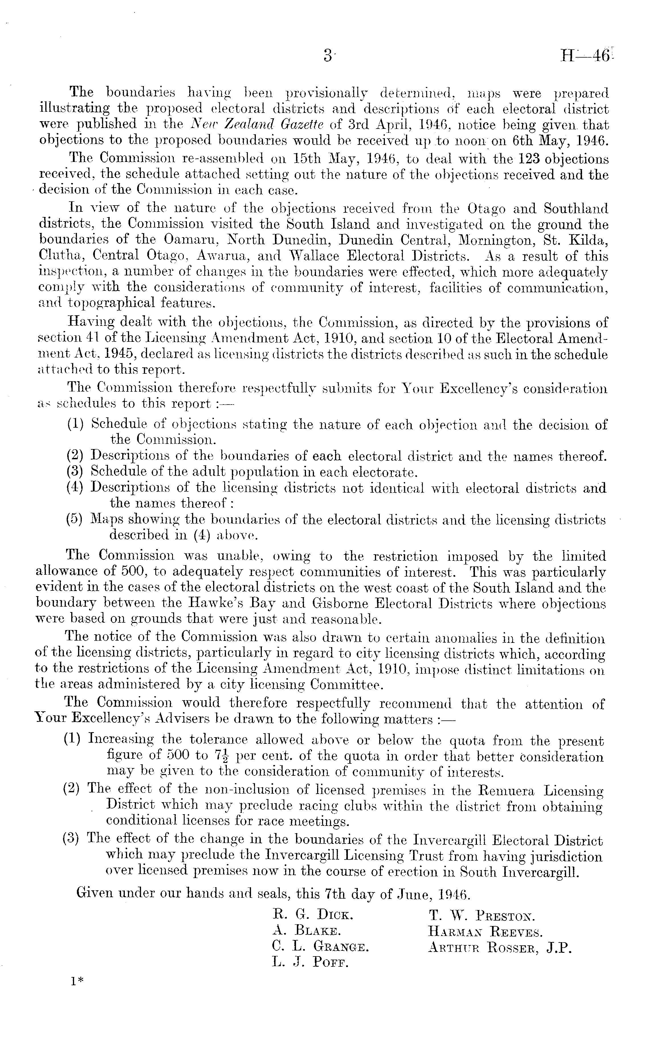 The boundaries having been provisionally determined, maps were prepared illustrating the proposed electoral districts and descriptions of each electoral, district were published in the New Zealand Gazette of 3rd April, 1946, notice being given, that objections to the proposed boundaries would be received up to noon on 6th May, 1946. The Commission re-assembled on 15th May, 1946, to deal with the 123 objections received, the schedule attached setting out the nature of the objections received and the • decision of the Commission in each case. In view of the nature of the objections received from the Ota go and Southland districts, the Commission visited the South Island and investigated on the ground the boundaries of the Oamaru, North Dunedin, Dunedin Central, Mornington, St. Kilda, Clutha, Central Otago, Awarua, and Wallace Electoral Districts. As a result? of this inspection, a number of changes in the boundaries were effected, which more adequately comply with the considerations of community of interest, facilities of communication, and topographical features. Having dealt with the objections, the Commission, as directed by the provisions of section 41 of the Licensing Amendment Act, 1910, and section 10 of the Electoral Amendment Act, 1945, declared as licensing districts the districts described as such in the schedule attached to this report. The Commission therefore respectfully submits for Your Excellency's consideration as schedules to this report: — (1) Schedule of objections stating the nature of each objection and the decision of the Commissipn. (2) Descriptions of the boundaries of each electoral district and the names thereof. (3) Schedule of the adult population in each electorate. (4) Descriptions of the licensing districts not identical with electoral districts and the names thereof: (5) Maps showing the boundaries of the electoral districts and the licensing districts described in (4) above. The Commission was unable, owing to the restriction imposed by the limited allowance of 500, to adequately respect communities of interest. This was particularly evident in the cases of the electoral districts on the west coast of the South Island and the boundary between the Hawke's Bay and Gisborne Electoral Districts where objections were based on grounds that were just and reasonable. The notice of the Commission was also drawn to certain anomalies in the definition of the licensing districts, particularly in regard to city licensing districts which, according to the restrictions of the Licensing Amendment Act, 1910, impose distinct limitations on the areas administered by a city licensing Committee. The Commission would therefore respectfully recommend that the attention of Your Excellency's Advisers be drawn to the following matters (1) Increasing the tolerance allowed above or below the quota from the present figure of 500 to per cent, of the quota in order that better consideration may be given to the consideration of community of interests. (2) The effect of the non-inclusion of licensed premises in the Remuera Licensing District which may preclude racing clubs within the district from obtaining conditional licenses for race meetings. (3) The effect of the change in the boundaries of the Invercargill Electoral District which may preclude the Invercargill Licensing Trust from having jurisdiction over licensed premises now in the course of erection in South Invercargill. Given under our hands and seals, this 7th day of June, 1946. R. G. Dick. T. W. Preston. A. Blake. Harman Reeves. C. L. Grange. Arthur Rosser, J.P. L. J. Poff.