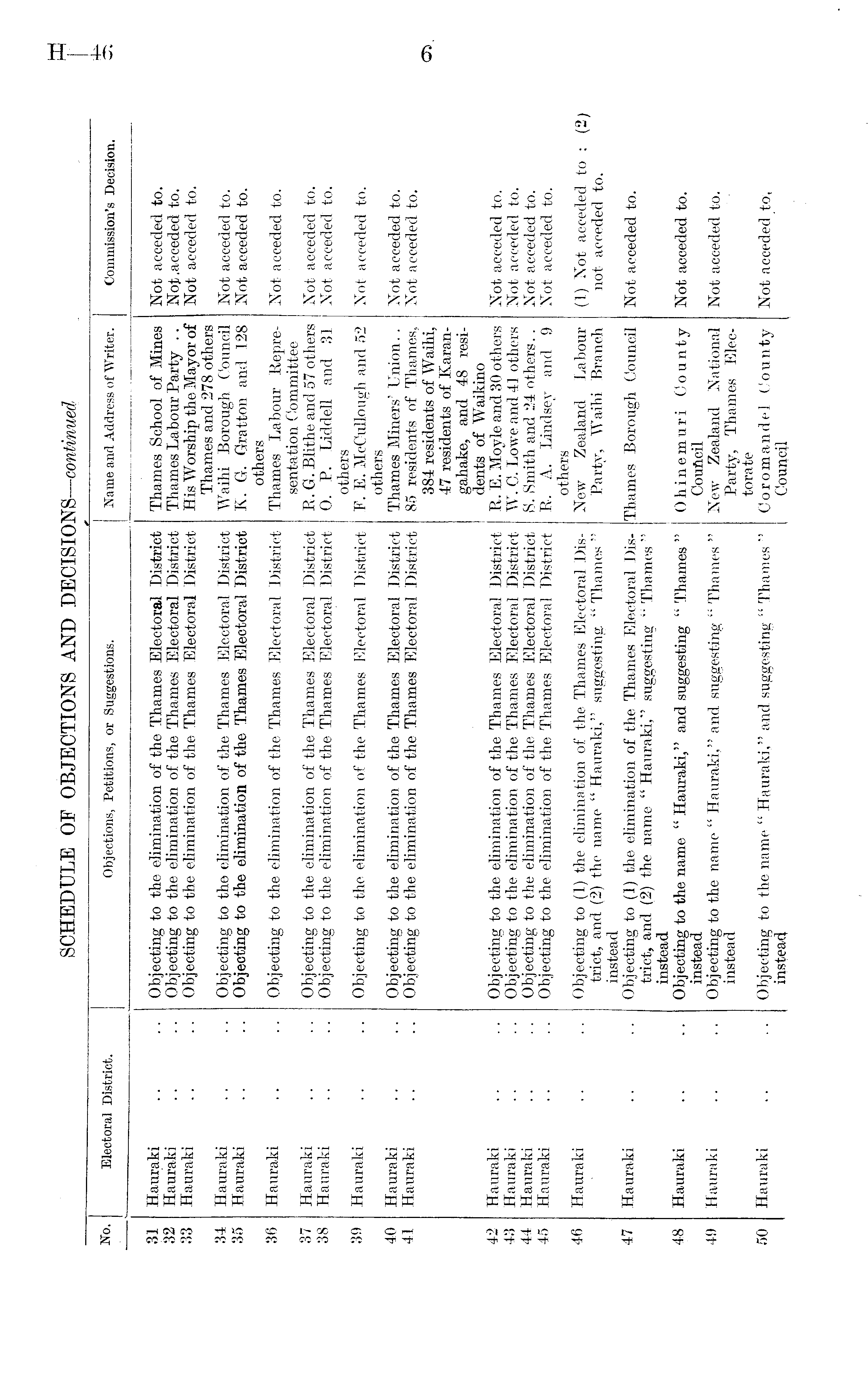 No. Electoral District. — ....— £ Objections, Petitions, or Suggestions. Name and Address of Writer. Commission's Decision. 31 Hauraki Objecting to the elimination of the Thames Electoral District Thames School of Mines Not acceded to. 32 Hauraki Objecting to the elimination of the Thames Electoral District Thames Labour Party .. Not .acceded to. 33 Hauraki Objecting to the elimination of the Thames Electoral District His Worship the Mayor of Not acceded to. 34 Thames and 278 others Hauraki Objecting to the elimination of the Thames Electoral District Waihi Borough Council Not acceded to. 35 Hauraki Objecting to the elimination of the Thames Electoral District K. G. Gratton and 128 Not acceded to. 36 Hauraki Objecting to the elimination of the Thames Electoral District others Thames Labour RepreNot acceded to. 37 Hauraki sentation Committee Objecting to the elimination of the Thames Electoral District R. G. Blithe and 57 others Not acceded to. 38 Hauraki Objecting to the elimination of the Thames Electoral District 0. P. Liddell and 31 Not acceded to. 39 Hauraki Objecting to the elimination of the Thames Electoral District others E. E. McCullough and 52 Not acceded to. 40 Hauraki Objecting to the elimination of the Thames Electoral District others Thames Miners' Union.. Not acceded to. 41 Hauraki Objecting to the elimination of the Thames Electoral District 85 residents of Thames, Not acceded to. 384 residents of Waihi, 47 residents of Karangahake, and 48 residents of Waikino 42 43 Hauraki Objecting to the elimination of the Thames Electoral District R. E. Moyle and 30 others Not acceded to. Hauraki Objecting to the elimination of the Thames Electoral District W. C. Lowe and 41 others Not acceded to. 44 Hauraki Objecting to the elimination of the Thames Electoral District S. Smith and 24 others.. Not acceded to. 45 Hauraki .. Objecting to the elimination of the Thames Electoral District R. A. Lindsey and 9 Not acceded to. 46 Hauraki Objecting to (1) the elimination of the Thames Electoral Disothers New Zealand Labour (1) Not acceded to ; (2 trict, and (2) the name " Hauraki," suggesting " Thames " 1 nrQO rl Party, Waihi Branch not aceeded to; 47 Hauraki illo l/tJcLLl Objecting to (1) the elimination of the Thames Electoral DisThames Borough Council Not acceded to. trict, and (2) the name " Hauraki,"' suggesting " Thames " instead 48 Hauraki Objecting to the name " Hauraki," and suggesting " Thames " Ohinemuri County Not acceded to. instead Council 49 Hauraki Objecting to the name " Hauraki," and suggesting " Thames " New Zealand National Not acceded to. instead Party, Thames Electorate 50 Hauraki Objecting to the name " Hauraki," and suggesting " Thames " Coromandel County Not acceded to', instead 1 Council