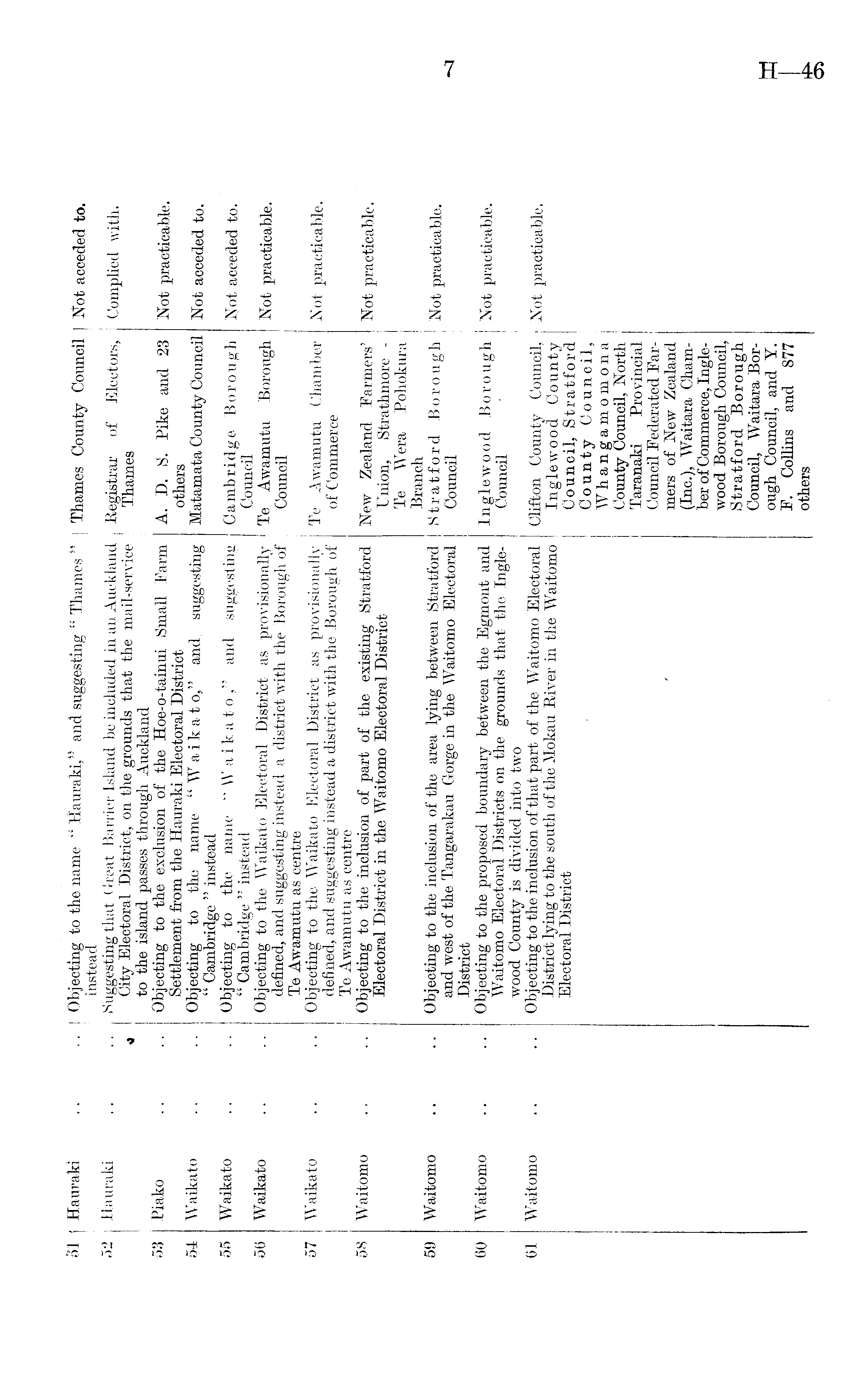 51 j Hauraki .. .. 1 Objecting to the name " Hauraki," and suggesting " Thames " 1 Thames County Council Not acceded to. instead 52 Hauraki .. .. Suggesting that Great Barrier Island be included in an Auckland j Registrar of Electors, Complied with. g City Electoral District, on the grounds that the mail-service | Thames to the island passes through Auckland 53 Piako . . .. Objecting to the exclusion of the Hoe-o-tainui Small Farm A. D. S. Pike and 23 Not practicable. Settlement from the Hauraki Electoral District others 54 Waikato .. .. Objecting to the name " Waikato," and. suggesting Matamata County Council Not acceded to. " Cambridge " instead 55 Waikato .. Objecting to the name "Waikato," and suggesting Cambridge Borough Not acceded to. " Cambridge " instead Council 56 Waikato .. . . Objecting to the Waikato Electoral District as provisionally Te Awamutu Borough Not practicable. defined, and suggesting instead a district with the Borough of Council Te Awamutu as centre 57 Waikato .. .. Objecting to the Waikato Electoral District as provisionally Te Awamutu Chamber Not practicable. defined, and suggesting instead a district with the Borough of of Commerce Te Awamutu as centre 58 Waitomo .. .. Objecting to the inclusion of part of the existing Stratford New Zealand Farmers' Not practicable. Electoral District in the Waitomo Electoral District Union, Strathmore - Te Wera Pohokura Branch 59 Waitomo .. .. Objecting to the inclusion of the area lying between Stratford Stratford Borough Not practicable. and west of the Tangarakau Gorge in the Waitomo Electoral Council District 60 Waitomo .. .. Objecting to the proposed boundary between the Egmont and Inglewood Borough Not practicable. Waitomo Electoral Districts on the grounds that the Ingle- Council wood County is divided into two 61 Waitomo .. .. Objecting to the inclusion of that part of the Waitomo Electoral Clifton County Council, Not practicable. District lying to the south of the Mokau River in the Waitomo Inglewood County Electoral District Council, Stratford County Council, Whangamomona County Council, North Taranaki Provincial Council Federated Farmers of New Zealand (Inc.), Waitara Chamber of Commerce, Inglewood Borough Council, Stratford Borough Council, Waitara Borough Council, and Y. F. Collins and 877 others