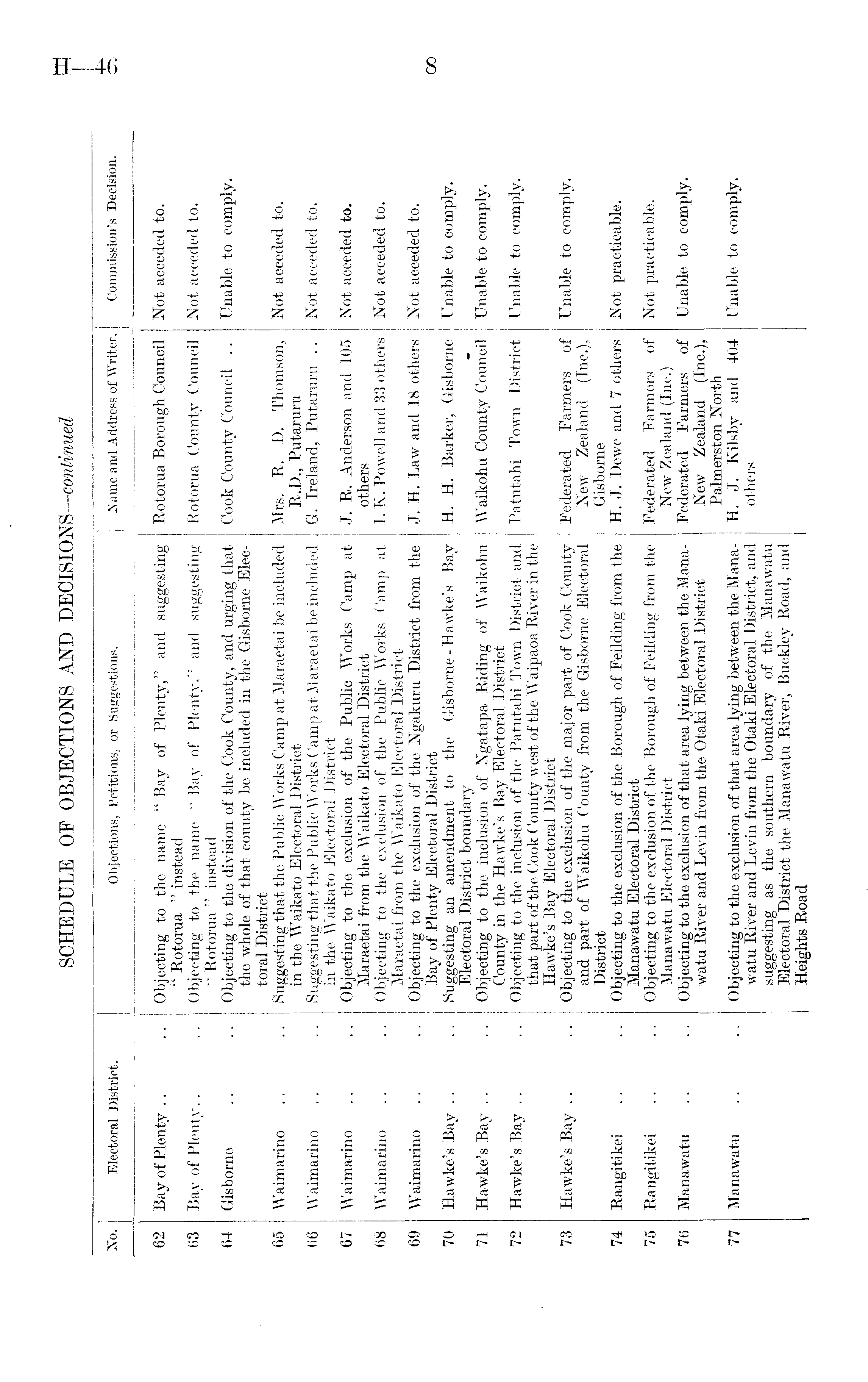 No. Electoral District. Objections, Petitions, or Suggestions. I Name and Address of Writer. Commission's Decision. 62 Bay of Plenty .. .. Objecting to the name "Bay of Plenty," and suggesting Rotorua Borough Council Not acceded to. " Rotorua " instead 03 Jiay of Plenty.. .. Objecting to the name "Bay of Plenty," and suggesting Rotorua County Council Not acceded to. " Rotorua " instead 64 Gisbome .. .. Objecting to the division of the Cook County, and urging that Cook County Council . . Unable to comply. the whole of that county be included in the Gisborne Electoral District 65 Waimarino .. .. Suggesting that the Public Works Camp at Maraetai be included Mrs. R. I). Thomson, Not acceded to. in the Waikato Electoral District R.D., Putaruru 66 Waimarino .. .. Suggesting that the Public Works Camp at Maraetai be included G. Ireland, Putaruru .. Not acceded to. in the Waikato Electoral District 67 Waimarino .. .. Objecting to the exclusion of the Public Works Camp at J. R. Anderson and 105 Not acceded to. Maraetai from the Waikato Electoral District others 68 Waimarino .. .. Objecting to the exclusion of the Public Works Camp at I. K. Powell and 33 others Not acceded to. Maraetai from the Waikato Electoral District 69 Waimarino .. . . Objecting to the exclusion of the Ngakuru District from the J. H. Law and 18 others Not acceded to. Bay of Plenty Electoral District 70 Hawlte's Bay .. .. Suggesting an amendment to the Gisbome - Hawke's Bay H. H. Barker, Gisborne Unable to comply. Electoral District boundary 71 Hawke's Bay . . . . Objecting to the inclusion of Ngatapa Riding of Waikohu Waikohu County Council Unable to comply. County in the Hawke's Bay Electoral District 72 Hawke's Bay . . .. Objecting to the inclusion of the Patutahi Town District and Patutahi Town District Unable to comply. that part of the Cook County west of the Waipaoa River in the Hawke's Bay Electoral District 73 Hawke's Bay .. .. Objecting to the exclusion of the major part of Cook County Federated Farmers of Unable to comply. and part of Waikohu County from the Gisborne Electoral New Zealand (Inc.), District Gisborne 74 Rangitikei .. .. Objecting to the exclusion of the Borough of Feilding from the H. J. Dewe and 7 others Not practicable. Manawatu Electoral District 75 Rangitikei .. .. Objecting to the exclusion of the Borough of Feilding from the Federated Farmers of Not practicable. Manawatu Electoral District New Zealand (Inc.) 76 Manawatu . . . . Objecting to the exclusion of that area lying between the Mana- Federated Farmers of Unable to comply. watu River and Levin from the Otaki Electoral District New Zealand (Inc.), Palmerston North 77 Manawatu .. .. Objecting to the exclusion of that area lying between the Mana- H. J. Kilsby and 404 Unable to comply. watu River and Levin from the Otaki Electoral District, and others suggesting as the southern boundary of the Manawatu Electoral District the Manawatu River, Buckley Road, and Heights Road