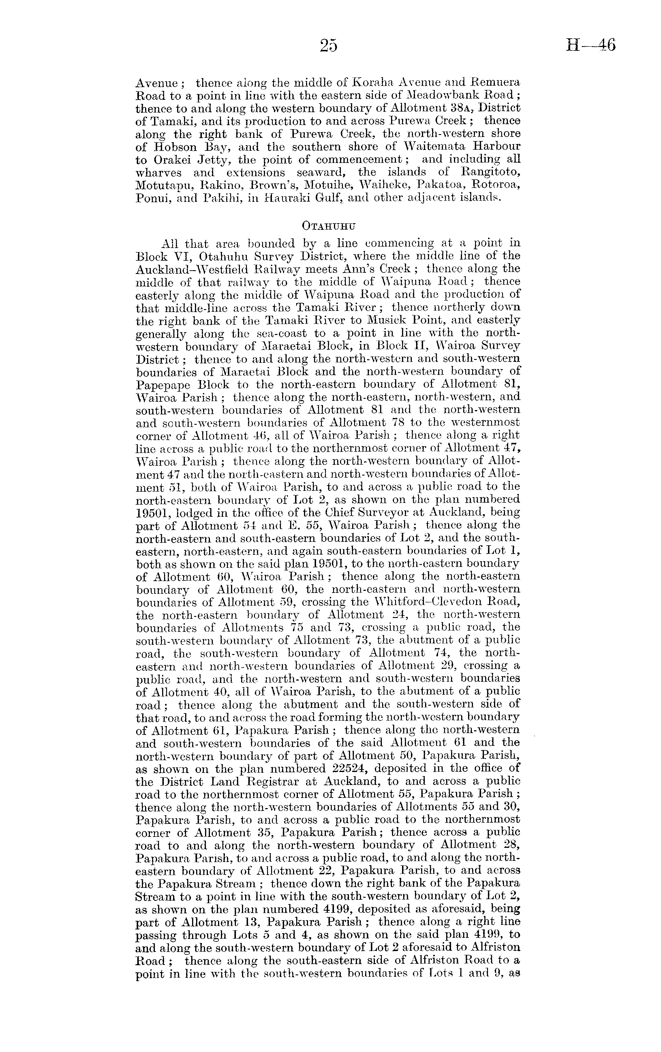Avenue ; thence along the middle of Koraha Avenue and Remuera Road to a point in line with the eastern side of Meadowbank Road; thence to and along the western boundary of Allotment 38a, District of Tamaki, and its production to and across Purewa Creek ; thence along the right bank of Purewa Creek, the north-western shore of Hobson Bay, and the southern shore of Waitemata Harbour to Orakei Jetty, the point of commencement; and including all wharves and extensions seaward, the islands of Rangitoto, Motutapu, Rakino, Brown's, Motuihe, Waiheke, Pakatoa, Rotoroa, Ponui, and Pakihi, in Hauraki Gulf, and other adjacent islands. Otahuhtj All that area bounded by a line commencing at a point in Block VI, Otahuhu Survey District, where the middle line of the Auckland-Westfield Railway meets Ann's Creek ; thence along the middle of that railway to the middle of Waipuna Road; thence easterly along the middle of Waipuna Road and the production of that middle-line across the Tamaki River; thence northerly down the right bank of the Tamaki River to Musick Point, and easterly generally along the sea-coast to a point in line with the northwestern boundary of Maraetai Block, in Block 11, Wairoa Survey District; thence to and along the north-western and south-western boundaries of Maraetai Block and the north-western boundary of Papepape Block to the north-eastern boundary of Allotment 81, Wairoa Parish ; thence along the north-eastern, north-western, and south-western boundaries of Allotment 81 and the north-western and south-western boundaries of Allotment 78 to the westernmost corner of Allotment 46, all of Wairoa Parish ; thence along a right line across a public road to the northernmost corner of Allotment 47, Wairoa Parish ; thence along the north-western boundary of Allotment 47 and the north-eastern and north-western boundaries of Allotment 51, both of Wairoa Parish, to and across a public road to the north-eastern boundary of Lot 2, as shown on the plan numbered 19501, lodged in the office of the Chief Surveyor at Auckland, being part of Allotment 54 and E. 55, Wairoa Parish; thence along the north-eastern and south-eastern boundaries of Lot 2, and the southeastern, north-eastern, and again south-eastern boundaries of Lot 1, both as shown on the said plan 19501, to the north-eastern boundary of Allot,merit, 60, Wairoa Parish; thence along the north-eastern boundary of Allotment 60, the north-eastern and north-western boundaries of Allotment 59, crossing the Whitford-Clevedon Road, the north-eastern boundary of Allotment 24, the north-western boundaries of Allotments 75 and 73, crossing a public road, the south-western boundary of Allotment 73, the abutment of a public road, the south-western boundary of Allotment 74, the northeastern and north-western boundaries of Allotment 29, crossing a public road, and the north-western and south-western boundaries of Allotment 40, all of Wairoa Parish, to the abutment of a public road; thence along the abutment and the south-western side of that road, to and across the road forming the north-western boundary of Allotment 61, Papakura Parish ; thence along the north-western and south-western boundaries of the said Allotment 61 and the north-western boundary of part of Allotment 50, Papakura Parish, as shown on the plan numbered 22524, deposited in the office of the District Land Registrar at Auckland, to and across a public road to the northernmost corner of Allotment 55, Papakura Parish; thence along the north-western boundaries of Allotments 55 and 30, Papakura Parish, to and across a public road to the northernmost corner of Allotment 35, Papakura Parish; thence across a public road to and along the north-western boundary of Allotment 28, Papakura Parish, to and across a public road, to and along the northeastern boundary of Allotment 22, Papakura Parish, to and across the Papakura Stream ; thence down the right bank of the Papakura Stream to a point in line with the south-western boundary of Lot 2, as shown on the plan numbered 4199, deposited as aforesaid, being part of Allotment 13, Papakura Parish; thence along a right line passing through Lots 5 and 4, as shown on the said plan 4199, to and along the south-western boundary of Lot 2 aforesaid to Alfriston Road ; thence along the south-eastern side of Alfriston Road to a point in line with the south-western boundaries of Lots 1 and 9, as