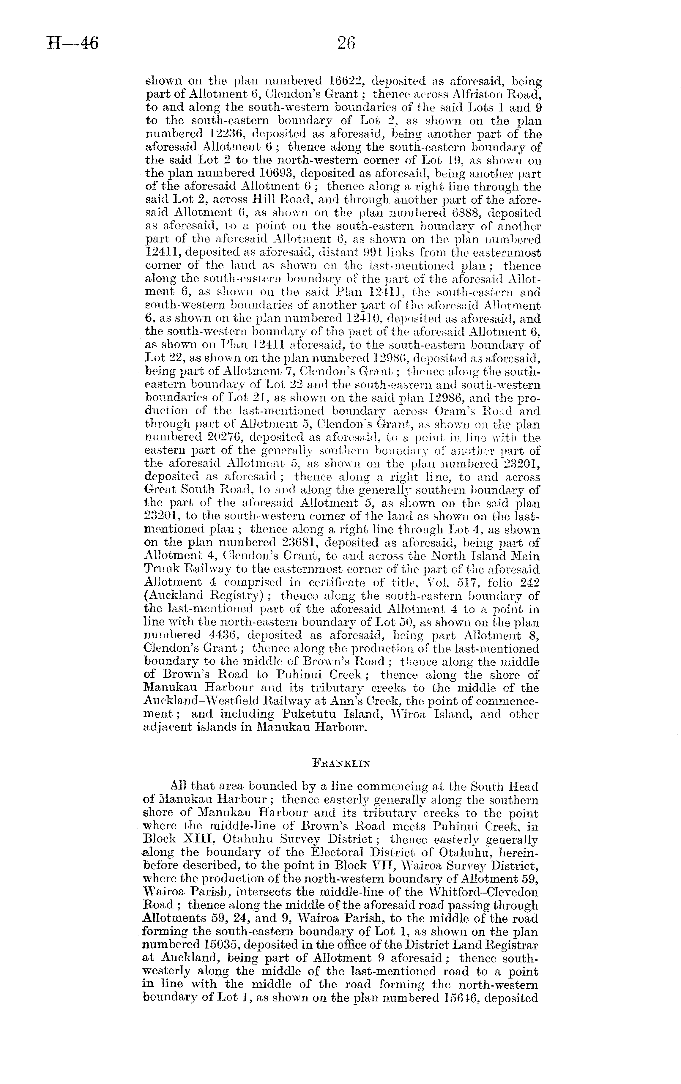 shown on the plan numbered 16622, deposited as aforesaid, being part of Allotment 6, Clendon's Grant; thence across Alfriston Road, to and along the south-western boundaries of the said Lots 1 and 9 to the south-eastern boundary of Lot 2, as shown on the plan numbered 12236, deposited as aforesaid, being another part of the aforesaid Allotment 6 ; thence along the south-eastern boundary of the said Lot 2 to the north-western corner of Lot 19, as shown on the plan numbered 10693, deposited as aforesaid, being another part of the aforesaid Allotment 6 ; thence along a right line through the said Lot 2, across Hill Road, and through another part of the aforesaid Allotment 6, as shown on the plan numbered 6888, deposited as aforesaid, to a point on the south-eastern boundary of another part of the aforesaid Allotment 6, as shown on the plan numbered 12411, deposited as aforesaid, distant 991 links from the easternmost corner of the land as shown on the last-mentioned plan; thence along the south-eastern boundary of the part of the aforesaid Allotment 6, as shown on the said Plan 12411, the south-eastern and . south-western boundaries of another part of the aforesaid Allotment 6, as shown on the plan numbered 12410, deposited as aforesaid, and the south-western boundary of the part of the aforesaid Allotment 6, as shown on Plan 12411 aforesaid, to the south-eastern boundary of Lot 22, as shown on the plan numbered 12986, deposited as aforesaid, being part of Allotment 7, Clendon's Grant; thence along the southeastern boundary of Lot 22 and the south-eastern and south-western boundaries of Lot 21, as shown on the said plan 12986, and the production of the last-mentioned boundary across Oram's Road and through part of Allotment 5, Clendon's Grant, as shown on the plan numbered 20276, deposited as aforesaid, to a point in line with the eastern part of the generally southern boundary of another part of the aforesaid Allotment 5, as shown on the plan numbered 23201, deposited as aforesaid; thence along a right line, to and across Great South Road, to and along the generally southern boundary of the part of the aforesaid Allotment 5, as shown on the said plan 23201, to the south-western corner of the land as shown on the lastmentioned plan ; thence along a right line through Lot 4, as shown on the plan numbered 23681, deposited as aforesaid,- being part of Allotment 4, Clendon's Grant, to and across the North Island Main Trunk Railway to the easternmost corner of the part of the aforesaid Allotment 4 comprised in certificate of title, Vol. 517, folio 242 (Auckland Registry); thence along the south-eastern boundary of the last-mentioned part of the aforesaid Allotment 4 to a point in line with the north-eastern boundary of Lot 50, as shown on the plan numbered 4436, deposited as aforesaid, being part Allotment 8, Clendon's Grant; thence along the production of the last-mentioned boundary to the middle of Brown's Road ; thence along the middle of Brown's Road to Puhinui Creek; thence along the shore of Manukau Harbour and its tributary creeks to the middle of the Auckland-Westfield Railway at Ann's Creek, the point of commencement ; and including Puketutu Island, Wiroa Island, and other adjacent islands in Manukau Harbour. Franklin All that area bounded by a line commencing at the South Head of Manukau Harbour; thence easterly generally along the southern shore of Manukau Harbour and its tributary creeks to the point where the middle-line of Brown's Road meets Puhinui Creek, in Block XIII. Otahuhu Survey District; thence easterly generally «long the boundary of the Electoral District of Otahuhu, hereinbefore described, to the point in Block VIT, Wairoa Survey District, where the production of the north-western boundary of Allotment 59, Wairoa Parish, intersects the middle-line of the Whitford-Clevedon Road ; thence along the middle of the aforesaid road passing through Allotments 59, 24, and 9, Wairoa Parish, to the middle of the road forming the south-eastern boundary of Lot 1, as shown on the plan numbered 15035, deposited in the office of the District Land Registrar at Auckland, being part of Allotment 9 aforesaid; thence southwesterly along the middle of the last-mentioned road to a point in line with the middle of the road forming the north-western boundary of Lot 1, as shown on the plan numbered 15646, deposited