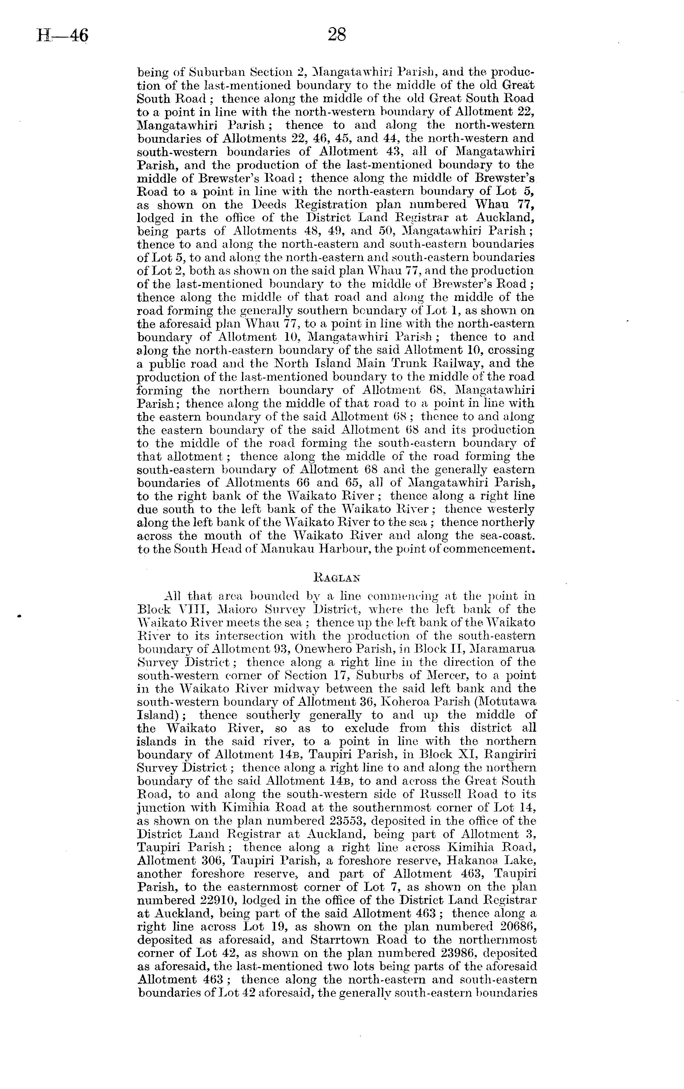 being of Suburban Section 2, Mangatawhiri Parish, and the production of the last-mentioned boundary to the middle of the old Great South Road ; thence along the middle of the old Great South Road to a point in line with the north-western boundary of Allotment 22, Mangatawhiri Parish; thence to and along the north-western boundaries of Allotments 22, 46, 45, and 44, the north-western and south-western boundaries of Allotment 43, all of Mangatawhiri Parish, and the production of the last-mentioned boundary to the middle of Brewster's Road ; thence along the middle of Brewster's Road to a point in line with the north-eastern boundary of Lot 5, as shown on the Deeds Registration plan numbered Whau 77, lodged in the office of the District Land Registrar at Auckland, being parts of Allotments 48, 49, and 50, Mangatawhiri Parish; thence to and along the north-eastern and south-eastern boundaries of Lot 5, to and along the north-eastern and south-eastern boundaries of Lot 2, both as shown on the said plan Whau 77, and the production of the last-mentioned boundary to the middle of Brewster's Road ; thence along the middle of that road and along the middle of the road forming the generally southern boundary of Lot 1, as shown on the aforesaid plan Whau 77, to a point in line with the north-eastern boundary of Allotment 10, Mangatawhiri Parish ; thence to and along the north-eastern boundary of the said Allotment 10, crossing a public road and the North Island Main Trunk Railway, and the production of the last-mentioned boundary to the middle of the road forming the northern boundary of Allotment 68, Mangatawhiri Parish; thence along the middle of that road to a point in line with the eastern boundary of the said Allotment 68 ; thence to and along the eastern boundary of the said Allotment 68 and its production to the middle of the road forming the south-eastern boundary of that allotment; thence along the middle of the road forming the south-eastern boundary of Allotment 68 and the generally eastern boundaries of Allotments 66 and 65, all of Mangatawhiri Parish, to the right bank of the Waikato River; thence along a right line due south to the left bank of the Waikato River; thence westerly along the left bank of the Waikato River to the sea ; thence northerly across the mouth of the Waikato River and along the sea-coast, to the South Head of Manukau Harbour, the point of commencement. Raglan All that area bounded by a line commencing at the point in Block VIII, Maioro Survey District, where the left bank of the Waikato River meets the sea ; thence up the left bank of the Waikato River to its intersection with the production of the south-eastern boundary of Allotment 93, Onewhero Parish, in Block 11, Maramarua Survey District; thence along a right line in the direction of the south-western corner of Section 17, Suburbs of Mercer, to a point in the Waikato River midway between the said left bank and the south-western boundary of Allotment 36, Koheroa Parish (Motutawa Island); thence southerly generally to and up the middle of the Waikato River, so as to exclude from this district all islands in the said river, to a point in line with the northern boundary of Allotment 14b, Taupiri Parish, in Block XI, Rangiriri Survey District; thence along a right line to and along the northern boundary of the said Allotment 14b, to and across the Great South Road, to and along the south-western side of Russell Road to its junction with Kimihia Road at the southernmost corner of Lot 14, as shown on the plan numbered 23553, deposited in the office of the District Land Registrar at Auckland, being part of Allotment 3, Taupiri Parish; thence along a right line across Kimihia Road, Allotment 306, Taupiri Parish, a foreshore reserve, Hakanoa Lake, another foreshore reserve, and part of Allotment 463, Taupiri Parish, to the easternmost corner of Lot 7, as shown on the plan numbered 22910, lodged in the office of the District Land Registrar at Auckland, being part of the said Allotment 463 ; thence along a right line across Lot 19, as shown on the plan numbered 20686, deposited as aforesaid, and Starrtown Road to the northernmost corner of Lot 42, as shown on the plan numbered 23986, deposited as aforesaid, the last-mentioned two lots being parts of the aforesaid Allotment 463 ; thence along the north-eastern and south-eastern boundaries of Lot 42 aforesaid, the generally south-eastern boundaries