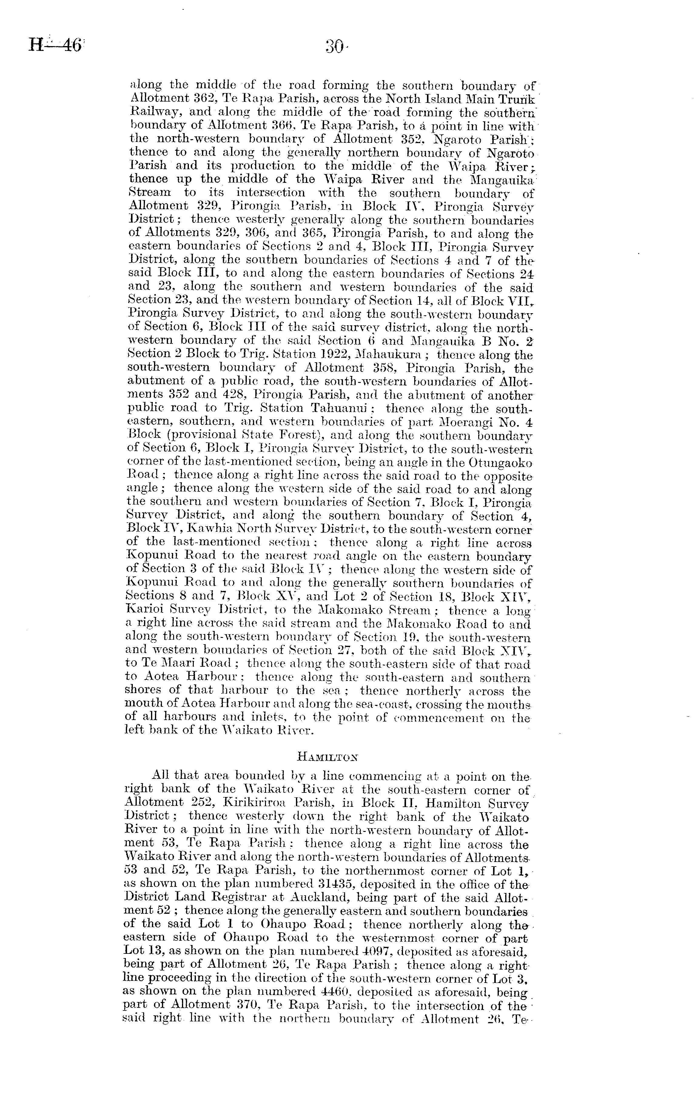 along the middle of the road forming the southern boundary of Allotment 362, Te Rapa Parish, across the North Island Main Trunk Railway, and along the middle of the road forming the southern' boundary of Allotment 366, Te Rapa Parish, to a point in line with the north-western boundary of Allotment 352, Ngaroto Parish; thence to and along the generally northern boundary of Ngaroto Parish and its production to the middle of the Waipa River - r thence up the middle of the Waipa River and the Mangauika Stream to its intersection with the southern boundary of Allotment 329, Pirongia Parish, in Block IV, Pirongia Survey District; thence westerly generally along the southern boundaries of Allotments 329, 306, and 365, Pirongia Parish, to and along the eastern boundaries of Sections 2 and 4, Block 111, Pirongia Survey District, along the southern boundaries of Sections 4 and 7 of the said Block 111, to and along the eastern boundaries of Sections 24 and 23, along the southern and western boundaries of the said Section 23, and the western boundary of Section 14, all of Block VII r Pirongia Survey District, to and along the south-western boundary of Section 6, Block 111 of the said survey district, along the northwestern boundary of the said Section 6 and Mangauika B No. 2 Section 2 Block to Trig. Station 1922, Mahaukura ; thence along the south-western boundary of Allotment 358, Pirongia Parish, the abutment of a public road, the south-western boundaries of Allotments 352 and 428, Pirongia Parish, and the abutment of another public road to Trig. Station Tahuanui; thence along the southeastern, southern, and western boundaries of part Moerangi No. 4 Block (provisional State Forest}, and along the southern boundary of Section 6, Block I, Pirongia Survey District, to the south-western corner of the last-mentioned section, being an angle in the Otungaoke Road ; thence along a right line across the said road to the opposite angle; thence along the western side of the said road to and along the southern and western boundaries of Section 7, Block I, Pirongia Survey District, and along the southern boundary of Section 4, Block IV, Kawhia North Survey District, to the south-western corner of the last-mentioned section ; thence along a right line across Kopunui Road to the nearest road angle on the eastern boundary of Section 3 of the said Block IV ; thence along the western side of Kopunui Road to and along the generally southern boundaries of Sections 8 and 7, Block XV, and Lot 2 of Section 18, Block XIV, Karioi Survey District, to the Makomako Stream : thence a long : a right line across the said stream and the Makomako Road to and along the south-western boundary of Section 19, the south-western and western boundaries of Section 27, both of the said Block XIV,. to Te Maari Road ; thence along the south-eastern side of that road to Aotea Harbour; thence along the south-eastern and southern shores of that harbour to the sea ; thence northerly across the mouth of Aotea Harbour and along the sea-coast, crossing the mouthsof all harbours and inlets, to the point of commencement on the left bank of the Waikato River.