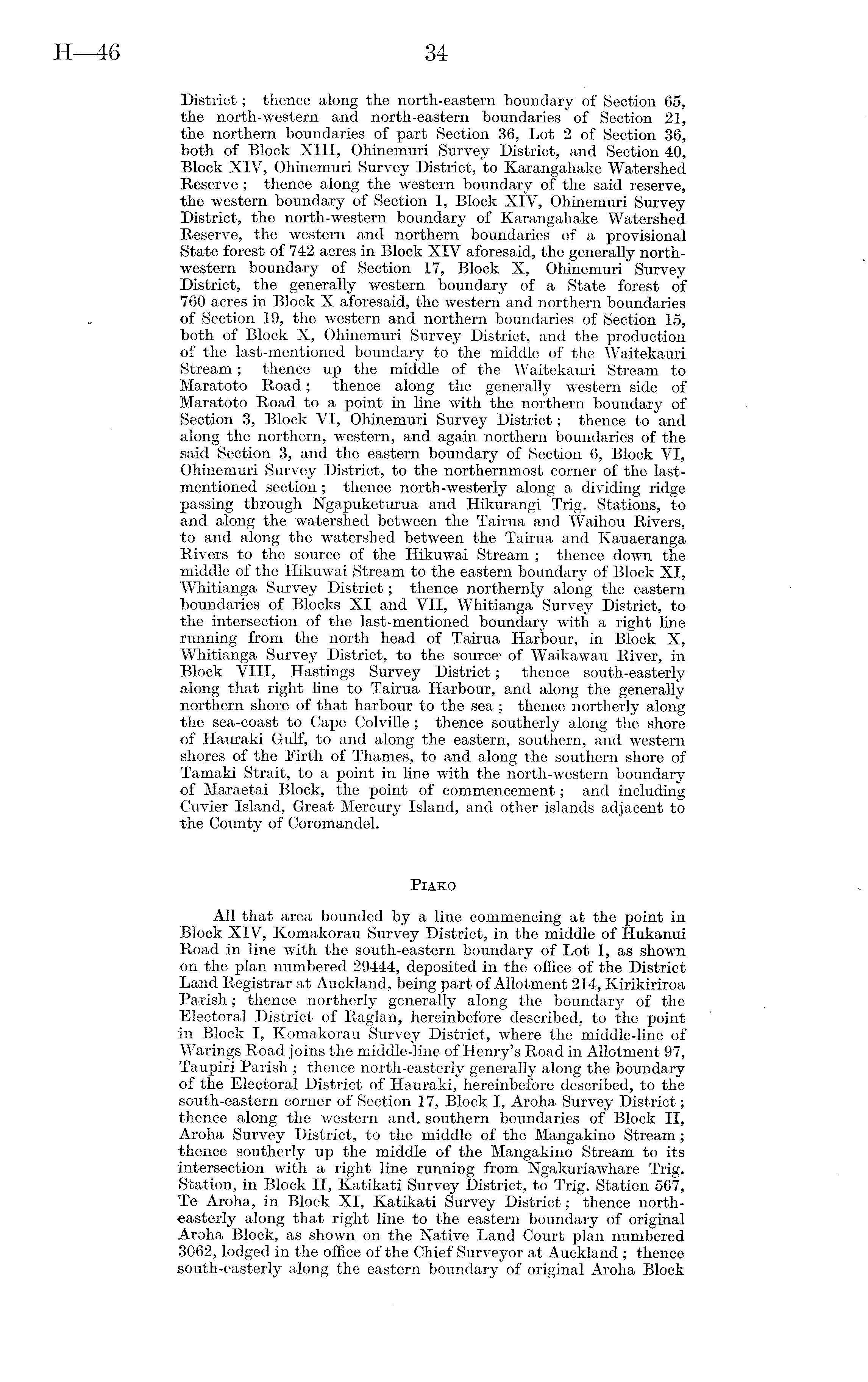 District; thence along the north-eastern boundary of Section 65, the north-western and north-eastern boundaries of Section 21, the northern boundaries of part Section 36, Lot 2 of Section 36, both of Block XIII, Ohinemuri Survey District, and Section 40, Block XIV, Ohinemuri Survey District, to Karangahake Watershed Reserve; thence along the western boundary of the said reserve, the western boundary of Section 1, Block XIV, Ohinemuri Survey District, the north-western boundary of Karangahake Watershed Reserve, the western and northern boundaries of a provisional State forest of 742 acres in Block XIV aforesaid, the generally northwestern boundary of Section 17, Block X, Ohinemuri Survey District, the generally western boundary of a State forest of 760 acres in Block X aforesaid, the western and northern boundaries of Section 19, the western and northern boundaries of Section 15, both of Block X, Ohinemuri Survey District, and the production of the last-mentioned boundary to the middle of the Waitekauri Stream; thence up the middle of the Waitekauri Stream to Maratoto Road; thence along the generally western side of Maratoto Road to a point in line with the northern boundary of Section 3, Block VI, Ohinemuri Survey District; thence to and along the northern, western, and again northern boundaries of the said Section 3, and the eastern boundary of Section 6, Block VI, Ohinemuri Survey District, to the northernmost corner of the lastmentioned section; thence north-westerly along a dividing ridge passing through Ngapuketurua and Hikurangi Trig. Stations, to and along the watershed between the Tairua and Waihou Rivers, to and along the watershed between the Tairua and Kauaeranga Rivers to the source of the Hikuwai Stream ; thence down the middle of the Hikuwai Stream to the eastern boundary of Block "XT, Whitianga Survey District; thence northernly along the eastern boundaries of Blocks XI and VII, Whitianga Survey District, to the intersection of the last-mentioned boundary with a right line running from the north head of Tairua Harbour, in Block X, Whitianga Survey District, to the source" of Waikawau River, in Block VIII, Hastings Survey District; thence south-easterly along that right line to Tairua Harbour, and along the generally northern shore of that harbour to the sea; thence northerly along the sea-coast to Cape Colville; thence southerly along the shore of Hauraki Gulf, to and along the eastern, southern, and western shores of the Firth of Thames, to and along the southern shore of Tamaki Strait, to a point in line with the north-western boundary of Maraetai Block, the point of commencement; and including Cuvier Island, Great Mercury Island, and other islands adjacent to the County of Coromandel. Piako All that area bounded by a line commencing at the point in Block XIV, Komakorau Survey District, in the middle of Hukanui Road in line with the south-eastern boundary of Lot 1, as shown on the plan numbered 29444, deposited in the office of the District Land Registrar at Auckland, being part of Allotment 214, Kirikiriroa Parish; thence northerly generally along the boundary of the Electoral District of Raglan, hereinbefore described, to the point in Block I, Komakorau Survey District, where the middle-line of Warings Road joins the middle-line of Henry's Road in Allotment 97, Taupiri Parish ; thence north-easterly generally along the boundary of the Electoral District of Hauraki, hereinbefore described, to the south-eastern corner of Section 17, Block I, Aroha Survey District; thence along the western and. southern boundaries of Block 11, Aroha Survey District, to the middle of the Mangakino Stream; thence southerly up the middle of the Mangakino Stream to its intersection with a right line running from Ngakuriawhare Trig. Station, in Block 11, Katikati Survey District, to Trig. Station 567, Te Aroha, in Block XI, Katikati Survey District; thence northeasterly along that right line to the eastern boundary of original Aroha Block, as shown on the Native Land Court plan numbered 3062, lodged in the office of the Chief Surveyor at Auckland ; thence south-easterly along the eastern boundary of original Aroha Block