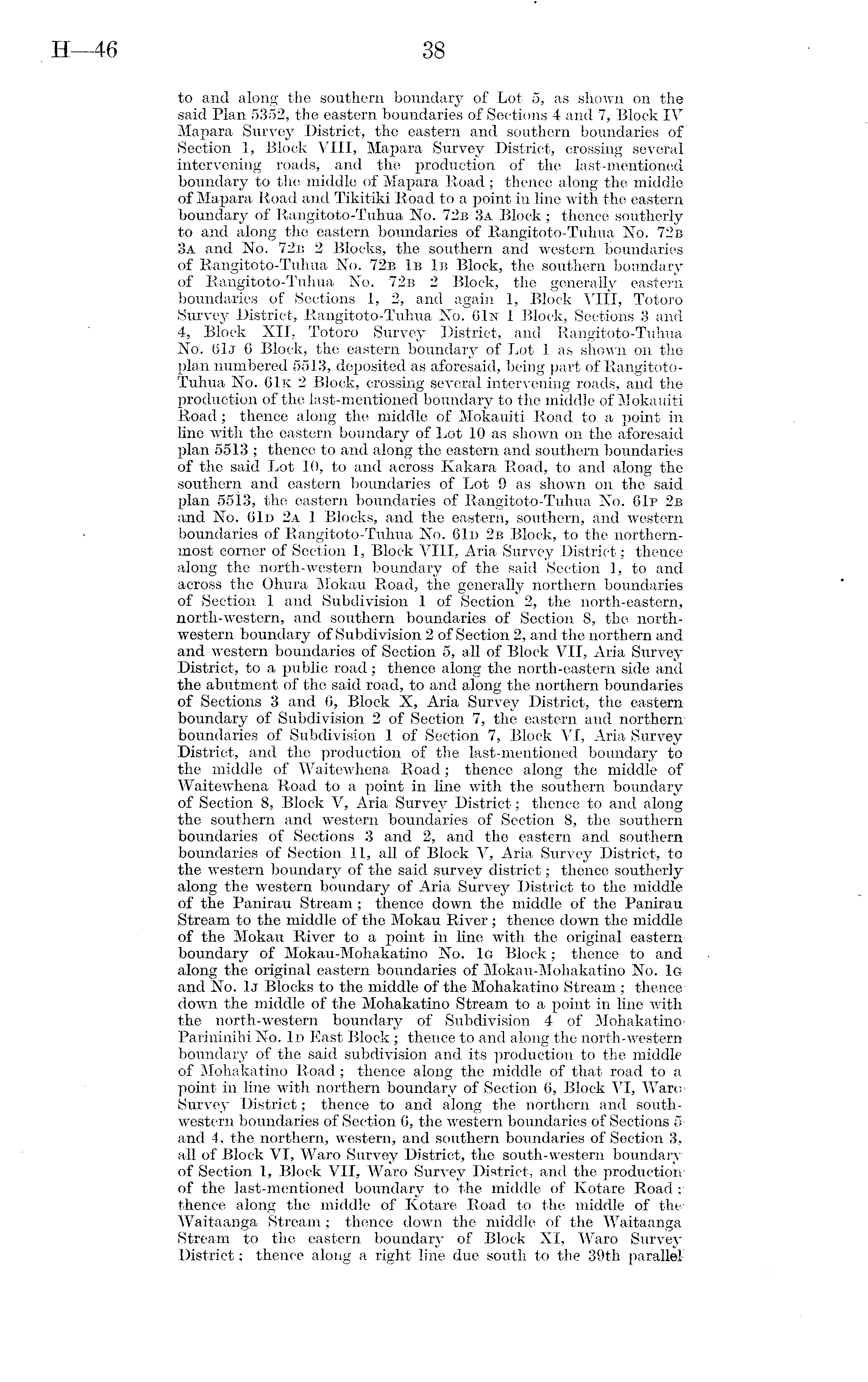 to and along the southern boundary of Lot 5, as shown on the said Plan 5352, the eastern boundaries of Sections 4 and 7, Block IV Mapara Survey District, the eastern and southern boundaries of Section 1, Block VIII, Mapara Survey District, crossing several intervening roads, and the production of the last-mentioned boundary to the middle of Mapara Road ; thence along the middle of Mapara Road and Tikitiki Road to a point in line with the eastern boundary of Rangitoto-Tuhua No. 72b 3a Block; thence southerly to and along the eastern boundaries of Rangitoto-Tuhua No. 72b 3a and No. 72b 2 Blocks, the southern and western boundaries of Rangitoto-Tuhua No. 72b 1b 1b Block, the southern boundary of Rangitoto-Tuhua No. 72b 2 Block, the generally eastern boundaries of Sections 1, 2, and again 1, Block VIII, Totoro Survey District, Rangitoto-Tuhua No. 61n 1 Block, Sections 3 and 4, Block XII, Totoro Survey District, and Rangitoto-Tuhua No. 61j 6 Block, the eastern boundary of Lot 1 as shown on the plan numbered 5513, deposited as aforesaid, being part of RangitotoTuhua No. 61k 2 Block, crossing several intervening roads, and the production of the last-mentioned boundary to the middle of Mokauiti Road; thence along the middle of Mokauiti Road to a point in line with the eastern boundary of Lot 10 as shown on the aforesaid plan 5513 ; thence to and along the eastern and southern boundaries of the said Lot 10, to and across Kakara Road, to and along the southern and eastern boundaries of Lot 9 as shown on the said plan 5513, the eastern boundaries of Rangitoto-Tuhua No. 81p 2b and No. 61d 2a 1 Blocks, and the eastern, southern, and western boundaries of Rangitoto-Tuhua No. 61d 2b Block, to the northernmost corner of Section 1, Block VIII, Aria Survey District; thence along the north-western boundary of the said Section 1, to and across the Ohura Mokau Road, the generally northern boundaries of Section 1 and Subdivision 1 of Section 2, the north-eastern, north-western, and southern boundaries of Section 8, the northwestern boundary of Subdivision 2 of Section 2, and the northern and and western boundaries of Section 5, all of Block VII, Aria Survey District, to a public road; thence along the north-eastern side and the abxitment of the said road, to and along the northern boundaries of Sections 3 and 6, Block X, Aria Survey District, the eastern boundary of Subdivision 2 of Section 7, the eastern and northern boundaries of Subdivision 1 of Section 7, Block VI, Aria Survey District, and the production of the last-mentioned boundary to the middle of Waitewhena Road; thence along the middle of Waitewhena Road to a point in line with the southern boundary of Section 8, Block V, Aria Survey District; thence to and along the southern and western boundaries of Section 8, the southern boundaries of Sections 3 and 2, and the eastern and southern boundaries of Section 11, all of Block V, Aria Survey District, to the western boundary of the said survey district; thence southerly along the western boundary of Aria Survey District to the middle of the Panirau Stream; thence down the middle of the Panirau Stream to the middle of the Mokau River ; thence down the middle of the Mokau River to a point in line with the original eastern boundary of Mokau-Mohakatino No. 1g Block; thence to and along the original eastern boundaries of Mokau-Mohakatino No. 1g and No. 1j Blocks to the middle of the Mohakatino Stream ; thence down the middle of the Mohakatino Stream to a point in line with the north-western boundary of Subdivision 4 of MohakatinoParininihi No. Id East Block ; thence to and along the north-western boundary of the said subdivision and its production to the middle of Mohakatino Road; thence along the middle of that road to a point in line with northern boundary of Section 6, Block VI, Warcv Survey District; thence to and along the northern and southwestern boundaries of Section G, the western boundaries of Sections 5and 4, the northern, western, and soiithern boundaries of Section 3, all of Block VI, Waro Survey District, the south-western boundary of Section 1, Block VII, Waro Survey District, and the production' of the last-mentioned boundary to the middle of Ivotare Road ■; thence along the middle of Kotare Road to the middle of theWaitaanga Stream ; thence down the middle of the Waitaanga Stream to the eastern boundary of Block XI, Waro Survey District; thence along a right line due south to the 39th paralM