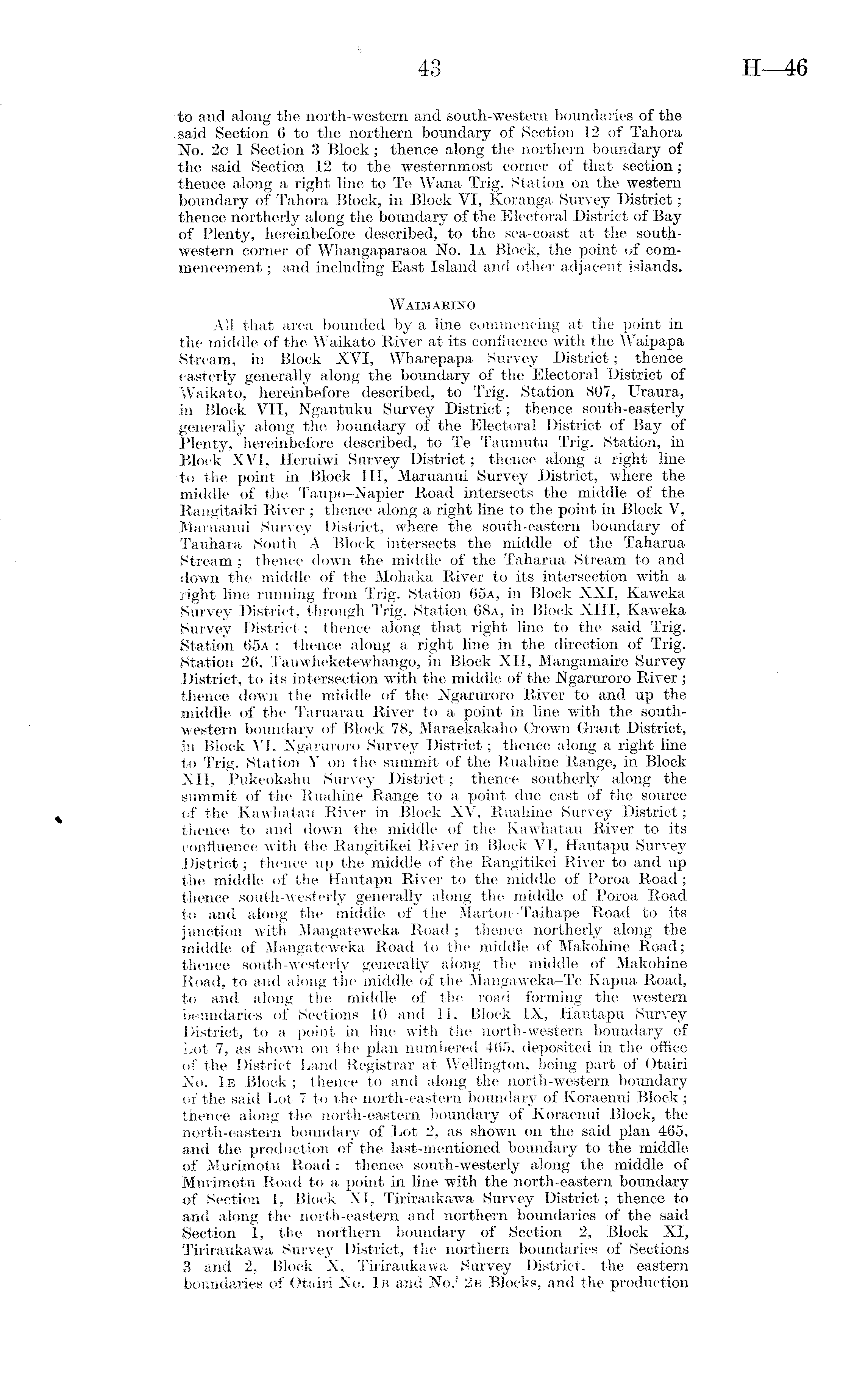 -to and along the north-western and south-western boundaries of the said Section 6 to the northern boundary of Section 12 of Tahora No. 2c 1 Section 3 Block; thence along the northern boundary of the said Section 12 to the westernmost corner of that section; thence along a right line to Te Wana Trig. Station on the western boundary of Tahora Block, in Block VI, Koranga Survey District; thence northerly along the boundary of the Electoral District of Bay •of Plenty, hereinbefore described, to the sea-coast at the southwestern corner of Whangaparaoa No. 1a Block, the point of commencement ; and including East Island and other adjacent islands. Waimaristo All that area bounded by a line commencing at the point in the middle of the Waikato River at its confluence with the Waipapa Stream, in Block XVI, Wharepapa Survey District; thence easterly generally along the boundary of the Electoral District of Waikato, hereinbefore described, to Trig. Station 807, Uraura, in Block VII, Ngautuku Survey District; thence south-easterly .generally along the boundary of the Electoral District of Bay of Plenty, hereinbefore described, to Te Taumutu Trig. Station, in Block XVI, Heruiwi Survey District; thence along a right line to the point in Block 111, Maruanui Survey District, where the middle of the Taupo-Napier Road intersects the middle of the Rangitaiki River ; thence along a right line to the point in Block V, Maruanui Survey District, where the south-eastern boundary of Tauhara South A Block intersects the middle of the Taharua Stream; thence down the middle of the Taharua Stream to and down the middle of the Mohaka River to its intersection with a right line running from Trig. Station 65a, in Block XXI, Kaweka .Survey District, through Trig. Station 68a, in Block XIII, Kaweka Survey District; thence along that right line to the said Trig. Station 65a ; thence along a right line in the direction, of Trig. Station 26, Tauwheketewhango, in Block XII, Mangamaire Survey District, to its intersection with the middle of the Ngaruroro River; thence down the middle of the Ngaruroro River to and up the middle of the Taruarau River to a point in line with the southwestern boundary of Block 78, Maraekakaho Crown Grant District, in Block VI, Ngaruroro Survey District; thence along a right line to Trig. Station Y on the summit of the Ruahine Range, in Block XII, Pukeokahu Survey District; thence southerly along the summit of the Ruahine Range to a point due east of the source of the Kawhatau River in Block XV, Ruahine Survey District;