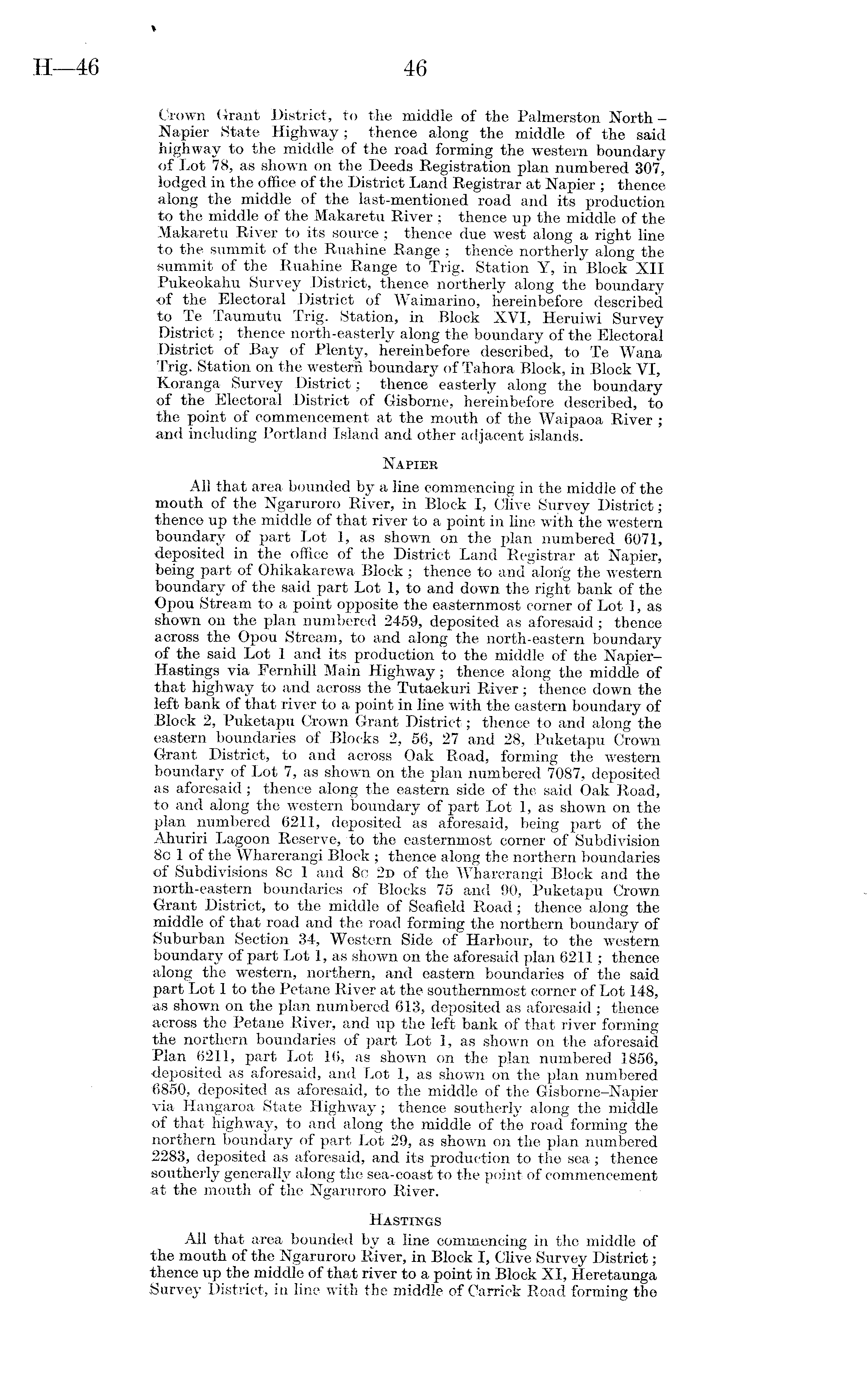 Crown Grant District, to the middle of the Palmerston North - Napier State Highway; thence along the middle of the said highway to the middle of the road forming the western boundary of Lot 78, as shown on the Deeds Registration plan numbered 307, lodged in the office of the District Land Registrar at Napier ; thence along the middle of the last-mentioned road and its production to the middle of the Makaretu River ; thence up the middle of the Makaretu River to its source; thence due west along a right line to the summit of the Ruahine Range ; thence northerly along the summit of the Ruahine Range to Trig. Station Y, in Block XII Pukeokahu Survey District, thence northerly along the boundary of the Electoral District of Waimarino, hereinbefore described to Te Taumutu Trig. Station, in Block XVI, Heruiwi Survey District; thence north-easterly along the boundary of the Electoral District of Bay of Plenty, hereinbefore described, to Te Wana Trig. Station on the western boundary of Tahora Block, in Block VI, Koranga Survey District; thence easterly along the boundary of the Electoral District of Gisborne, hereinbefore described, to the point of commencement at the mouth of the Waipaoa River ; and including Portland Island and other adjacent islands. Napier All that area bounded by a line commencing in the middle of the mouth of the Ngaruroro River, in Block I, Clive Survey District; thence up the middle of that river to a point in line with the western boundary of part Lot 1, as shown on the plan numbered 6071, deposited in the office of the District Land Registrar at Napier, being part of Ohikakarewa Block; thence to and along the western boundary of the said part Lot 1, to and down the right bank of the Opou Stream to a point opposite the easternmost corner of Lot 1, as shown on the plan numbered 2459, deposited as aforesaid; thence across the Opou Stream, to and along the north-eastern boundary of the said Lot 1 and its production to the middle of the NapierHastings via Fernhill Main Highway; thence along the middle of that highway to and across the Tutaekuri River; thence down the left bank of that river to a point in line with the eastern boundary of Block 2, Puketapu Crown Grant District; thence to and along the eastern boundaries of Blocks 2, 56, 27 and 28, Puketapu Crown Grant District, to and across Oak Road, forming the western boundary of Lot 7, as shown on the plan numbered 7087, deposited as aforesaid; thence along the eastern side of the said Oak Road, to and along the western boundary of part Lot 1, as shown on the plan numbered 6211, deposited as aforesaid, being part of the Ahuriri Lagoon Reserve, to the easternmost corner of Subdivision 8c 1 of the Wharerangi Block ; thence along the northern boundaries of Subdivisions 8c 1 and 8c 2d of the Wharerangi Block and the north-eastern boundaries of Blocks 75 and 90, Puketapu Crown Grant District, to the middle of Seafield Road; thence along the middle of that road and the road forming the northern boundary of Suburban Section 34, Western Side of Harbour, to the western boundary of part Lot 1, as shown on the aforesaid plan 6211; thence along the western, northern, and eastern boundaries of the said part Lot 1 to the Petane River at the southernmost corner of Lot 148, as shown on the plan numbered 613, deposited as aforesaid ; thence across the Petane River, and up the left bank of that river forming the northern boundaries of part Lot 1, as shown on the aforesaid Plan 6211, part Lot 16, as shown on the plan numbered 1856, deposited as aforesaid, and Lot 1, as shown on the plan numbered 6850, deposited as aforesaid, to the middle of the Gisborne—Napier via Hangaroa State Highway; thence southerly along the middle of that highway, to and along the middle of the road forming the northern boundary of part Lot 29, as shown on the plan numbered 2283, deposited as aforesaid, and its production to the sea; thence southerly generally along the sea-coast to the point of commencement at the mouth of the Ngaruroro River. Hastings All that area bounded by a line commencing in the middle of the mouth of the Ngaruroro River, in Block I, Clive Survey District; thence up the middle of that river to a point in Block XI, Heretaunga Survey District, in line with the middle of Carrick Road forming the