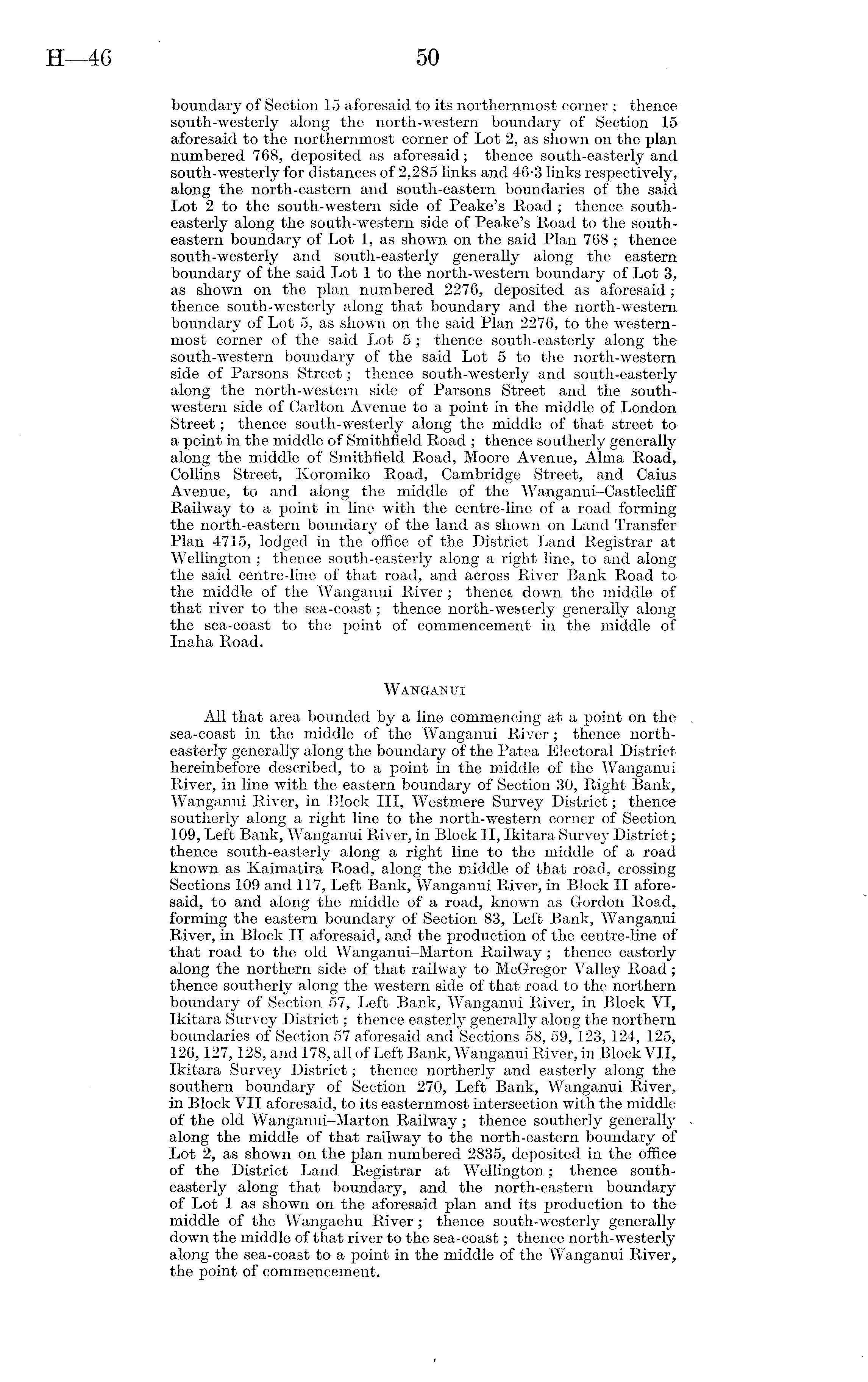 boundary of Section 15 aforesaid to its northernmost corner ; thence south-westerly along the north-western boundary of Section 15 aforesaid to the northernmost corner of Lot 2, as shown on the plan numbered 768, deposited as aforesaid; thence south-easterly and south-westerly for distances of 2,285 links and 46-3 links respectively,, along the north-eastern and south-eastern boundaries of the said Lot 2to the south-western side of Peake's Road; thence southeasterly along the south-western side of Peake's Road to the southeastern boundary of Lot 1, as shown on the said Plan 768 ; thence south-westerly and south-easterly generally along the eastern boundary of the said Lot 1 to the north-western boundary of Lot 3, as shown on the plan numbered 2276, deposited as aforesaid; thence south-westerly along that boundary and the north-western boundary of Lot 5, as shown on the said Plan 2276, to the westernmost corner of the said Lot 5; thence south-easterly along the south-western boundary of the said Lot 5 to the north-western side of Parsons Street; thence south-westerly and south-easterly along the north-western side of Parsons Street and the southwestern side of Carlton Avenue to a point in the middle of London Street; thence south-westerly along the middle of that street to a point in the middle of Smithfield Road ; thence southerly generally along the middle of Smithfield Road, Moore Avenue, Alma Road, Collins Street, Koromiko Road, Cambridge Street, and Caius Avenue, to and along the middle of the Wanganui-Castlecliff Railway to a point in line with the centre-line of a road forming the north-eastern boundary of the land as shown on Land Transfer Plan 4715, lodged in the office of the District Land Registrar at Wellington; thence south-easterly along a right line, to and along the said centre-line of that road, and across River Bank Road to the middle of the Wanganui River; thence down the middle of that river to the sea-co"ast; thence north-westerly generally along the sea-coast to the point of commencement in the middle of Inaha Road. Wanganui All that area bounded by a line commencing at a point on the sea-coast in the middle of the Wanganui River; thence northeasterly generally along the boundary of the Patea Electoral District hereinbefore described, to a point in the middle of the Wanganui River, in line with the eastern boundary of Section 30, Right Bank, Wanganui River, in Block 111, Westmere Survey District; thence southerly along a right line to the north-western corner of Section 109, Left Bank, Wanganui River, in Block 11, Ikitara Survey District; thence south-easterly along a right line to the middle of a road known as Kaimatira Road, along the middle of that road, crossing Sections 109 and 117, Left Bank, Wanganui River, in Block II aforesaid, to and along the middle of a road, known as Gordon Road, forming the eastern boundary of Section 83, Left Bank, Wanganui River, in Block II aforesaid, and the production of the centre-line of that road to the old Wanganui—Marton Railway; thence easterly along the northern side of that railway to McGregor Valley Road; thence southerly along the western side of that road to the northern boundary of Section 57, Left Bank, Wanganui River, in Block VI, Ikitara Survey District; thence easterly generally along the northern boundaries of Section 57 aforesaid and Sections 58, 59,123,124, 125, 126,127,128, and 178, all ofLeft Bank, Wanganui River, in Block VII, Ikitara Survey District; thence northerly and easterly along the southern boundary of Section 270, Left Bank, Wanganui River, in Block VII aforesaid, to its easternmost intersection with the middle of the old Wanganui-Marton Railway; thence southerly generally along the middle of that railway to the north-eastern boundary of Lot 2, as shown on the plan numbered 2835, deposited in the office of the District Land Registrar at Wellington; thence southeasterly along that boundary, and the north-eastern boundary of Lot 1 as shown on the aforesaid plan and its production to the middle of the Wangaehu River; thence south-westerly generally down the middle of that river to the sea-coast; thence north-westerly along the sea-coast to a point in the middle of the Wanganui River, the point of commencement.
