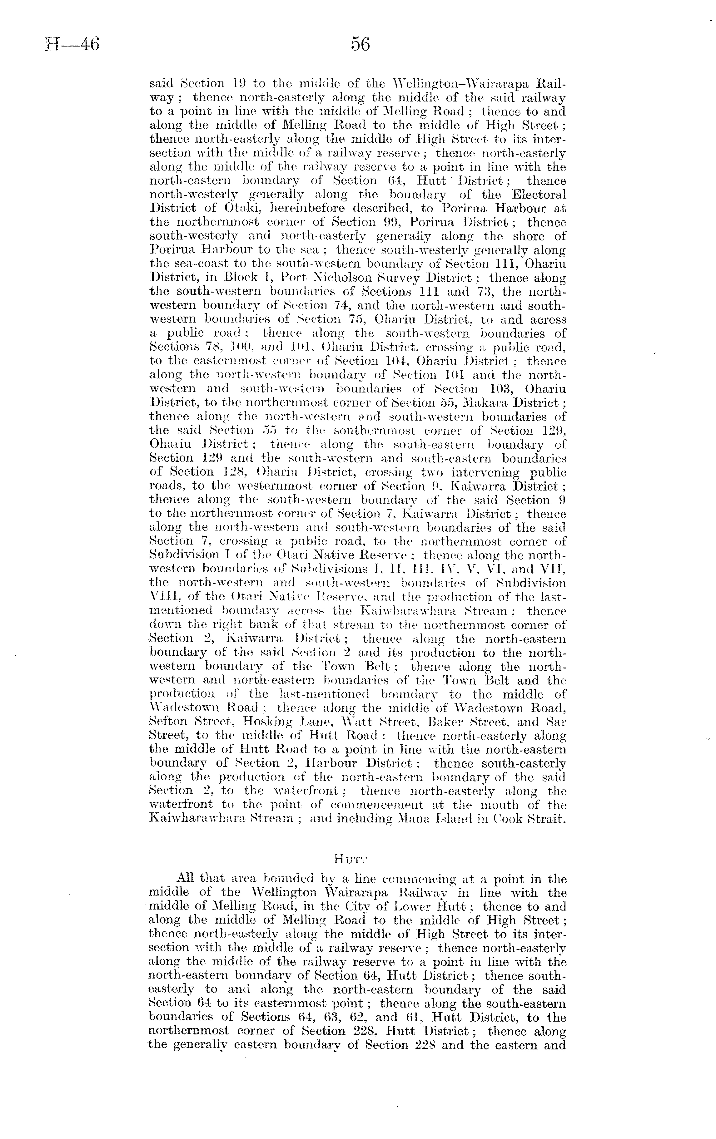 said Section 19 to the middle of the Wellington-Wairarapa Railway ; thence north-easterly along the middle of the said railway to a point in line with the middle of Melling Road; thence to and along the middle of Melling Road to the middle of High Street; thence north-easterly along the middle of High Street to its intersection with the middle of a railway reserve ; thence north-easterly along the middle of the railway reserve to a point in line with the north-eastern boundary of Section 64, Hutt" District; thence north-westerly generally along the boundary of the Electoral District of Otaki, hereinbefore described, to Porirua Harbour at the northernmost corner of Section 99, Porirua District; thence south-westerly and north-easterly generally along the shore of Porirua Harbour to the sea ; thence south-westerly generally along the sea-coast to the south-western boundary of Section 111, Ohariu District, in Block I, Port Nicholson Survey District; thence along the south-western boundaries of Sections 111 and 73, the northwestern boundary of Section 74, and the north-western and southwestern boundaries of Section 75, Ohariu District, to and across a public road; thence along the south-western boundaries of Sections 78, 100, and 101, Ohariu District, crossing a public road, to the easternmost corner of Section 104, Ohariu District; thence along the north-western boundary of Section 101 and the northwestern and south-western boundaries of Section 103, Ohariu District, to the northernmost corner of Section 55, Makara District; thence along the north-western and south-western boundaries of the said Section 55 to the southernmost corner of Section 129, Ohariu District; thence along the south-eastern boundary of Section 129 and the south-western and south-eastern boundaries of Section 128, Ohariu District, crossing two intervening public roads, to the westernmost corner of Section 9, Kaiwarra District; thence along the south-western boundary of the said Section 9 to the northernmost corner of Section 7, Kaiwarra District; thence along the north-western and south-western boundaries of the said Section 7, crossing a public road, to the northernmost corner of Subdivision I of the Otari Native Reserve ; thence along the northwestern boundaries of Subdivisions I, 11, 111, IV, V, VI, and VII, the north-western and south-western boundaries of Subdivision VIII, of the Otari Native Reserve, and the production of the lastmentioned boundary across the Kaiwharawhara Stream ; thence down the right bank of that stream to the northernmost corner of Section 2, Kaiwarra District; thence along the north-eastern boundary of the said Section 2 and its production to the northwestern boundary of the Town Belt; thence along the northwestern and north-eastern boundaries of the Town Belt and the production of the last-mentioned boundary to the middle of Wadestown Road ; thence along the middle of Wadestown Road, Sefton Street, Hosking Lane, Watt Street, Baker Street, and Sar Street, to the middle of Hutt Road; thence north-easterly along the middle of Hutt Road to a point in line with the north-eastern boundary of Section 2, Harbour District; thence south-easterly along the production of the north-eastern boundary of the said Section 2, to the waterfront; thence north-easterly along the waterfront to the point of commencement at the mouth of the Kaiwharawhara Stream ; and including Mana Island in Cook Strait.