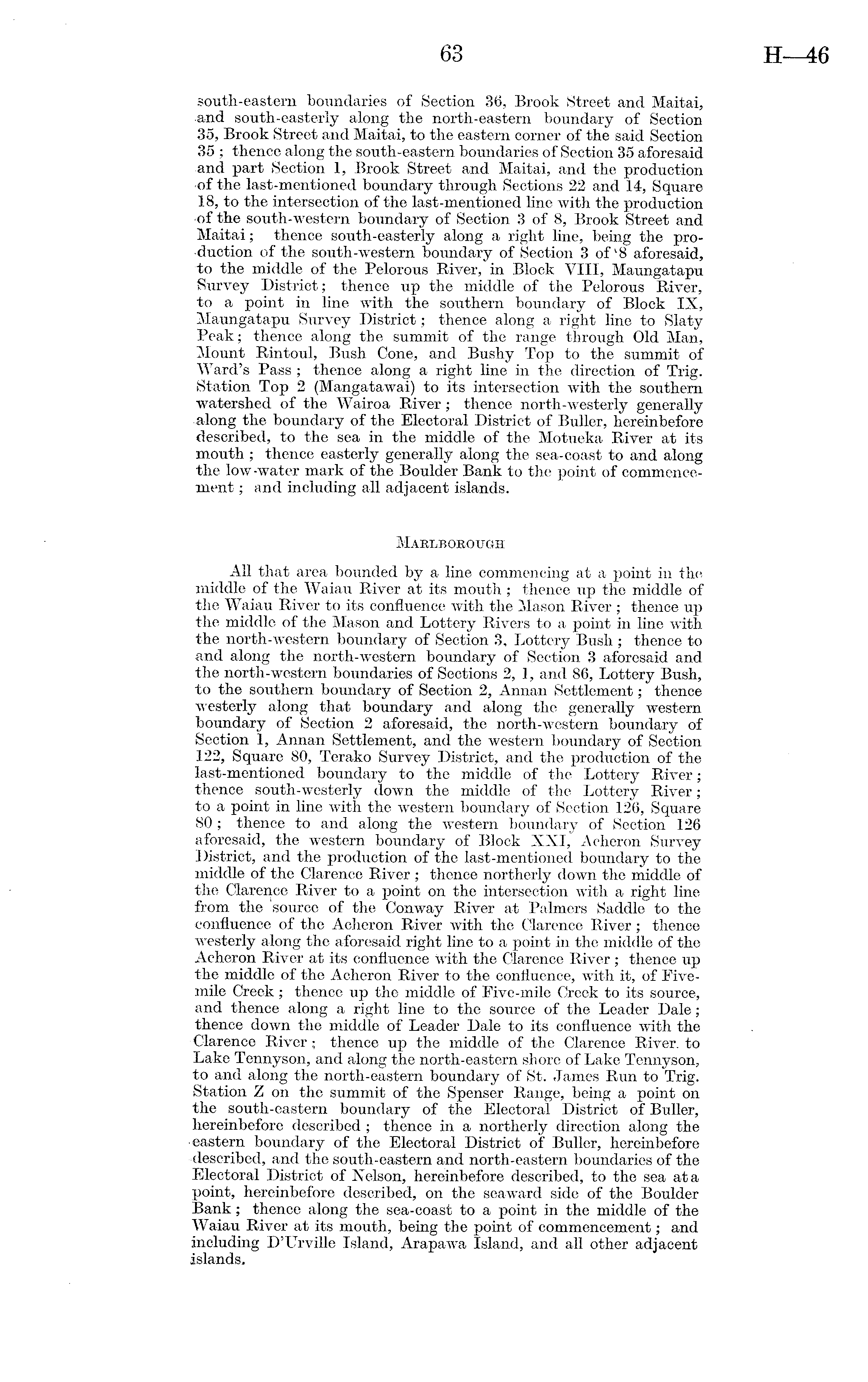 south-eastern boundaries of Section 36, Brook Street and Maitai, and south-easterly along the north-eastern boundary of Section 35, Brook Street and Maitai, to the eastern corner of the said Section 35 ; thence along the south-eastern boundaries of Section 35 aforesaid and part Section 1, Brook Street and Maitai, and the production of the last-mentioned boundary through Sections 22 and 14, Square 18, to the intersection of the last-mentioned line with the production of the south-western boundary of Section 3 of 8, Brook Street and Maitai; thence south-easterly along a right line, being the production of the south-western boundary of Section 3 of l 8 aforesaid, -to the middle of the Pelorous River, in Block VIII, Maungatapu Survey District; thence up the middle of the Pelorous River, to a point in line with the southern boundary of Block IX, Maungatapu Survey District; thence along a right line to Slaty Peak; thence along the summit of the range through Old Man, Mount Rintoul, Bush Cone, and Bushy Top to the summit of Ward's Pass ; thence along a right line in the direction of Trig. Station Top 2 (Mangatawai) to its intersection with the southern watershed of the Wairoa River; thence north-westerly generally along the boundary of the Electoral District of Buller, hereinbefore described, to the sea in the middle of the Motueka River at its mouth; thence easterly generally along the sea-coast to and along the low -water mark of the Boulder Bank to the point of commencement ; and including all adjacent islands.