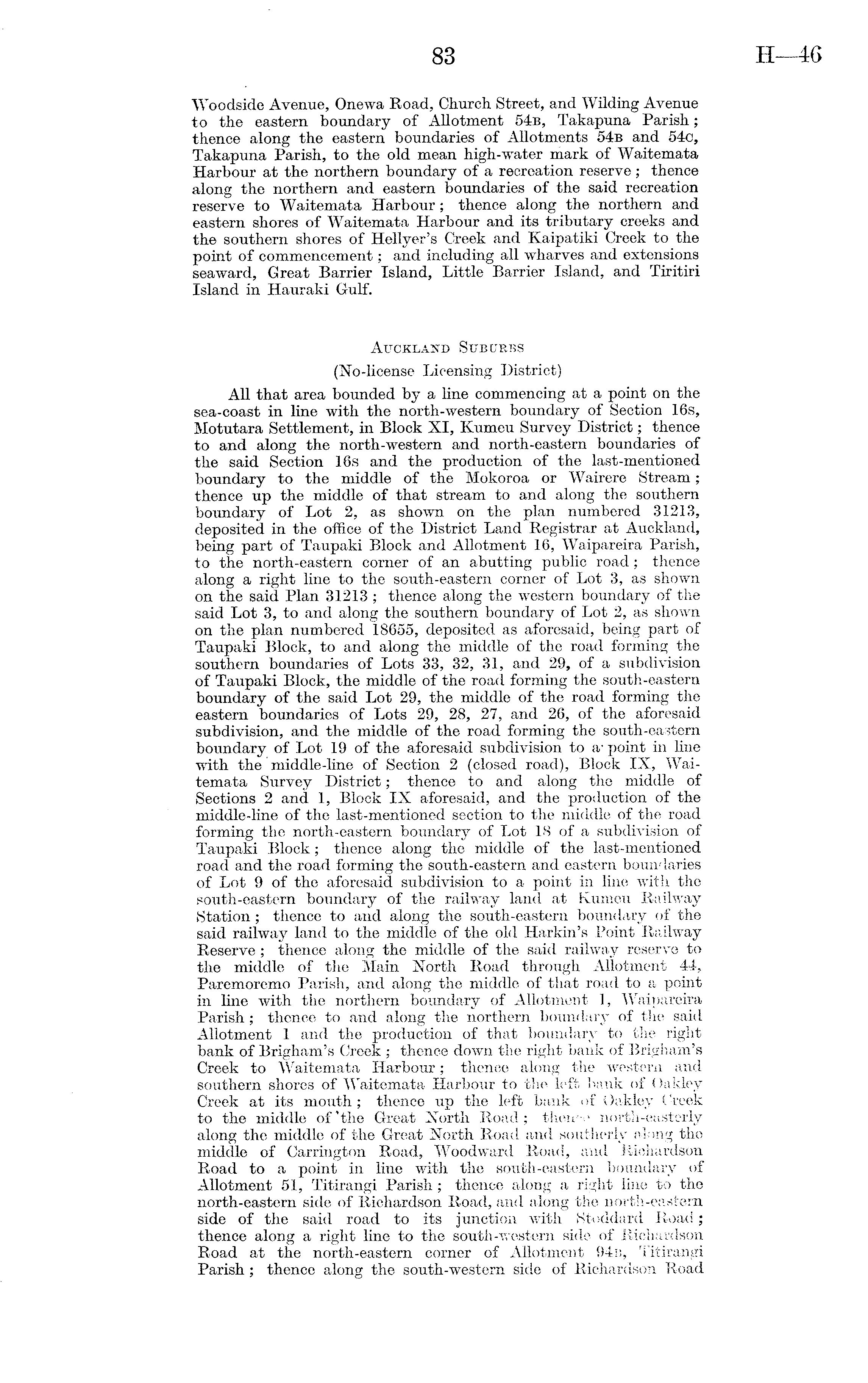 All that area bounded by a line commencing at a point on the sea-coast in line with the north-western boundary of Section 16s, Motutara Settlement, in Block XI, Kumeu Survey District; thence to and along the north-western and north-eastern boundaries of the said Section 16s and the production of the last-mentioned boundary to the middle of the Mokoroa or Wairere Stream; thence up the middle of that stream to and along the southern boundary of Lot 2, as shown on the plan numbered 31213, deposited in the office of the District Land Registrar at Auckland, being part of Taupaki Block and Allotment 16, Waipareira Parish, to the north-eastern corner of an abutting public road ; thence along a right line to the south-eastern corner of Lot 3, as shown on the said Plan 31213 ; thence along the western boundary of the said Lot 3, to and along the southern boundary of Lot 2, as shown on the plan numbered 18655, deposited as aforesaid, being part of Taupaki Block, to and along the middle of the road forming the southern boundaries of Lots 33, 32, 31, and 29, of a subdivision of Taupaki Block, the middle of the road forming the south-eastern boundary of the said Lot 29, the middle of the road forming the eastern boundaries of Lots 29, 28, 27, and 26, of the aforesaid subdivision, and the middle of the road forming the south-eastern boundary of Lot 19 of the aforesaid subdivision to a- point in line with the middle-line of Section 2 (closed road), Block IX, Waitemata Survey District; thence to and along the middle of Sections 2 and 1, Block IX aforesaid, and the production of the middle-line of the last-mentioned section to the middle of the road forming the north-eastern boundary of Lot 18 of a subdivision of Taupaki Block; thence along the middle of the last-mentioned road and the road forming the south-eastern and eastern boundaries of Lot 9 of the aforesaid subdivision to a point in line with the south-eastern boundary of the railway land at Kumeu Railway Station ; thence to and along the south-eastern boundary of the said railway land to the middle of the old Harkin's Point Railway Reserve ; thence along the middle of the said railway reserve to the middle of the Main North Road through Allotment 44, Paremoremo Parish, and along the middle of that road to a point in line with the northern boundary of Allotment 1, Waipareira Parish; thence to and along the northern boundary of the said Allotment 1 and the production of that boundary to the right bank of Brigham's Creek ; thence down the right bank of Brigham's Creek to Waitemata Harbour; thence along the western and southern shores of Waitemata Harbour to the left bank of Oakley Creek at its mouth ; thence up the left bank of Oakley Creek to the middle of 'the Great North Road; thence north-easterly along the middle of the Great North Road and southerly along the middle of Carrington Road, Woodward Road, and Richardson Road to a point in line with the south-eastern boundary of Allotment 51, Titirangi Parish; thence along a right line to the north-eastern side of Richardson Road, and along the north-eastern side of the said road to its junction with Stoddard Road; thence along a right line to the south-western side of Richardson Road at the north-eastern corner of Allotment 94b, Titirangi Parish; thence along the south-western side of Richardson Road