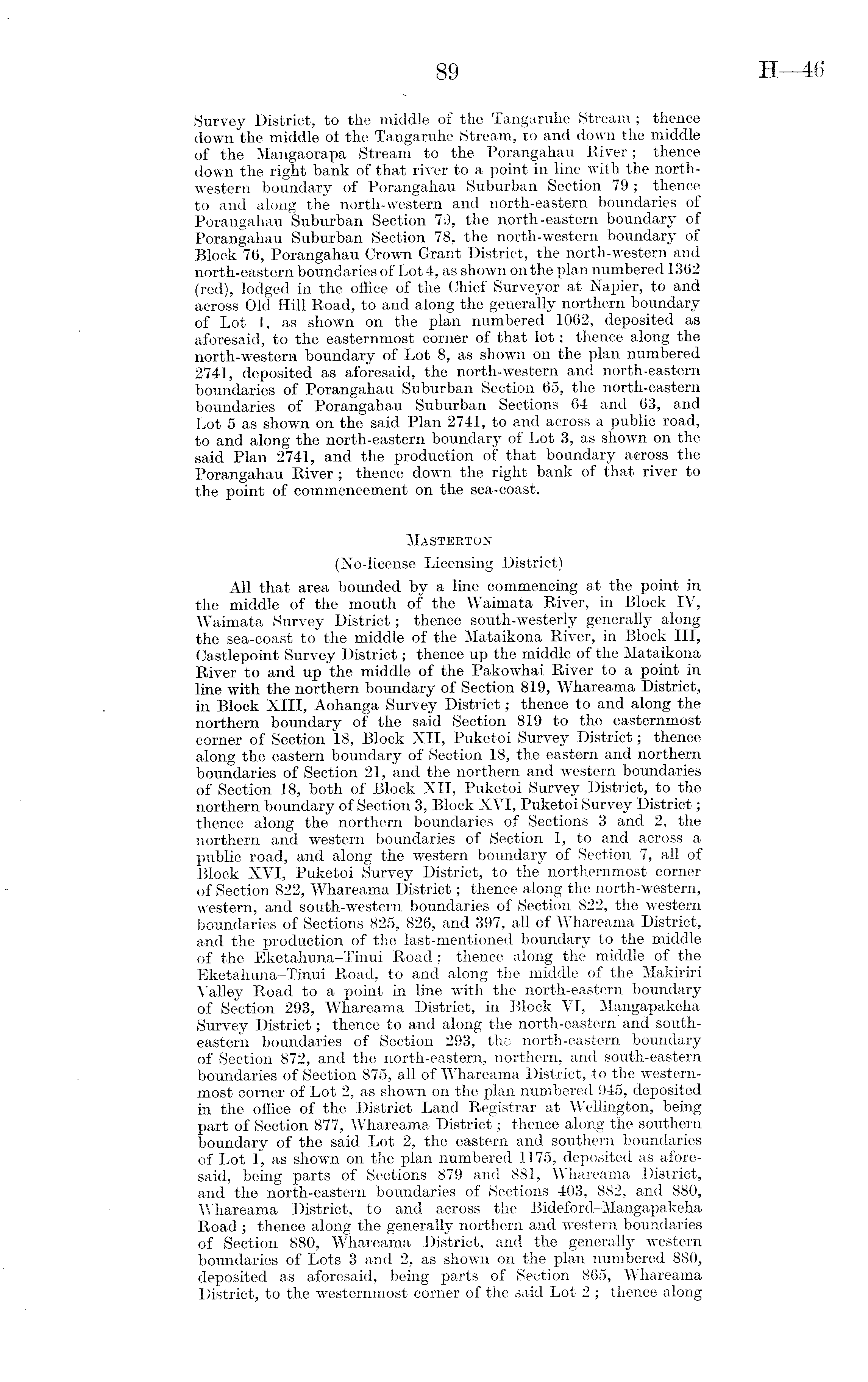 All that area bounded by a line commencing at the point in the middle of the mouth of the Waimata River, in Block IV, Waimata Survey District; thence south-westerly generally along the sea-coast to the middle of the Mataikona River, in Block 111, Castlepoint Survey District; thence up the middle of the Mataikona River to and up the middle of the Pakowhai River to a point in line with the northern boundary of Section 819, Whareama District, in Block XIII, Aohanga Survey District; thence to and along the northern boundary of the said Section 819 to the easternmost corner of Section 18, Block XII, Puketoi Survey District; thence along the eastern boundary of Section 18, the eastern and northern boundaries of Section 21, and the northern and western boundaries of Section 18, both of Block XII, Puketoi Survey District, to the northern boundary of Section 3, Block XVI, Puketoi Survey District; thence along the northern boundaries of Sections 3 and 2, the northern and western boundaries of Section 1, to and across a public road, and along the western boundary of Section 7, all of Block XVI, Puketoi Survey District, to the northernmost corner of Section 822, Whareama District; thence along the north-western, western, and south-western boundaries of Section 822, the western boundaries of Sections 825, 826, and 397, all of Whareama District, and the production of the last-mentioned boundary to the middle of the Eketahuna-Tinui Road; thence along the middle of the Eketahuna-Tinui Road, to and along the middle of the Makiriri Valley Road to a point in line with the north-eastern boundary of Section 293, Whareama District, in Block VI, Mangapakeha Survey District; thence to and along the north-eastern and southeastern boundaries of Section 293, the north-eastern boundary of Section 872, and the north-eastern, northern, and south-eastern boundaries of Section 875, all of Whareama District, -to the westernmost corner of Lot 2, as shown on the plan numbered 945, deposited in the office of the District Land Registrar at Wellington, being part of Section 877, Whareama District; thence along the southern boundary of the said Lot 2, the eastern and southern boundaries of Lot 1, as shown on the plan numbered 1175, deposited as aforesaid, being parts of Sections 879 and 881, Whareama District, and the north-eastern boundaries of Sections 403, 882, and 880, Whareama District, to and across the Bideford-Mangapakeha Road ; thence along the generally northern and western boundaries of Section 880, Whareama District, and the generally western boundaries of Lots 3 and 2, as shown on the plan numbered 880, deposited as aforesaid, being parts of Section 865, Whareama District, to the westernmost corner of the said Lot 2 ; thence along